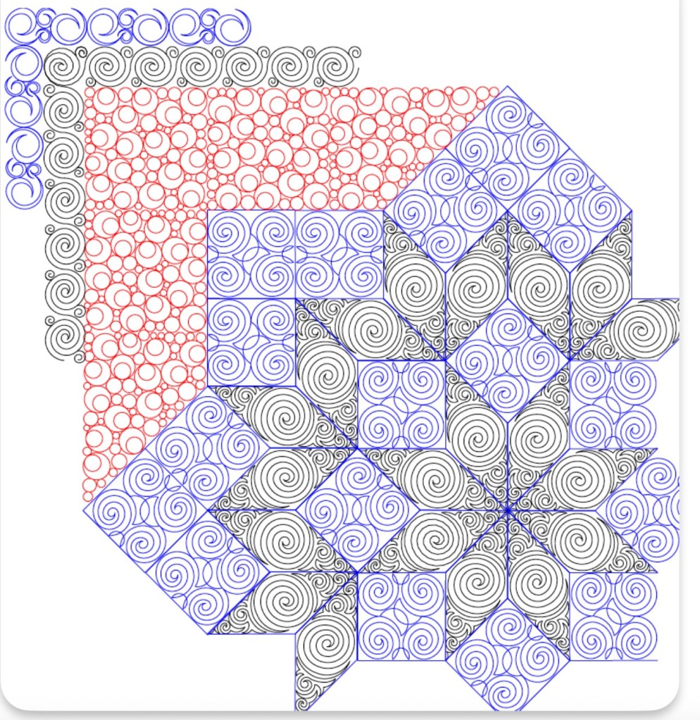 I did find a specific quilting set that was made for this quilt at Wasatch Quilting. I was looking for a diamond or swirling pantograph when I came upon it. I am hoping that it is dense enough, but not too much backtracking. It is similar to the Gravity quilt I quilted a while ago. I am thinking of using a variegated purple and green thread to break up the black fields. The backing is a green leafy print on white, I want to stay with a light color bobbin.