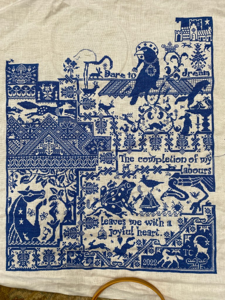 Stitching on the Pilgrim has been taking most of my sewing room time. In my last post I was considering starting another large sampler, Heaven and Nature (a Teresa Kogurt design). I got it all kitted up and had sat down to stitch, as I was removing the hoop from Pilgrim, I thought to myself, maybe just finish up this motif…then it became this section, then page. I have less than two pages left to finish, I want to do that more than start a new piece. In the photos below, the one on the left is from October 2022, and todays is on the right. My ulterior motive is that once pilgrim is done, then H&N can become my new “big” project, and I can start a new small(er) one too. Win-Win!