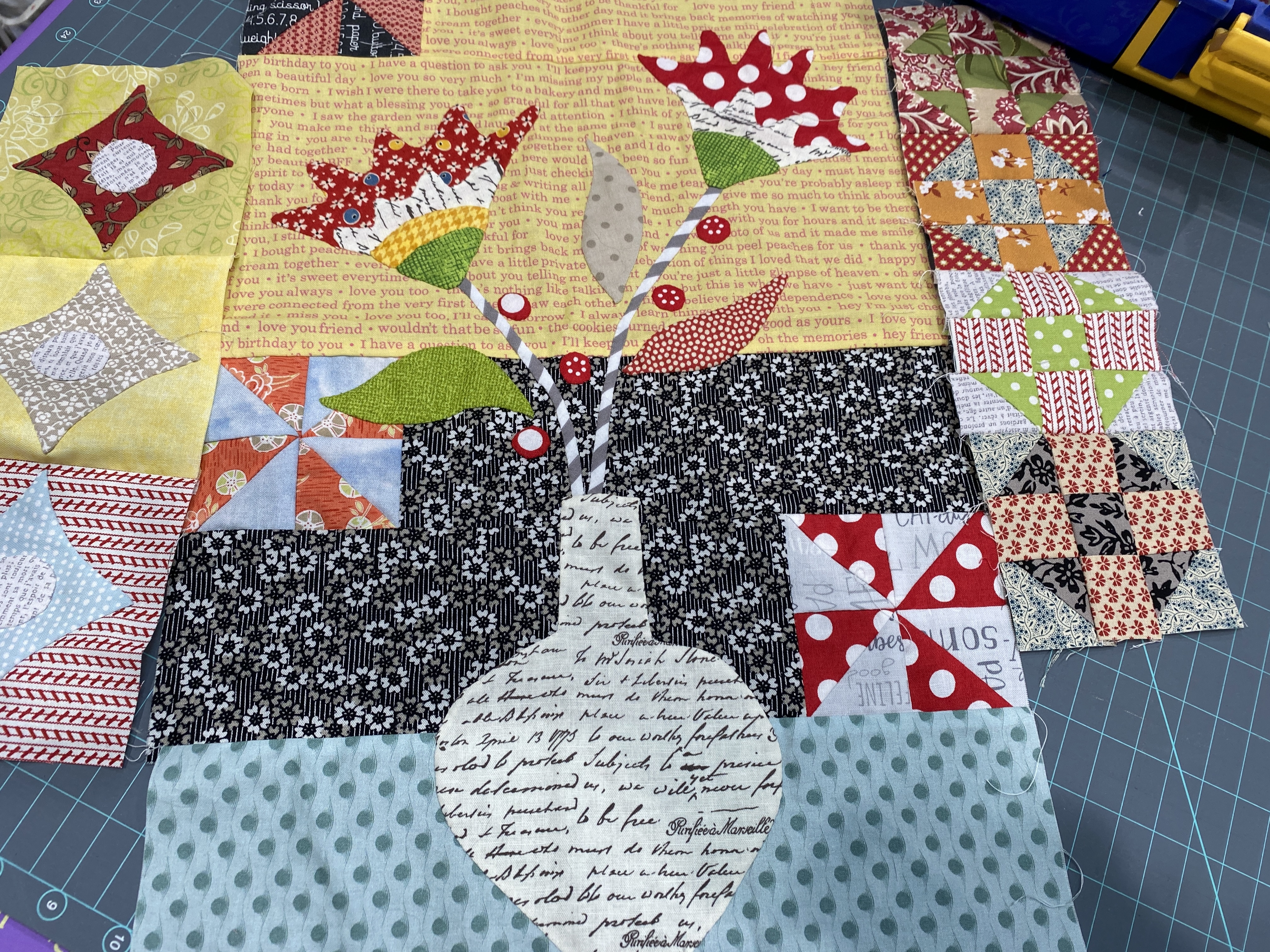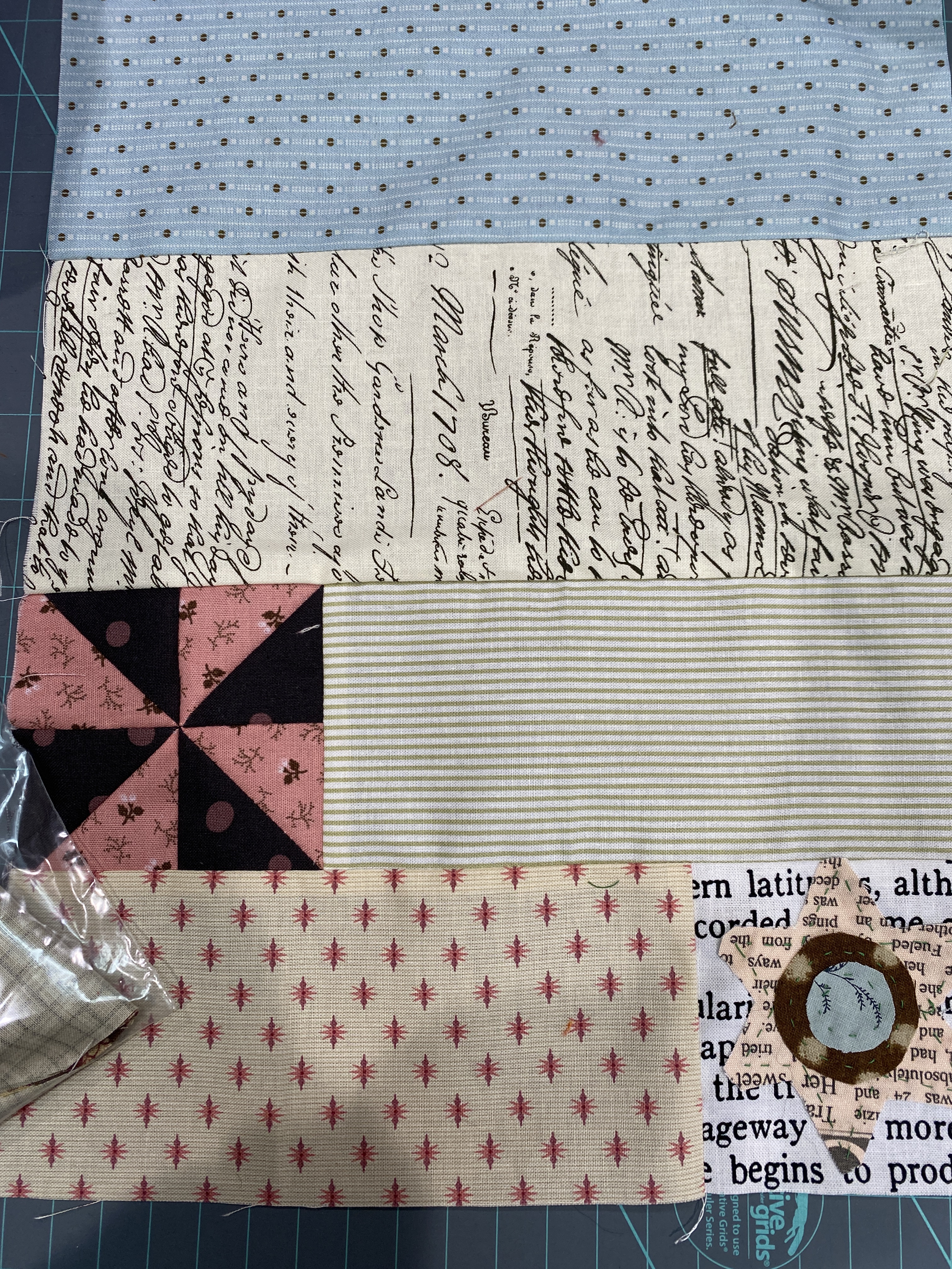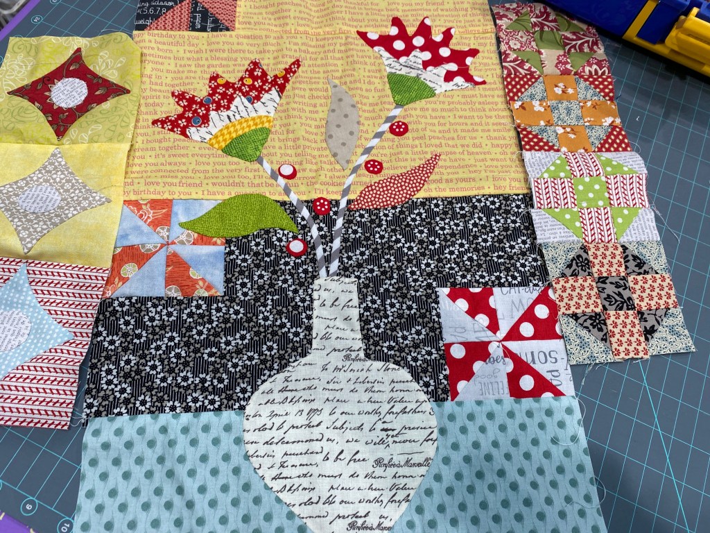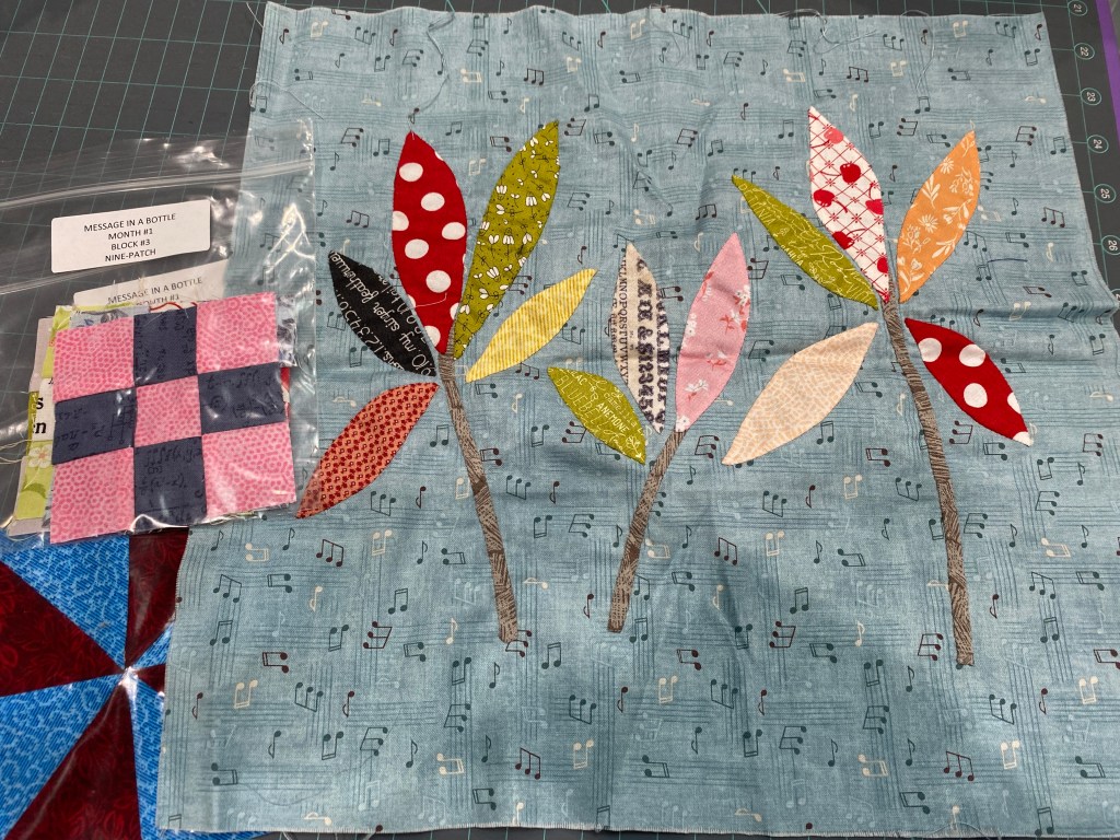 This week was a handwork week, although I did turn on the machine a few times. I worked on the Message in a Bottle BOM, completed month two and set up month three. I got the fabric kit for month seven in the mail yesterday, I am very behind. Each monthly section has a main appliqué block and a few 3 ½ inch blocks for fillers. Month two and three have large pieced backgrounds behind the appliqué. I am glad that the finished size is 52″ square, as there are so many pieces, and anything larger would be too much.