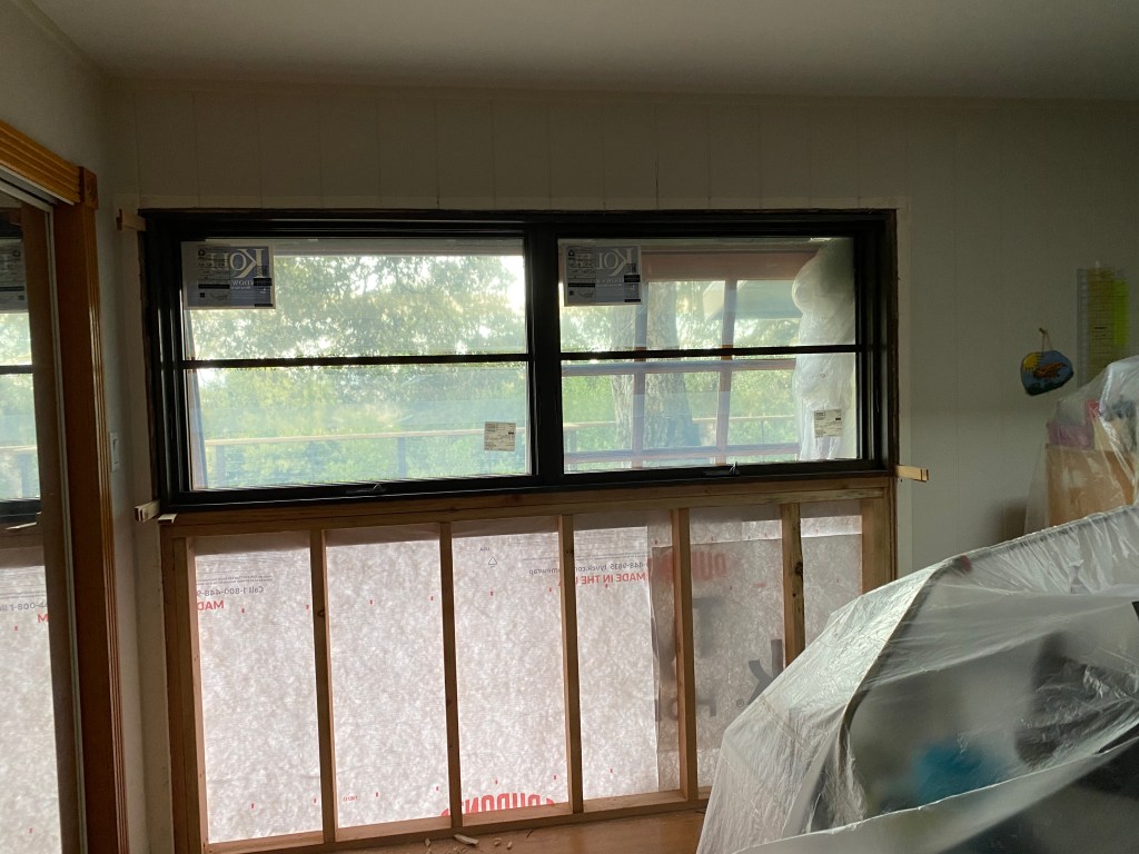 Last week work was started on the replacing of a sliding door with a window in the sewing room. The workmen carefully covered everything in there with large sheets of plastic. I am grateful that the dust and such won’t be all over my stash, but I can’t get to anything in there.