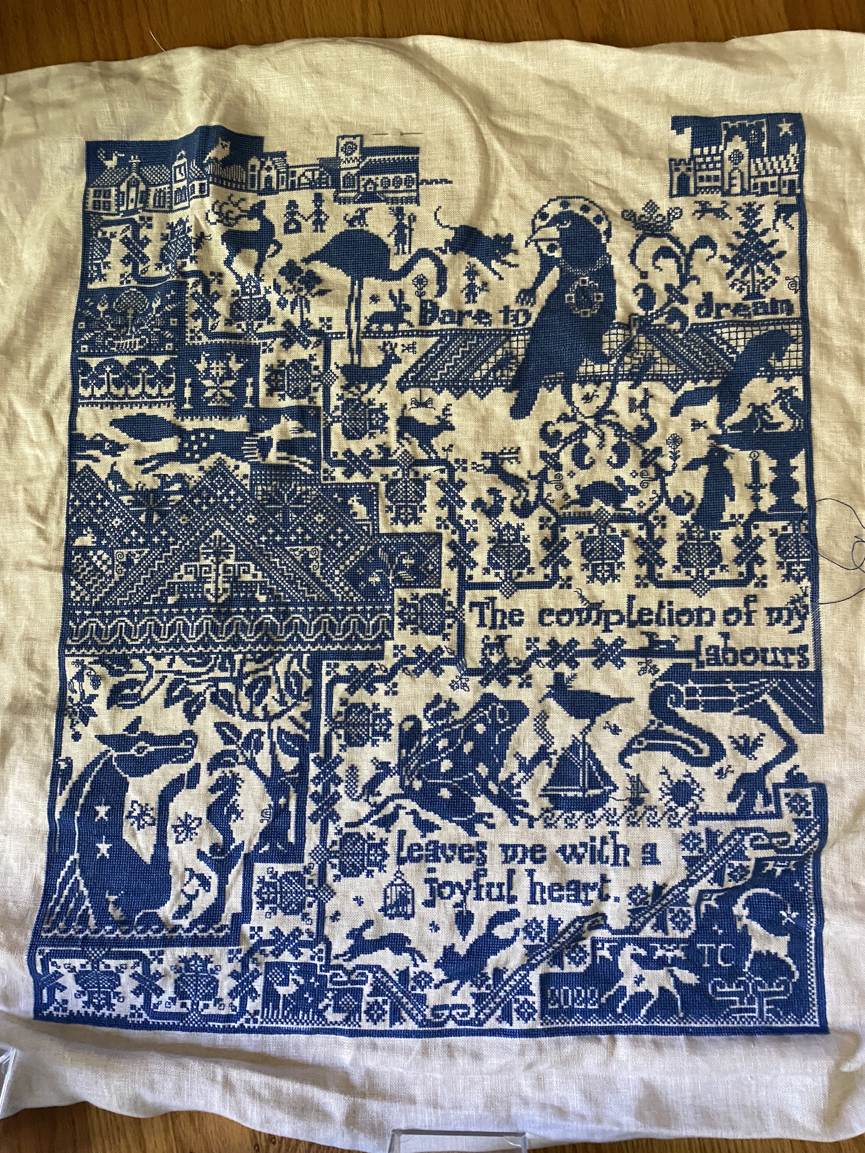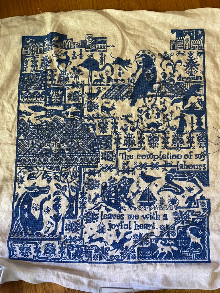I have been steadily making headway on the Pilgrim though. I finished page 1, the upper left corner, most of page 2, and pages 3 and 4 are about 70% done. Most of the stitching is the “sky” above the houses, this piece has a 305×367 stitch count. I was checking to see if I missed any motifs last night and I found I forgot a squirrel (?!?) and a butterfly under the crow. I might just leave the squirrel for last.