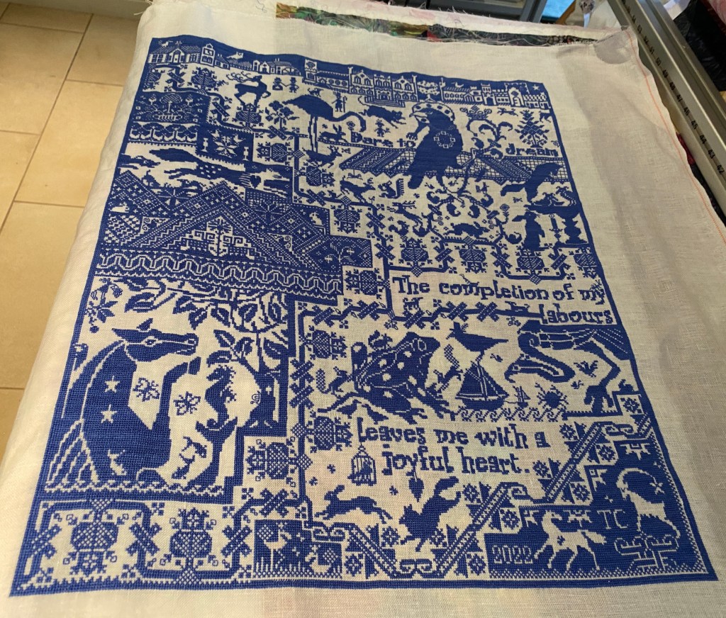 Started on January 24th 2022, on 32 count lugana using 12wt Aurifil 6738 Peacock blue (356 yards). I used about 1 and ½ spools. Started on scroll frame, but switched to hoop with stand because it was easier to start and tie off threads.