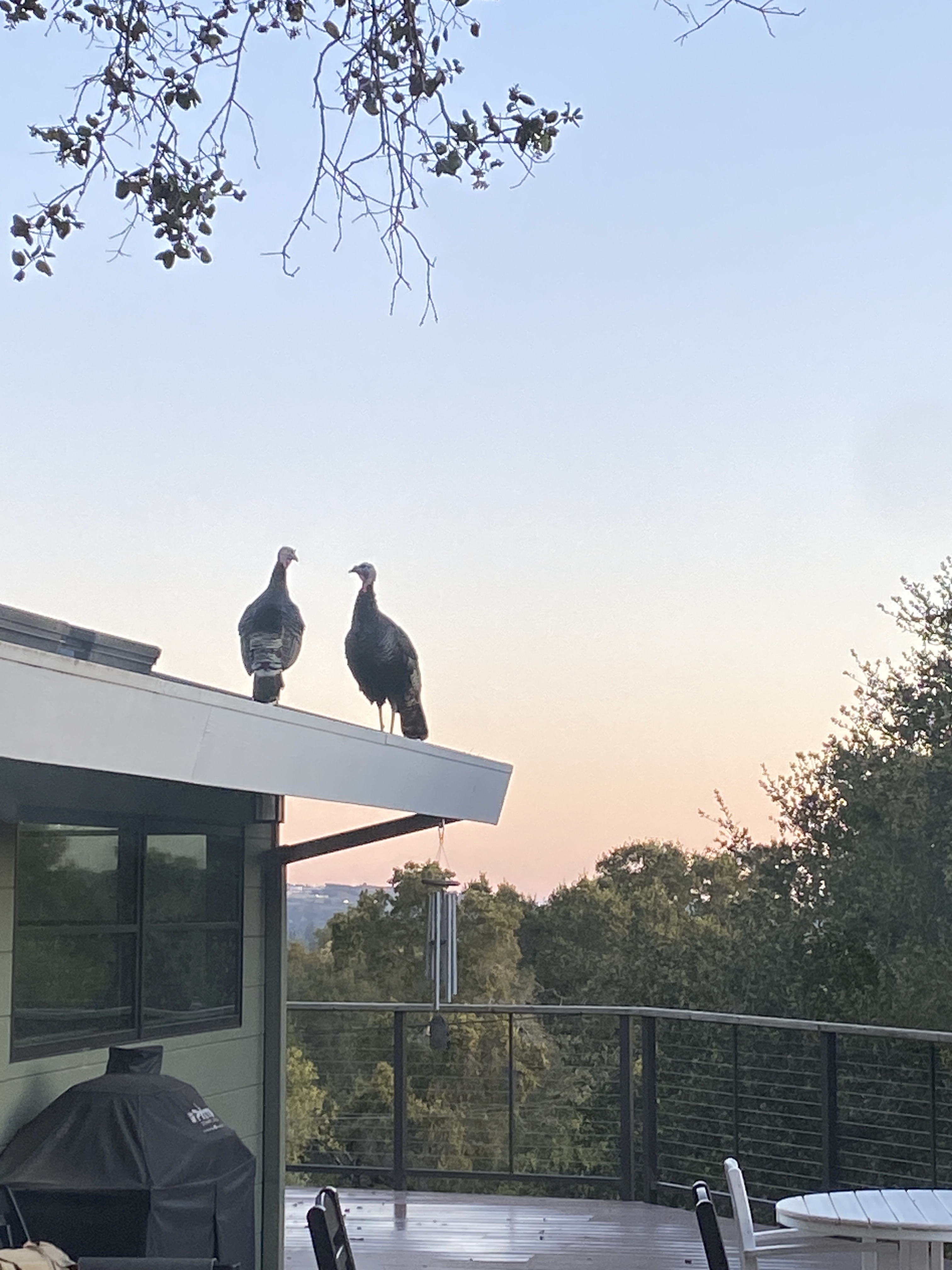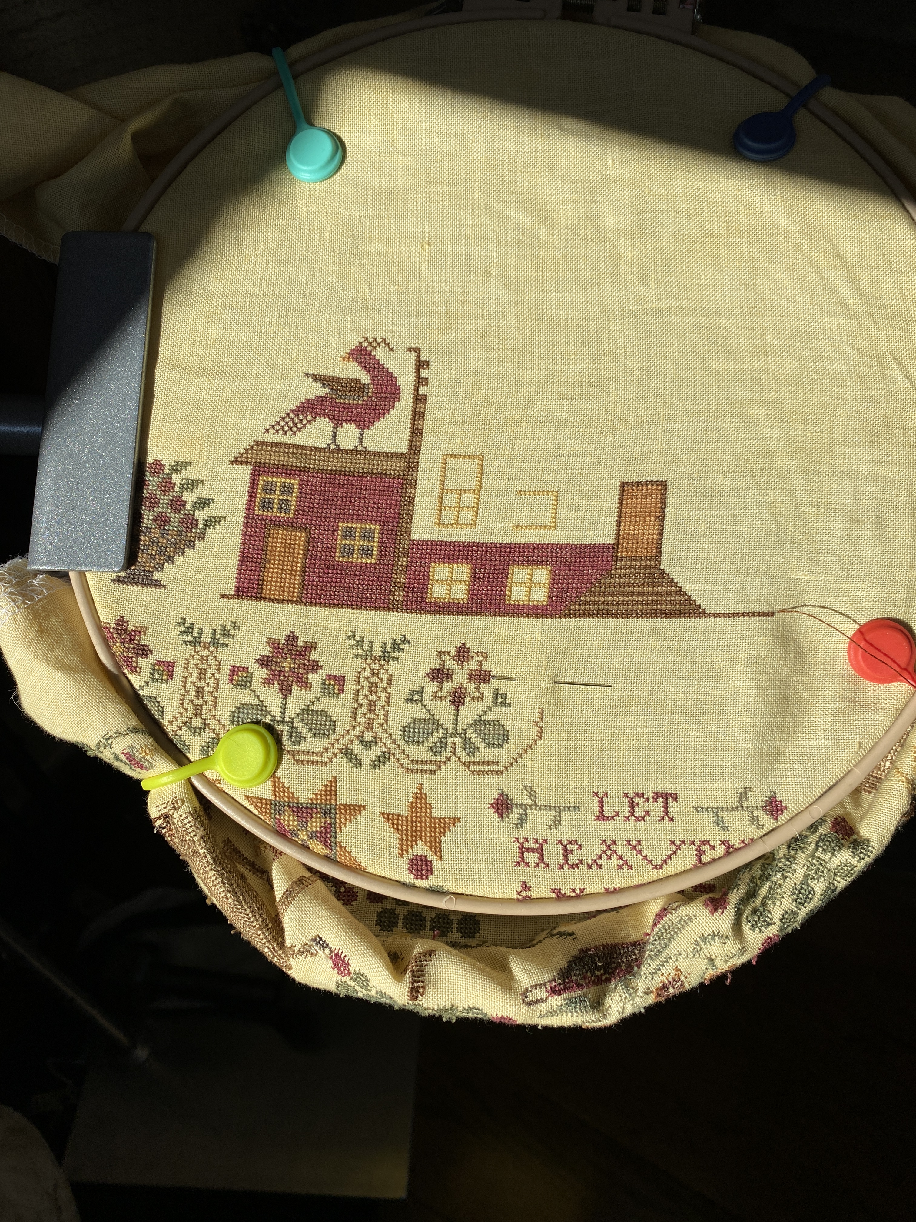 The current cross stitch project, Heaven and Nature, got a few more motifs this week. I worked on the house steps and door, the flower border and a bird on the roof. Speaking of, we were awoken this morning by the sound of these two landing on the roof, not the usual scampering squirrel sounds.