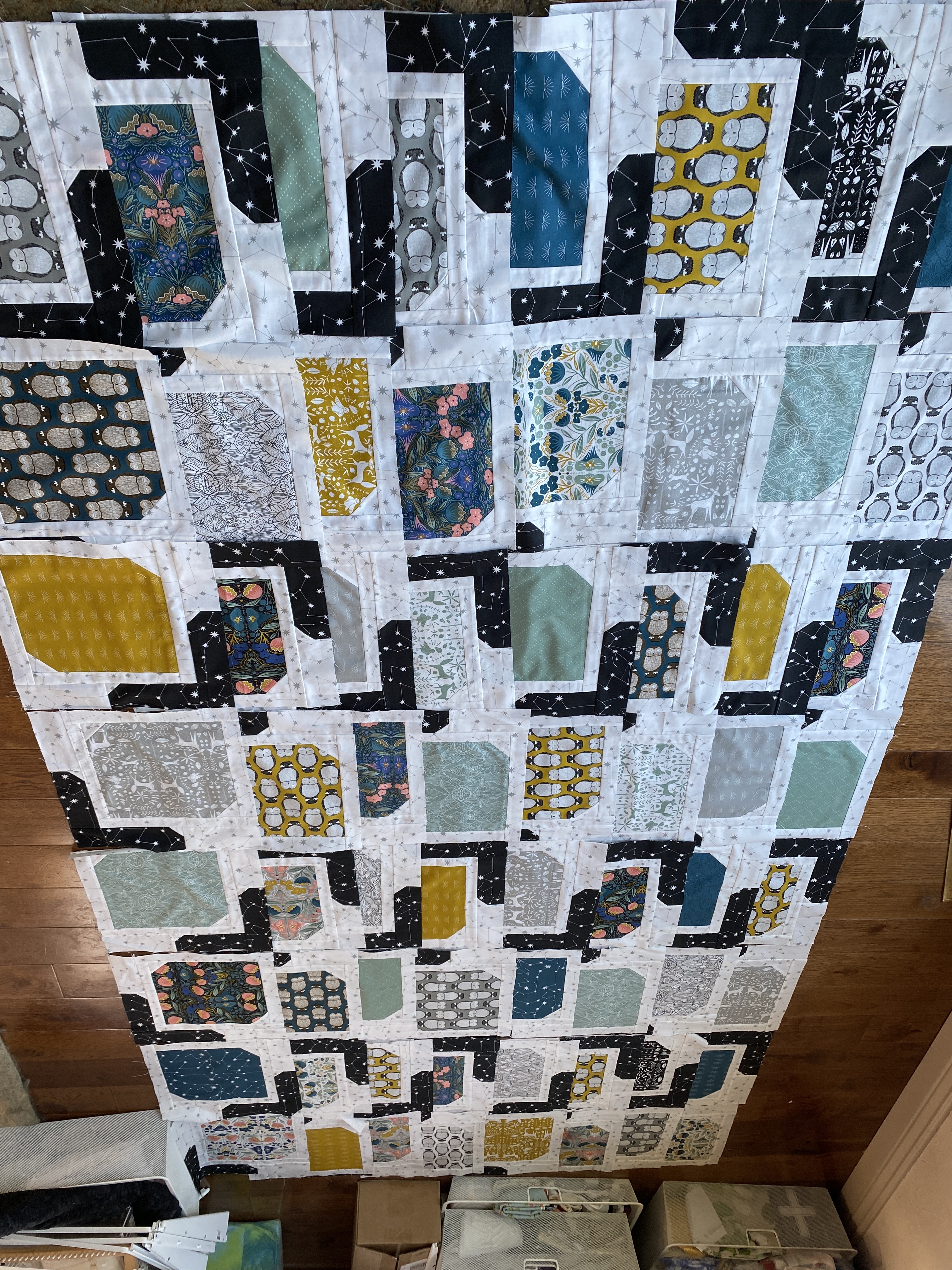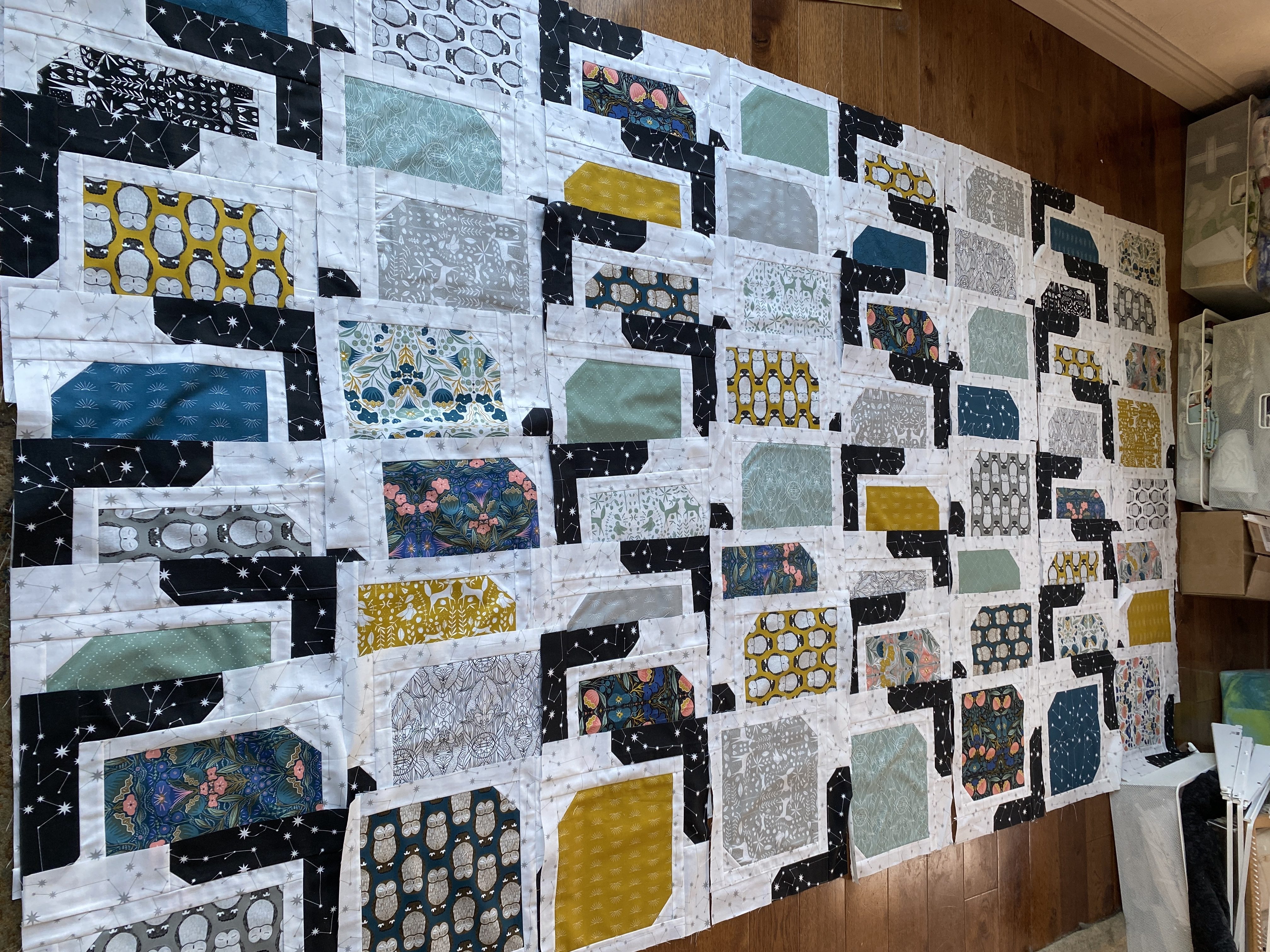I am ready to sew a bunch this week though. Before I left I had finished all the blocks for the king size ‘Dinner Party’ quilt. I laid them all out on the design floor yesterday, and discovered I had 66, two extra.