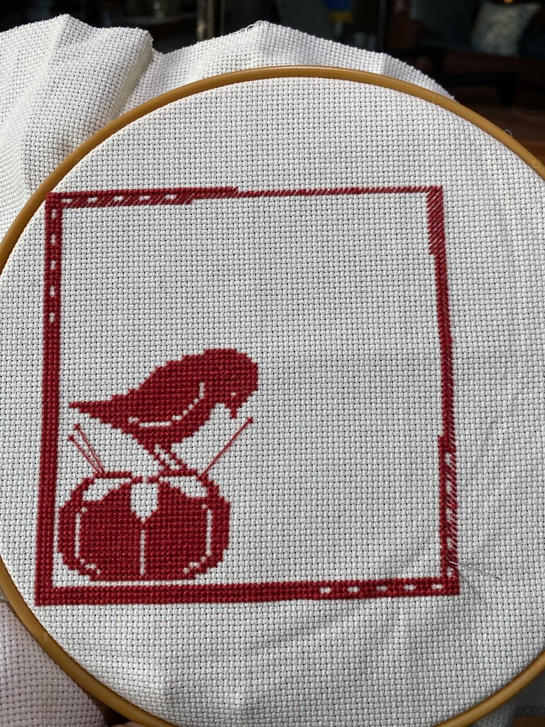 I brought a small cross stitch piece with me, the red-work “Gathering Stitches” project. Didn’t get much done on it, lack of good lighting and time. On the flight home, I was in a middle seat on a very full plane. I ended up listening to my book for 4 hours. I may have dropped off to sleep a few times, I am hoping I didn’t snore lol.