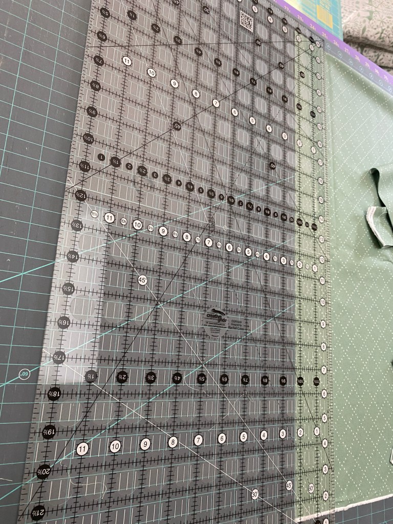 I finished a quilt top and a backing this week, the Dwellings quilt and the backing for the Dinner plate quilt. The dinner plate is a king size, 110 x 110, so there was piecing involved, lots of long seams and cutting off of selvages. I have a new ruler by Creative Grids, it’s called “the big one” or something like that, it is 24″ x 12 ½”. It’s a nice stable surface to cut with, it doesn’t move around and holds the fabric still with the special dots they put on it.