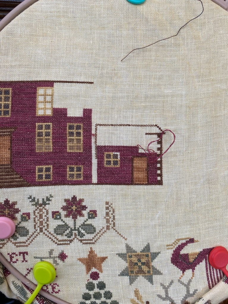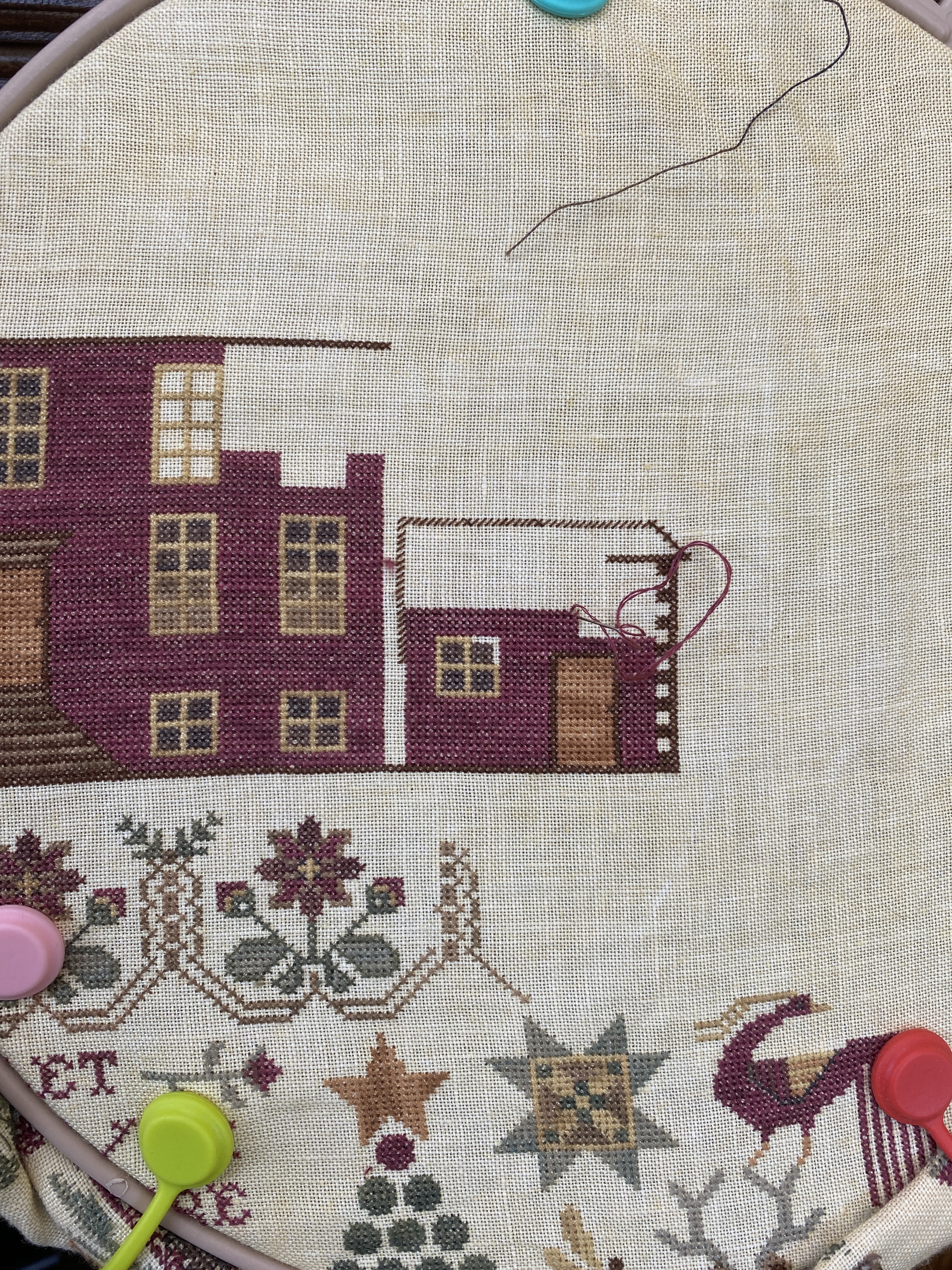 Working on the Heaven and Nature piece almost nightly. There are a lot of bricks in this house. The door has 190 stitches in it, gotta love 40 count linen.