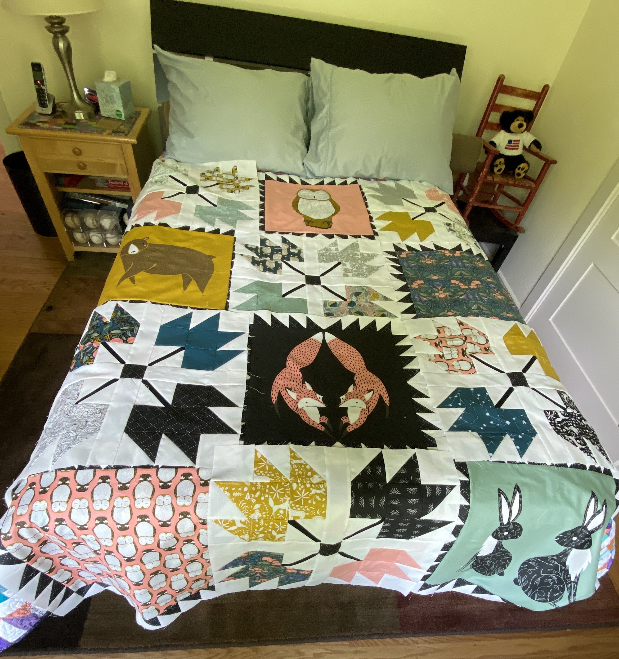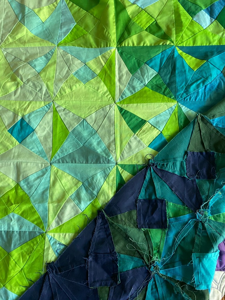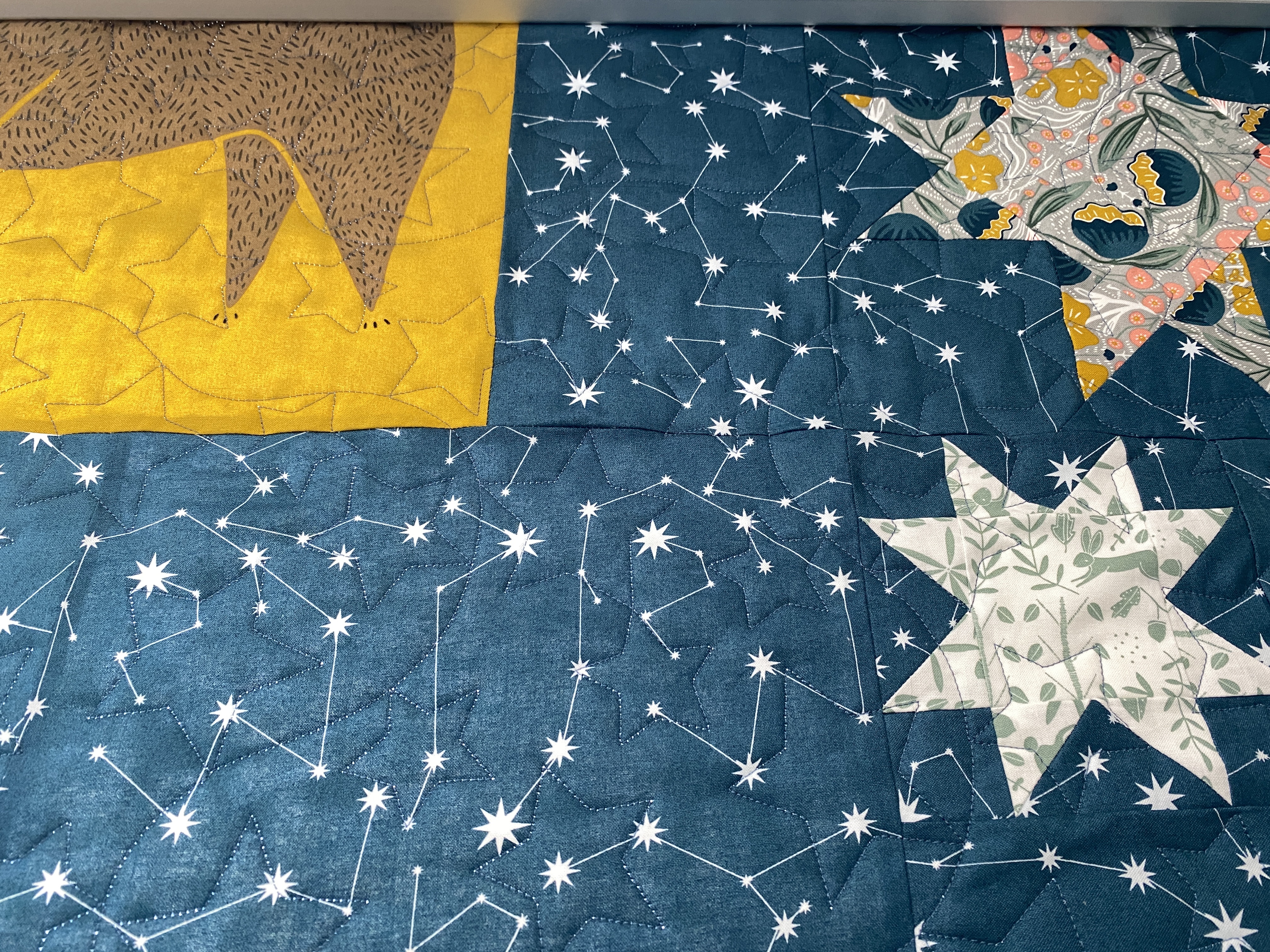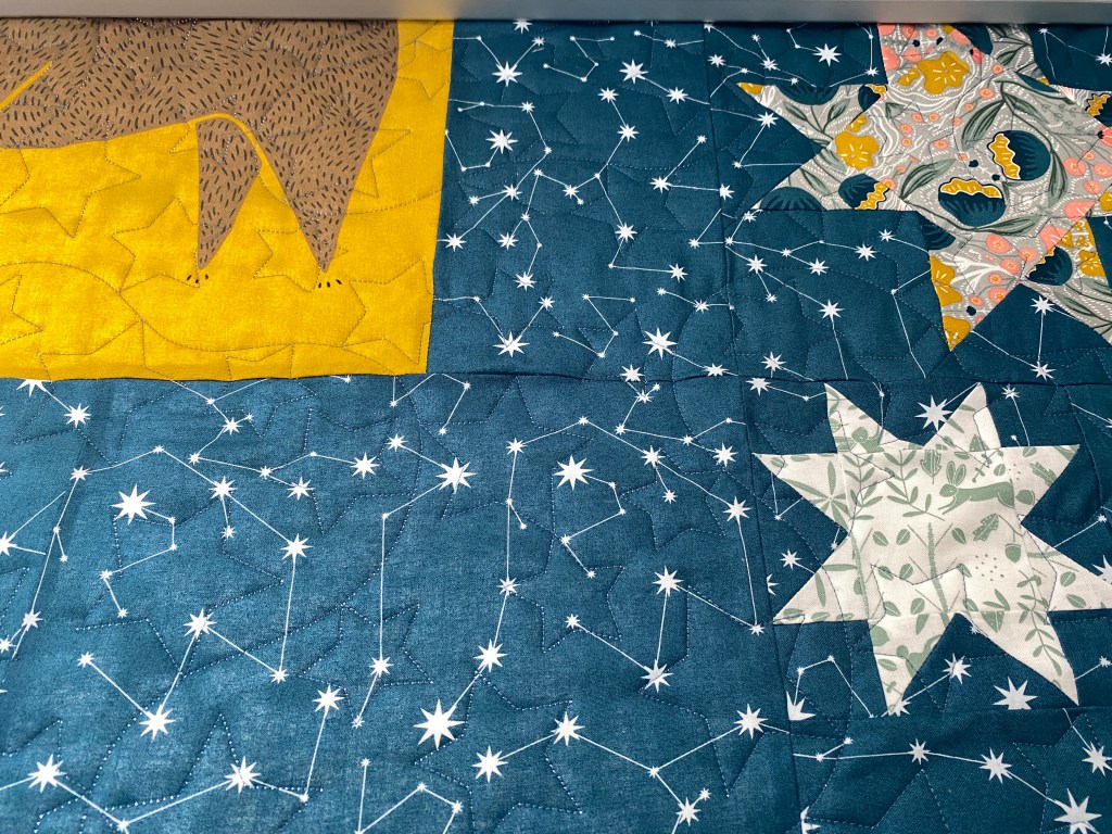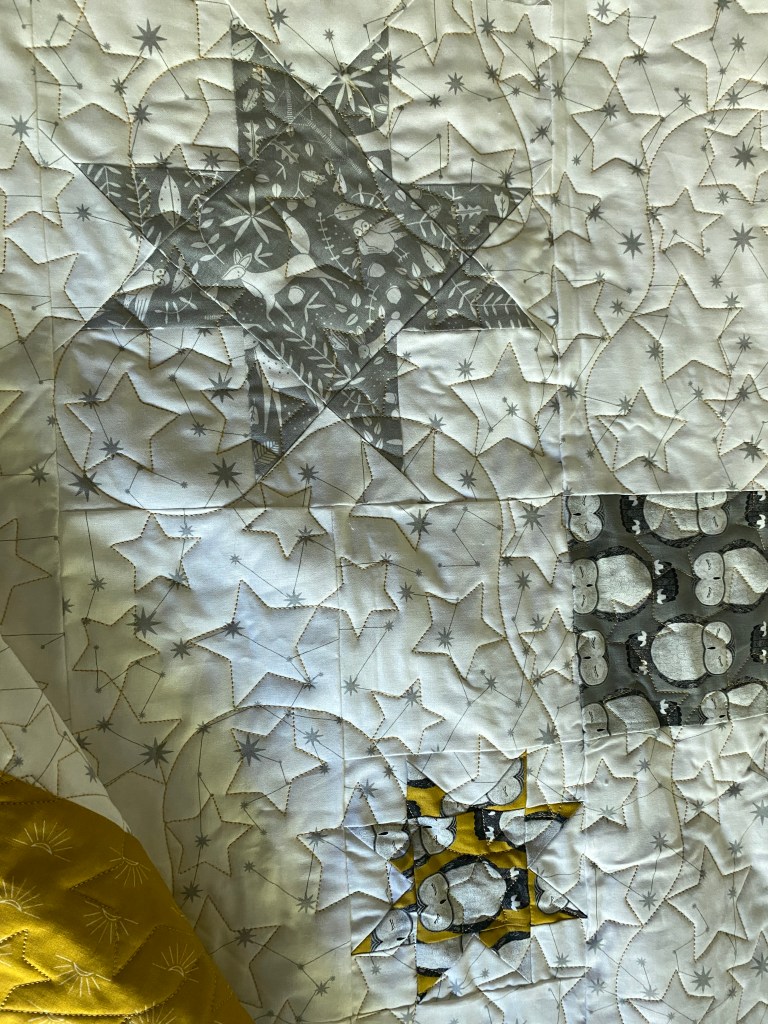 It’s almost Summer, and I am almost done quilting the second Crescent quilt. The first one (white background), was a full size, this one (blue background) is queen. I chose a star pattern for them, it is a little dense, but I think it works with all the background negative space. For the blue one I enlarged the design a bit, hoping it would stitch out a bit faster. I went from 12 inches high to 14, but I still have ten rows at 30 minutes a row. I was hoping to get it done this weekend, but realistically, Monday.