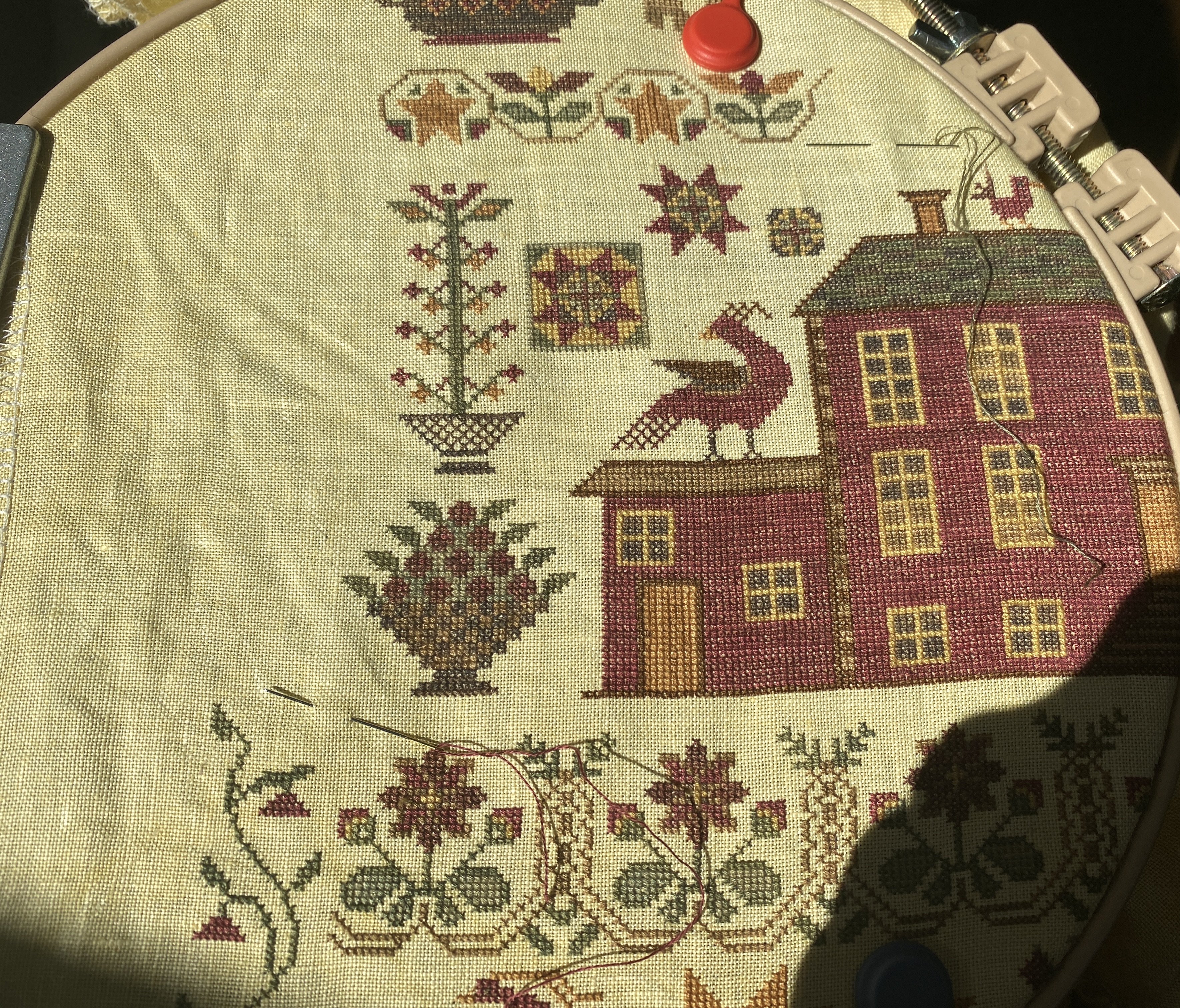 I am stitching away on the Heaven and Nature piece. There are lots of little things to stitch, and I can do a motif in an hour or two. I was thinking that I should add my initial and the year somewhere, maybe near the house. There is a bunch of random square motifs near the roof and some space up there.