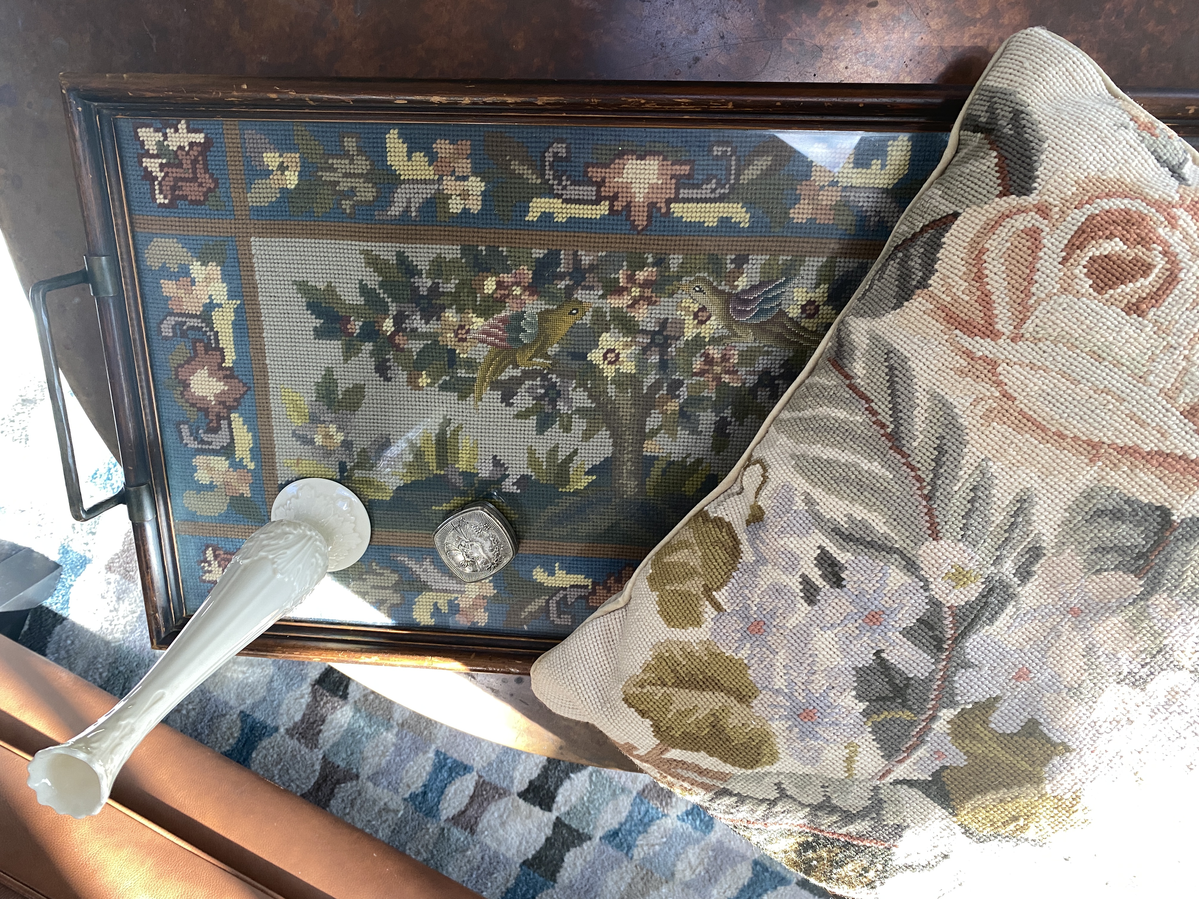 Last week I was passing by an estate sale and dropped in for a look. It’s not like I need anything, but you never know what someone has in their garage. This was a sale for someone who was downsizing and most of the items dated back to the 60’s and possibly older. Beautiful china sets, silver flatware, vases, and collectables. I think the woman was a crafter too, as there was a nice looking treadle machine and a bunch of lace and trim. What struck my eye was a serving tray with needlework inserted in it under glass. I couldn’t leave it, I paid twelve dollars for it, and rescued a floral pillow for six dollars. It reminded me of my last post about what happens to someones treasures when they are gone. I also got a lovely Lenox bud vase, a charming 1920’s rouge compact, and a few glass Christmas ornaments.