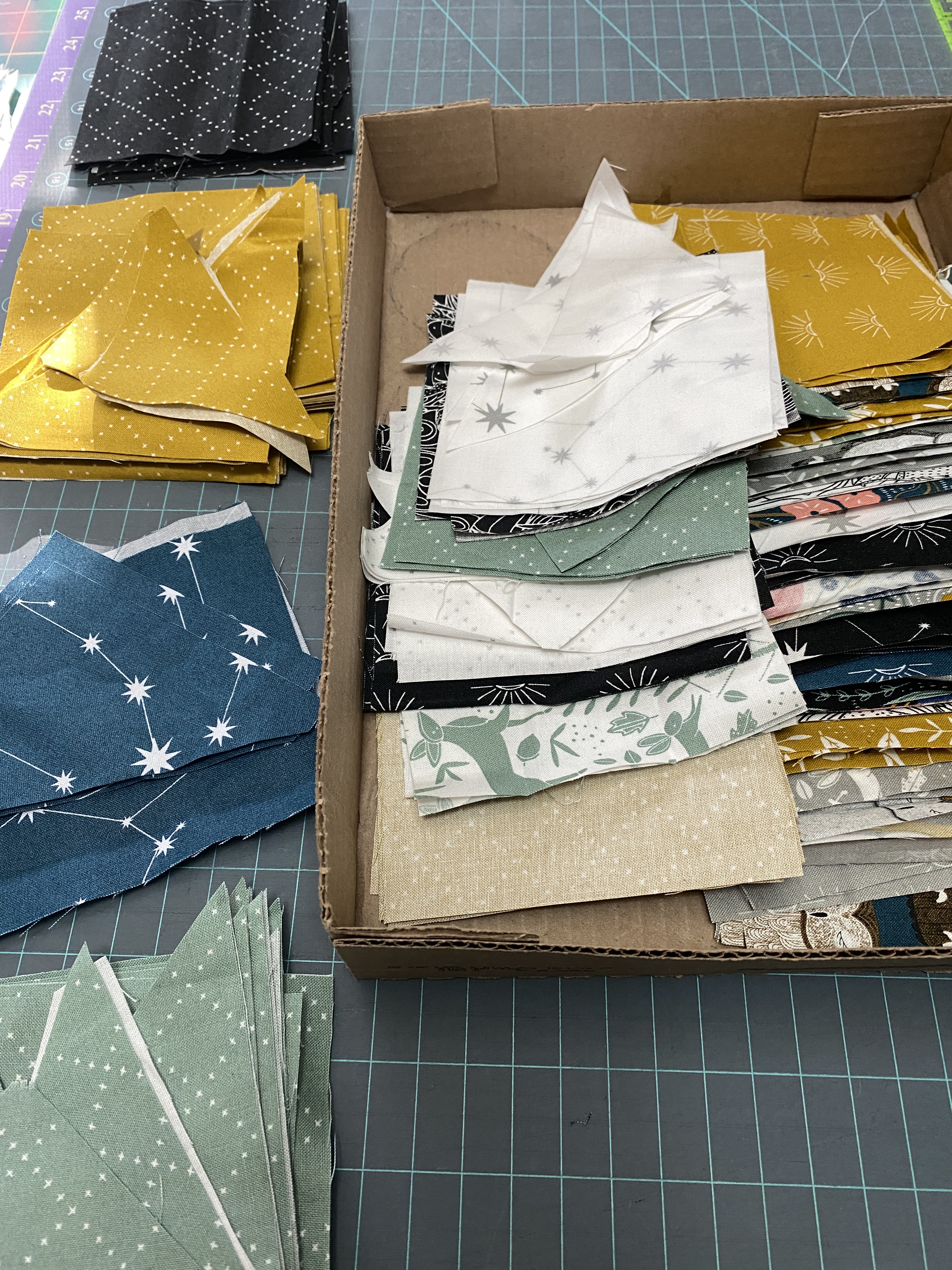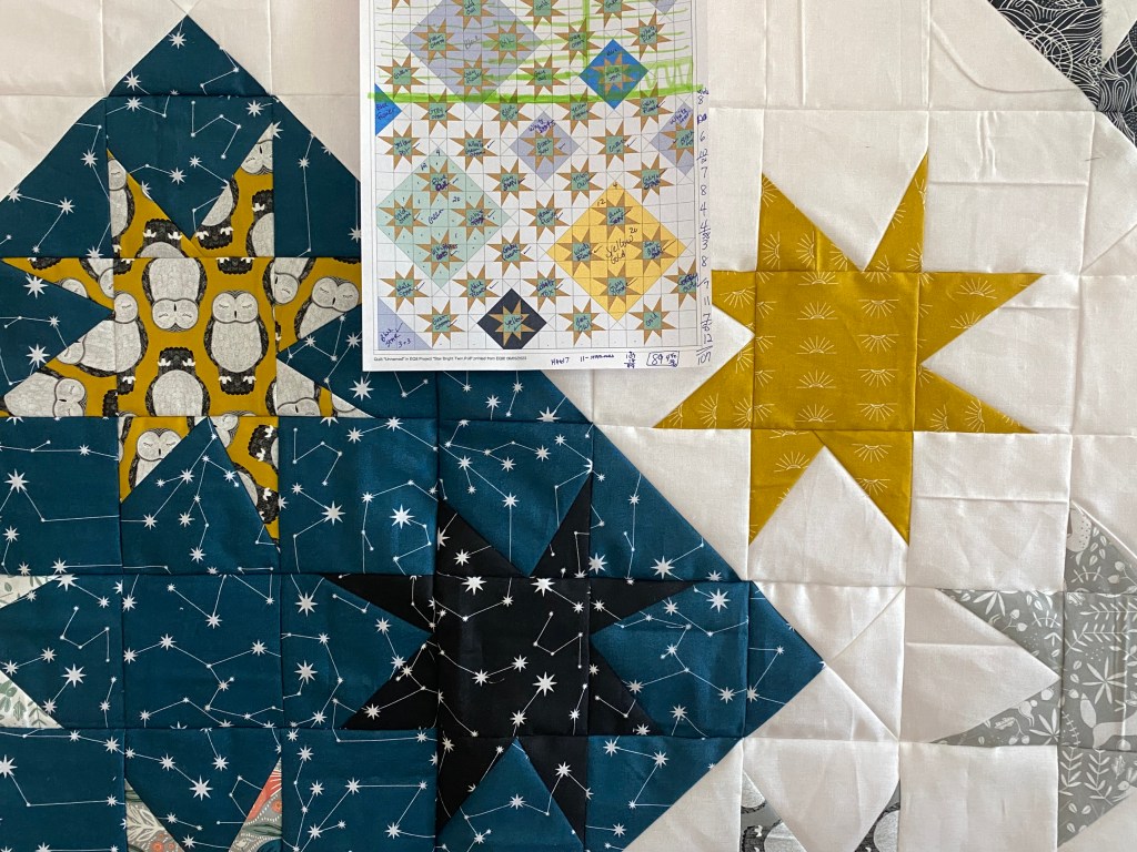 I have been sewing away on the Star Bright quilt top, my version is a bit bigger than the pattern, 70″ x 90″. All 4 inch squares, I am working it a section at a time, referring to my EQ8 mock up. The green highlighter shows the finished ones. Yesterday I cut all the pieces for the rest of the blocks, I had been cutting as I sewed, but I think the pre-cutting will streamline the process a bit more.