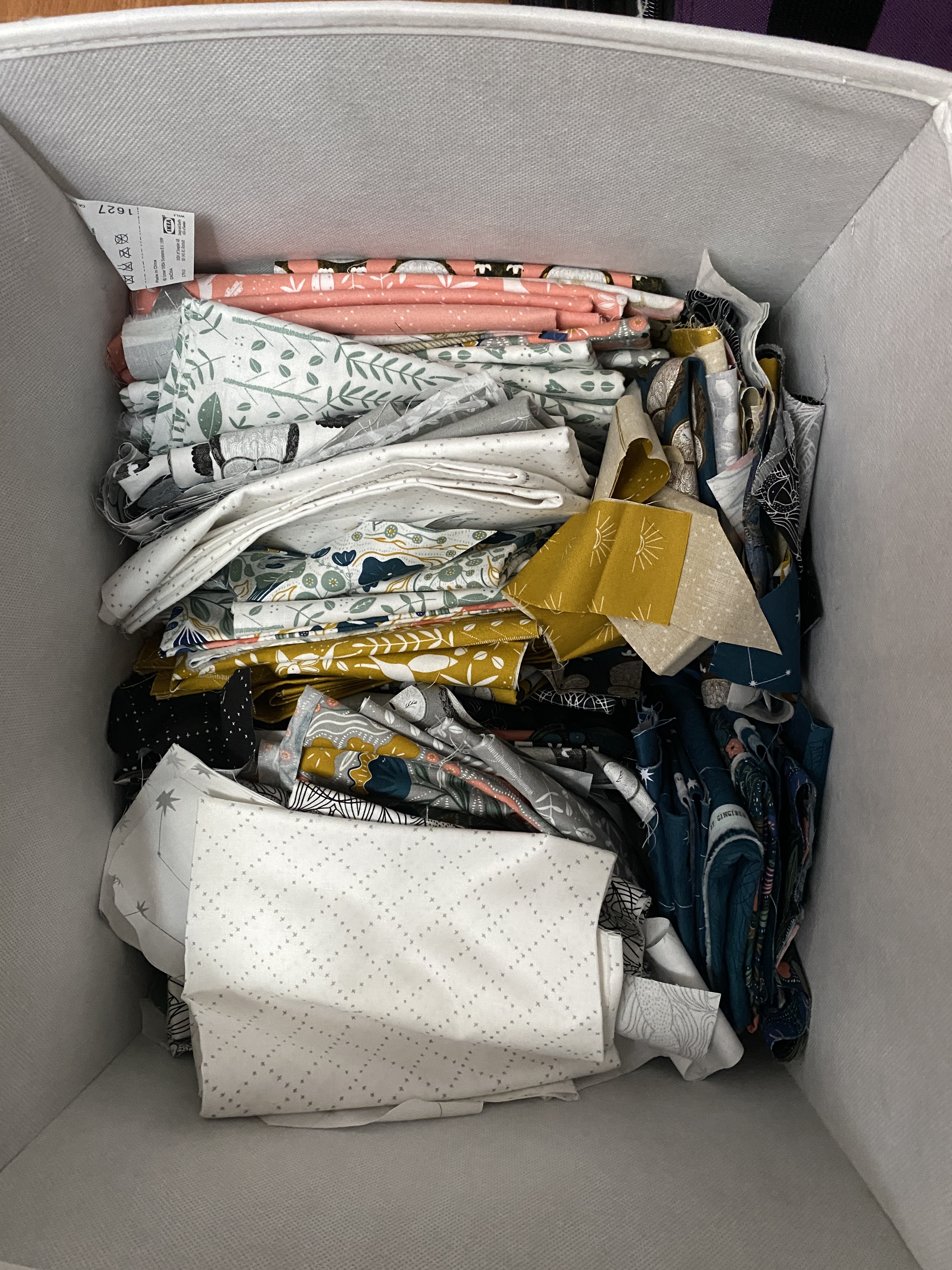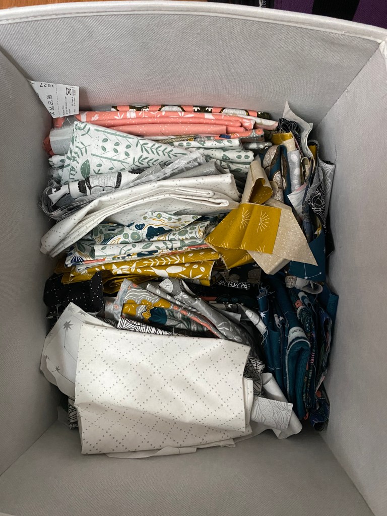 I am hoping to get these three quilts done and in the mail by the end of the month. Then I only have one more, queen size, the Skylights Pattern. I am finally seeing the bottom of this pile of fabrics I have been working from. I am itching to make something from my stash, in my color preferences and my pattern choice. Maybe this kit I got a few years ago, it’s orange and pink and purple. Truly though, I should give the Message in a Bottle quilt a bit of time. I am soo behind on that one, the last installment is coming in about two weeks. I’m on month three of twelve, sigh, not even close to almost done.