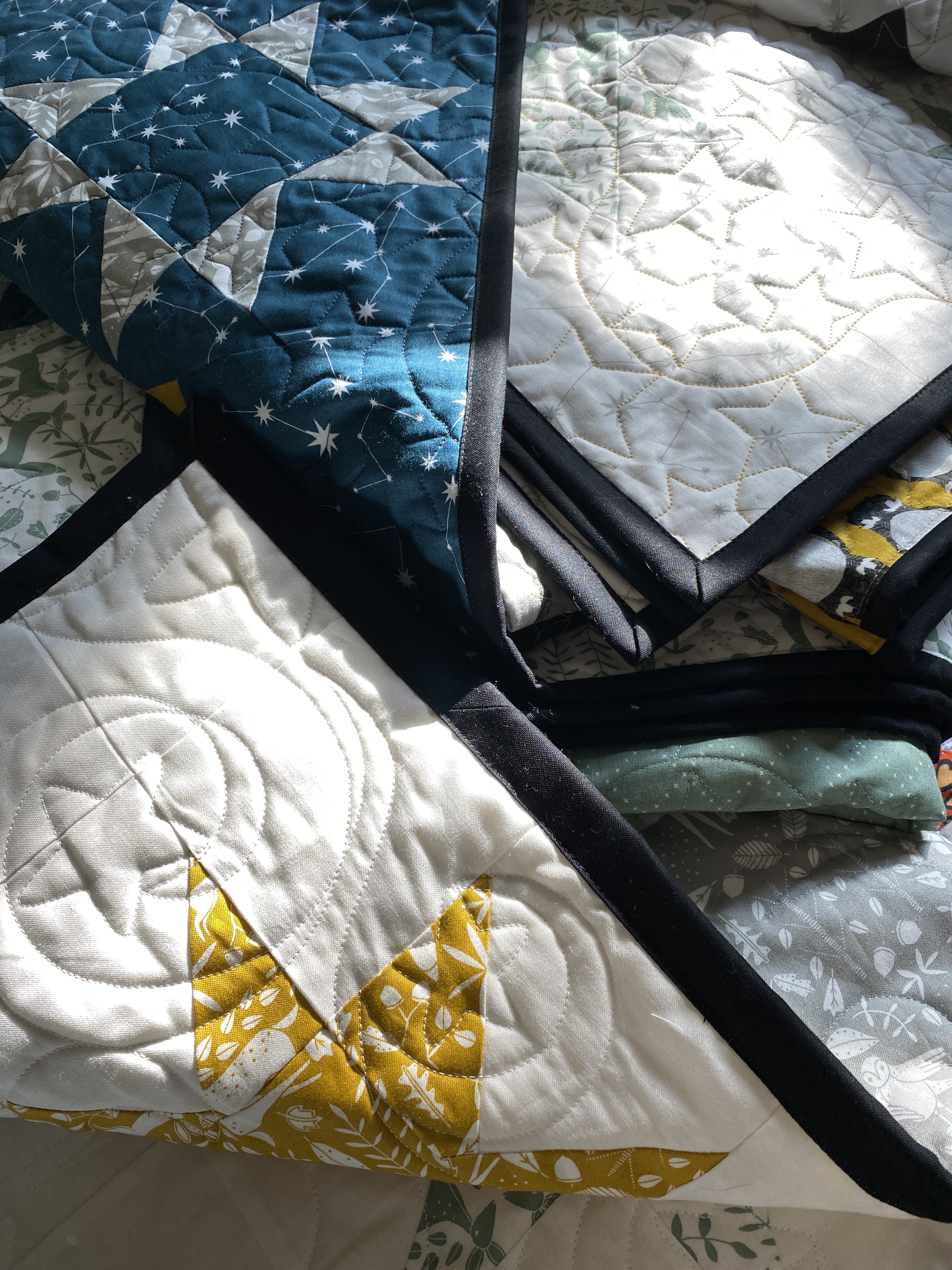 Two to go. I finished binding three quilts yesterday, todays goal is to get them photographed and posted to the client. Which will lead to packing them up and shipping them. My goal is to have all this by Thursday. I got up this morning and my upper back was a bit sore, don’t know if it was the binding, the gardening or the stitching I did yesterday. Probably a bit of each. I have the backing for the seventh quilt, a twin sized version of the Dwelling pattern, set up on the frame. It would be good to get that ready to quilt too. Waiting on the sewing table are the 128 paper foundation pieced flying geese I need to finish. Blech. I cut all the triangles and printed all the papers. I really should just buckle down and chain piece for a few hours.