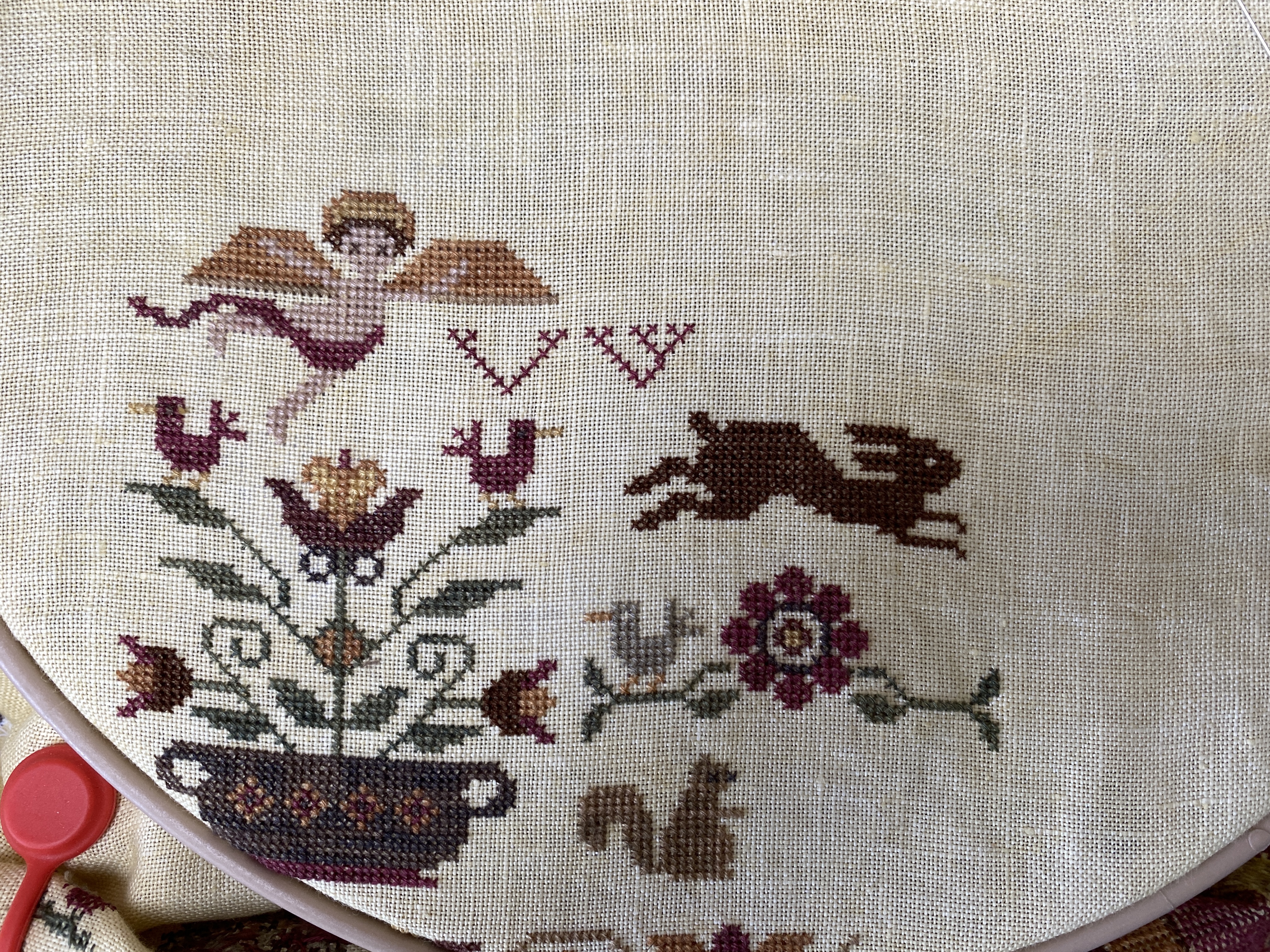 The Heaven and Nature cross stitch is coming along, I stitched the rabbit, flower motif and angel this week. I was going to insert my initials and date somewhere on this piece. I may just replace the numbers (1-10) on the right side with my initials and year. That way there would be no extra counting or messing around with the chart. I should do the border up and around the top, I am nervous it’s not going to meet up at the sides, but that happens with every sampler I make. It’s a given that there will be fudging involved. Even on the Pilgrims Progress piece I was a stitch off. Which reminds me, that piece should be ready to pick up in about two weeks. I broke down and brought it to the professionals to do. I just couldn’t get it straight looking on the foam core board. I figure that by self framing all my other pieces, I saved enough to let someone else do this one. I’m pretty suer I bought a frame for H&N, once I am closer to finished I’ll look for it.