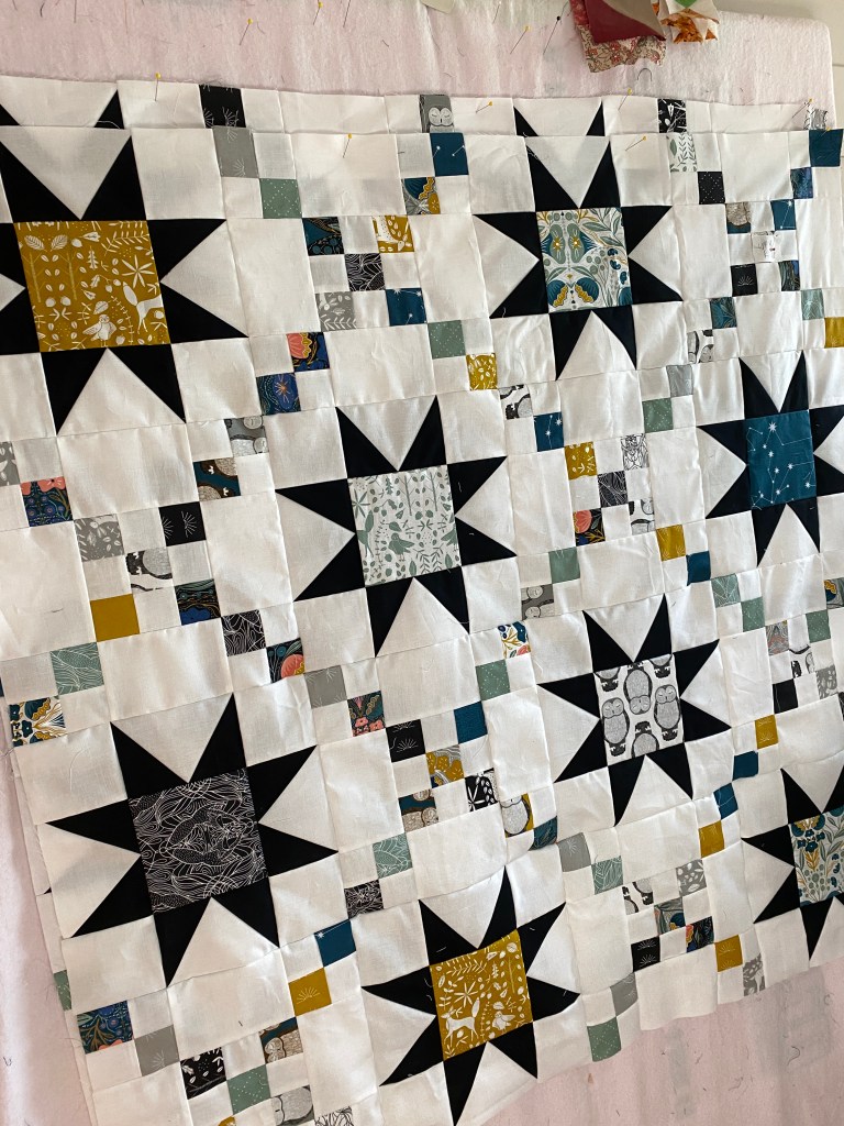 I have made a lot of progress on the Nocturnal quilts. I finished quilting the twin sized Dwelling pattern one, and finished all the blocks for the SkyLights pattern one. I am in the process of putting all the blocks together. I am going to be so happy when these quilts are finished. I am itching to work on my own projects and get some more quilts into the shop for sale. Christmas is coming and I have one top that needs quilting, and another (SAL with Wendy Sheppard) in mind to stitch up. Not to mention, the last installment for the Message in a Bottle BOM arrived yesterday. I’m on the third block, nuff said.