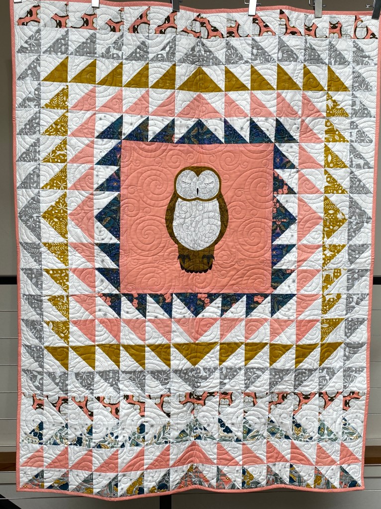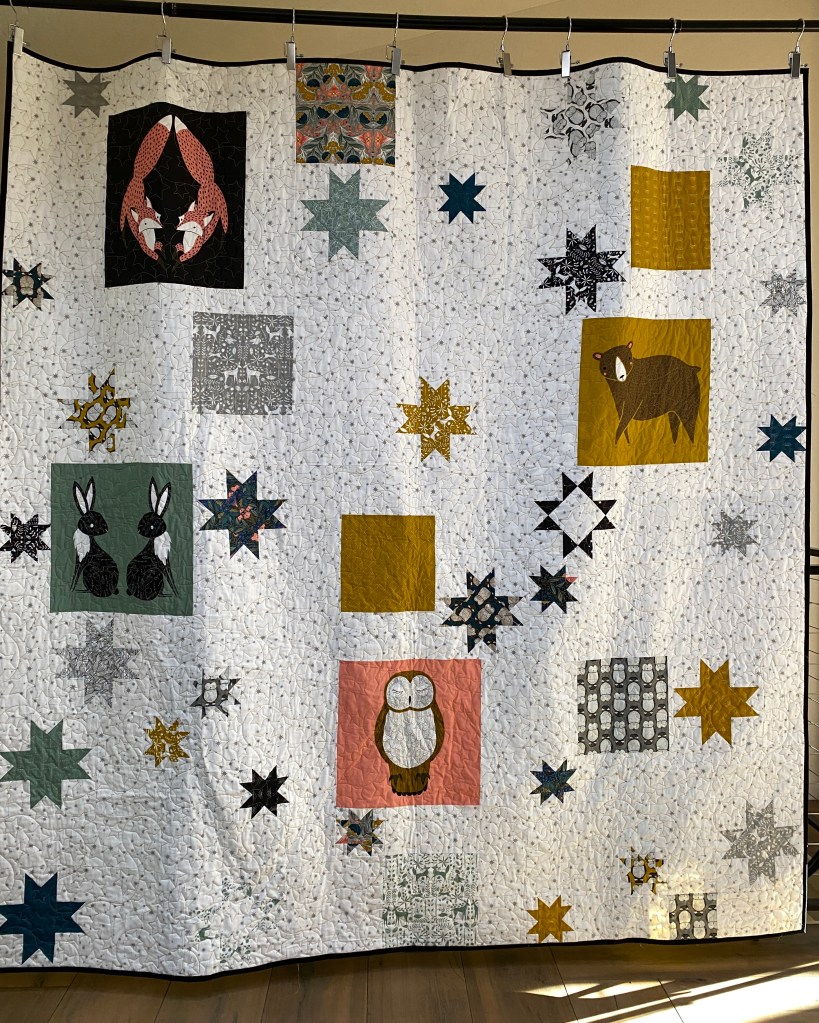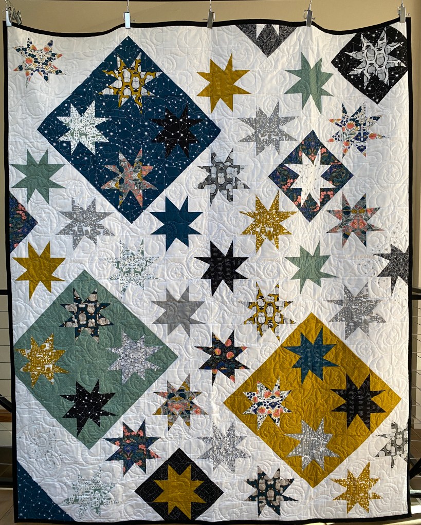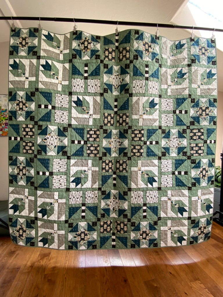 I put the last stitch in the binding of the last quilt I am making using the Nocturnal fabric line. I still like the fabric, but I am just done with working with those color ways and those prints. I don’t even want to sort the scraps, but I should clean them up and get the box off the floor. These last four quilts are part of ten that I made for a client this year. I started in March, received the fabric, looked for patterns and made them bigger or smaller and started sewing. 10 quilts in 4 months.