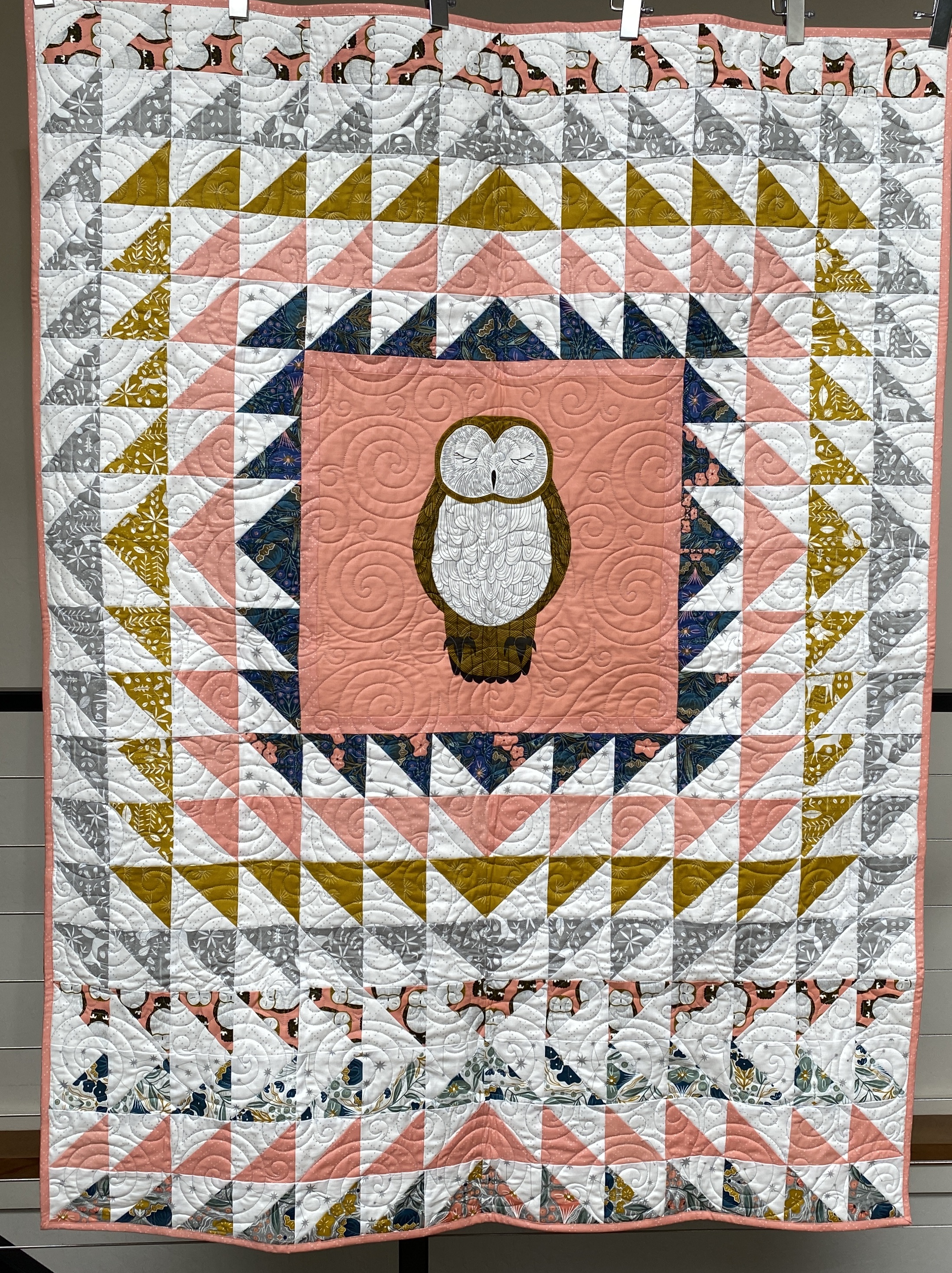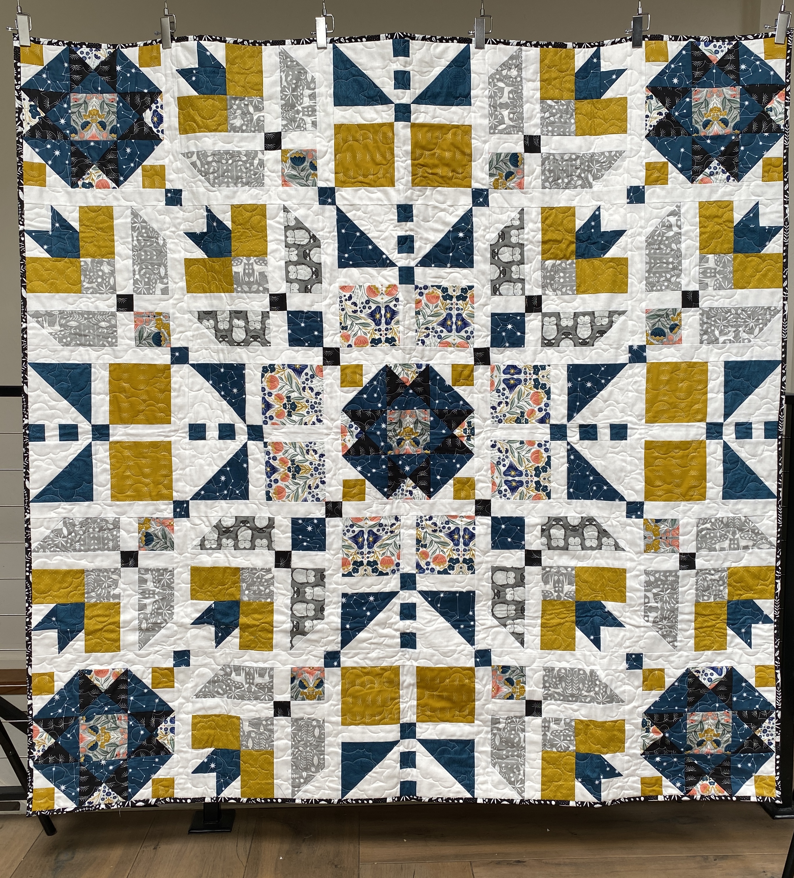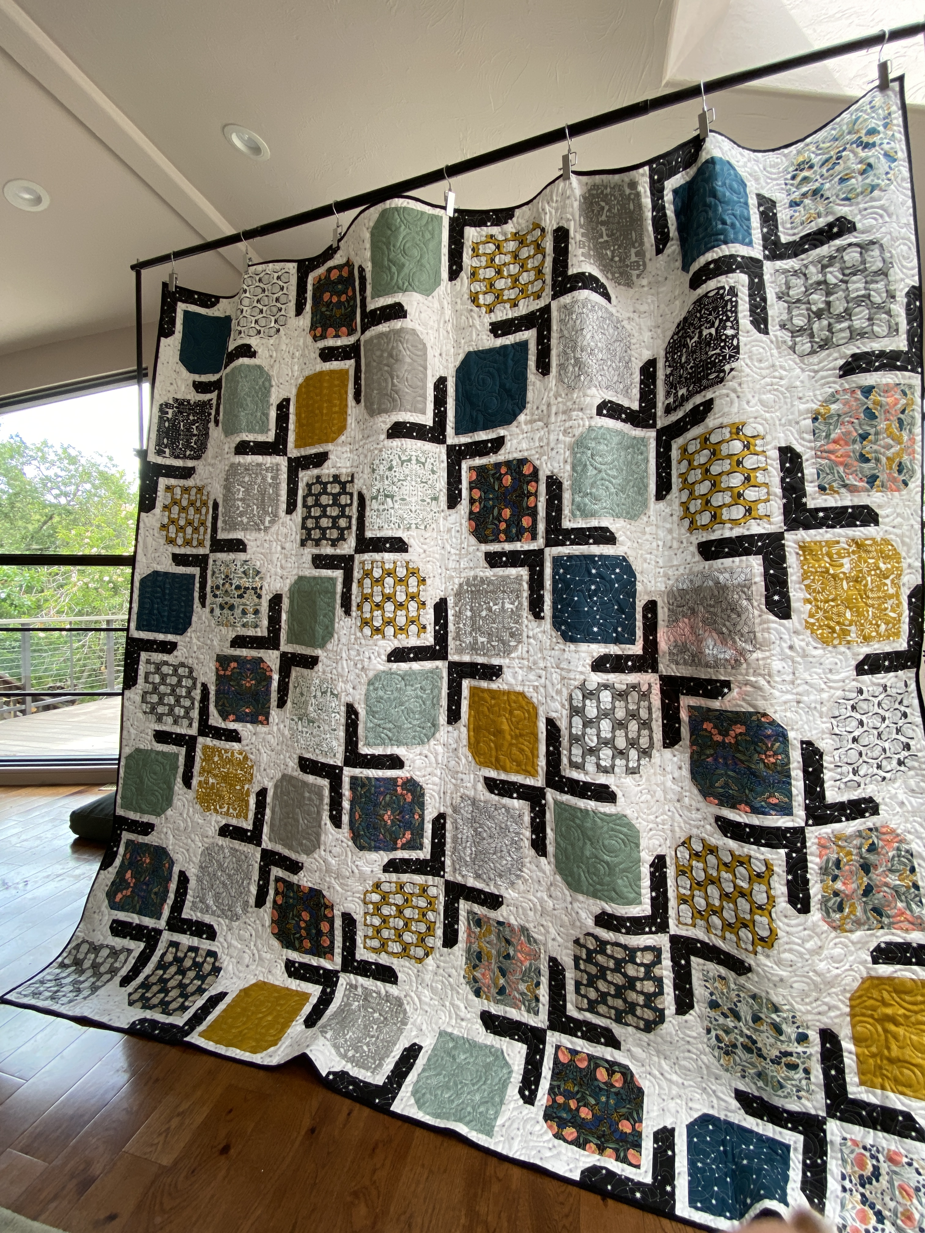 I put the last stitch in the binding of the last quilt I am making using the Nocturnal fabric line. I still like the fabric, but I am just done with working with those color ways and those prints. I don’t even want to sort the scraps, but I should clean them up and get the box off the floor. These last four quilts are part of ten that I made for a client this year. I started in March, received the fabric, looked for patterns and made them bigger or smaller and started sewing. 10 quilts in 4 months.