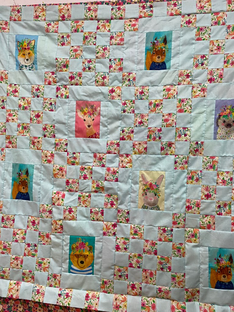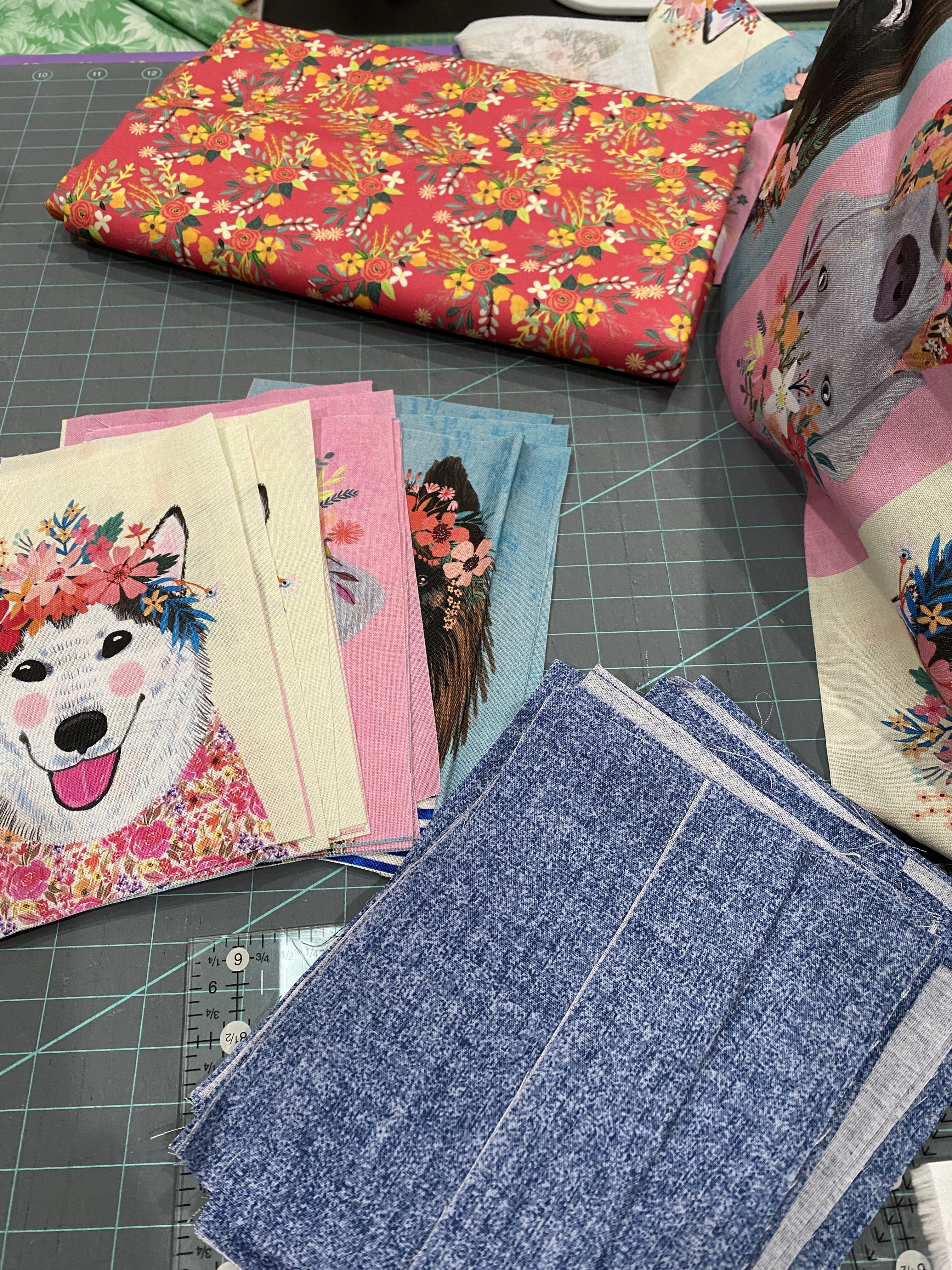 I finished off the two floral animals quilt tops I started before I left. These are from the Mia Charro line I have a bunch of fabric from. I also started two more tops with the dog and cat versions of this line. The cats are interspaced with Kona solids, the dogs, I found this denim looking print in the stash. I have not decided if I want to use some more color or the complimentary red print.