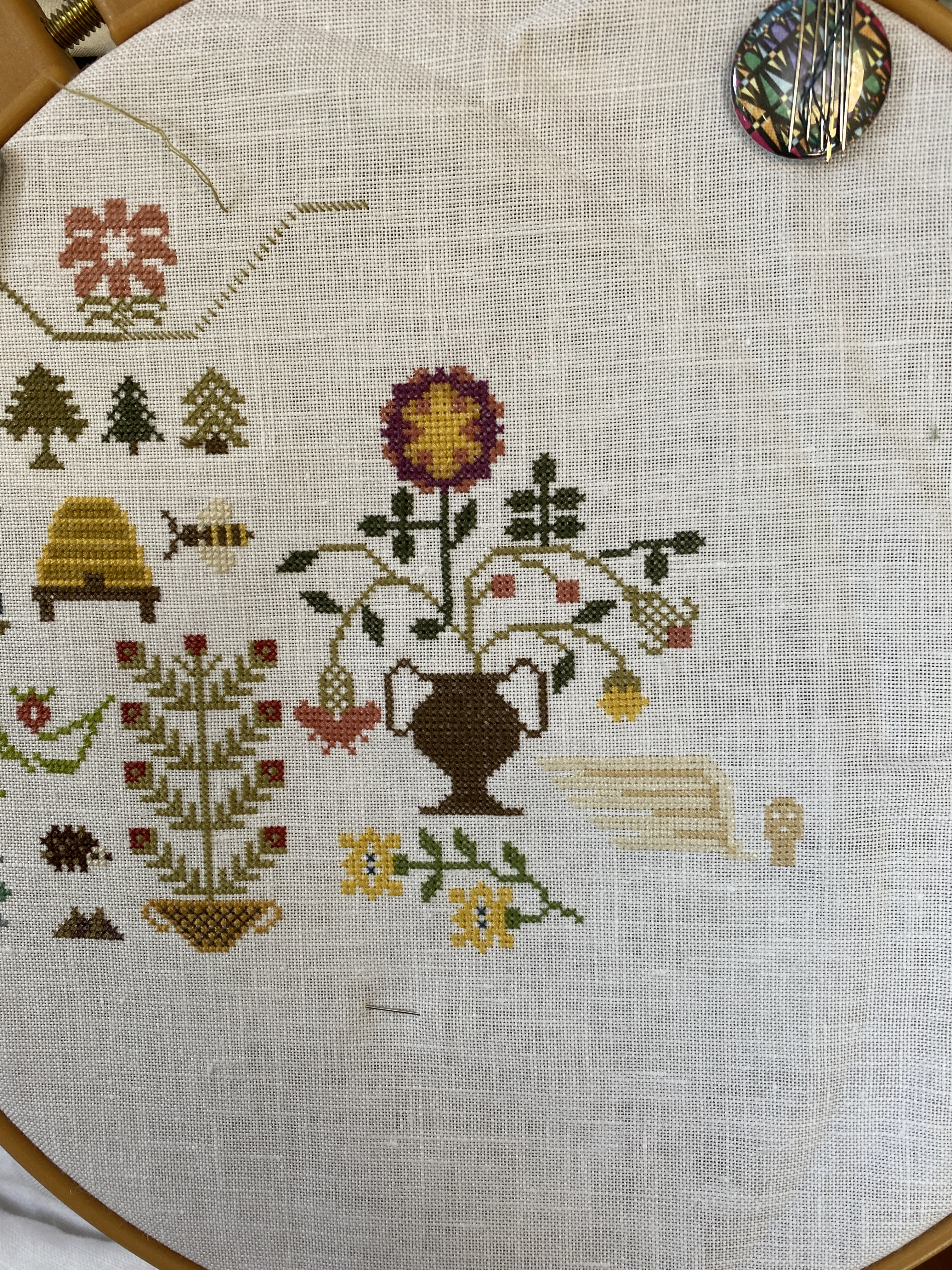 I got another motif done on the Consider the Lillies piece. I won’t be finished with the page by tomorrow though. Page two is going to bleed into three, no biggie. I worked a bit on the “gathering Snowflakes” small. I am thinking if I finish this one, I’ll start on a halloween one, the “Hocus Pocus” one I kitted up last year. I was remembering that I have a few Halloween things to make, last year I was intent on finishing the All Hallows Fig Tree sampler quilt. I have it hung up and on display already.
