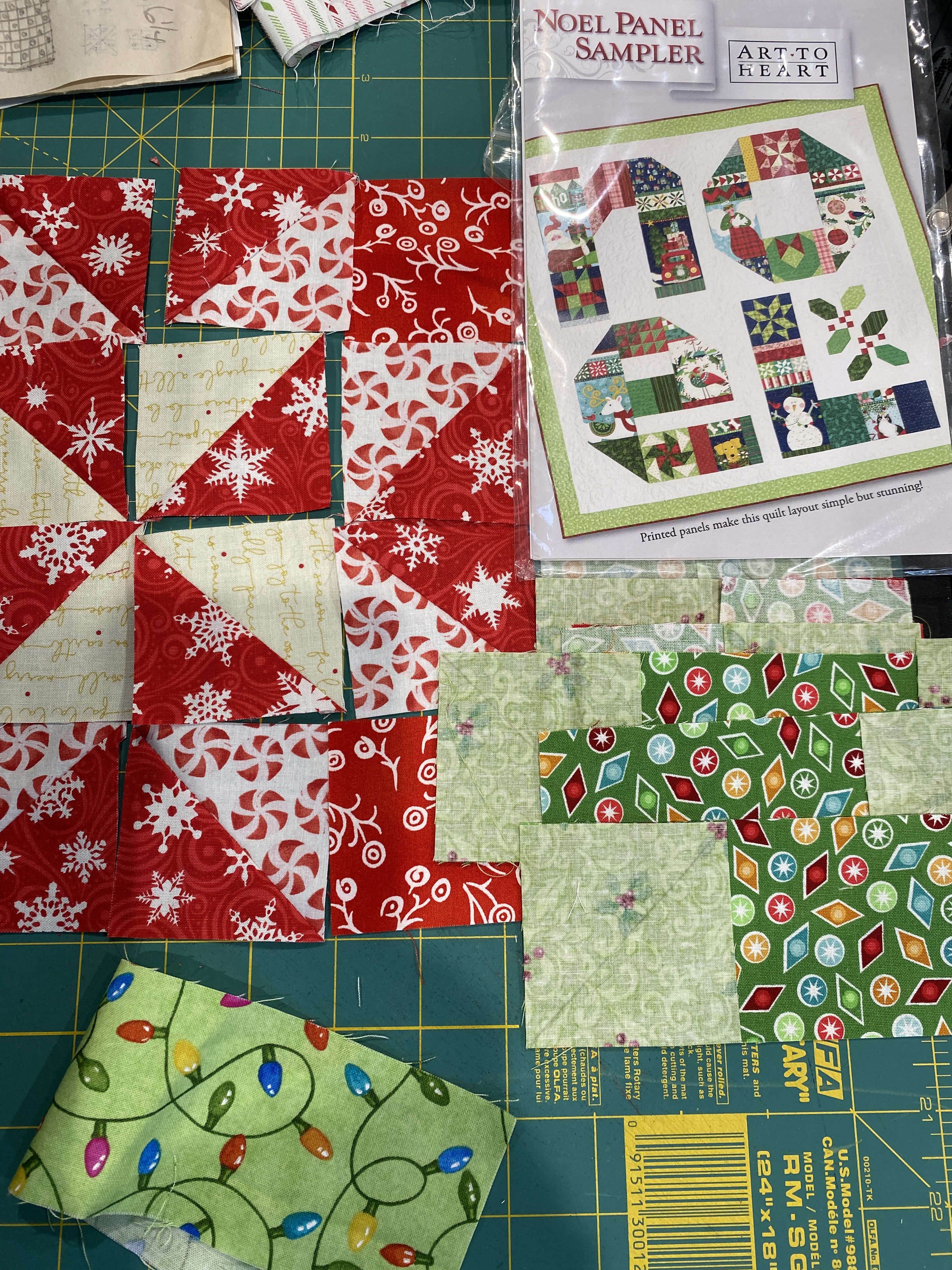 I was looking for something to start in the sewing room, and came across a kit I bought a few years ago. It’s a wall hanging, but it is made from two panels and some yardage of the same fabric line. I opened it up and got started. I realized that it wasn’t a full kit for this project. There are a few half yards of fabric, and the two panels, but not the variety that is called for in the pattern. Good thing I have a stash of Christmas prints, I was able to augment the kit and get a similar look to the mix of fabrics in the picture. I got the N done and will finish up on the O today.