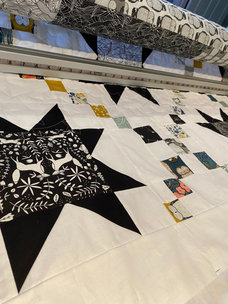 I have been getting better these past few days. Yesterday I didn’t have to nap, but I only did one strenuous (getting the trash ready for pick up, lol) activity. I spent a few hours watching the long arm do its thing, I only have one and a half more rows to finish that quilt. I would really like to have it packed up and out of here on Monday. I took a look at the commissioned quilt, the vintage appliqué quilt. I need to do some hand work, to fix the wave-y border, and figure out how to make a tuck in the backing look okay. The borders were not too wavy, but I ended up with about an inch or too extra in length on the long sides. Much steaming and manipulating of the fabric was done to alleviate it, but I still need to do a bit of fold and sew at the seam line. The backing was a bit wonky too, the maker had started to hand quilt the center of this top. It was basted to the backing, however the backing wasn’t square, causing a little difficulty in getting it to be on the frame straight/true. I had a few hours of struggle there, but I think I am going to have to leave the tuck.
