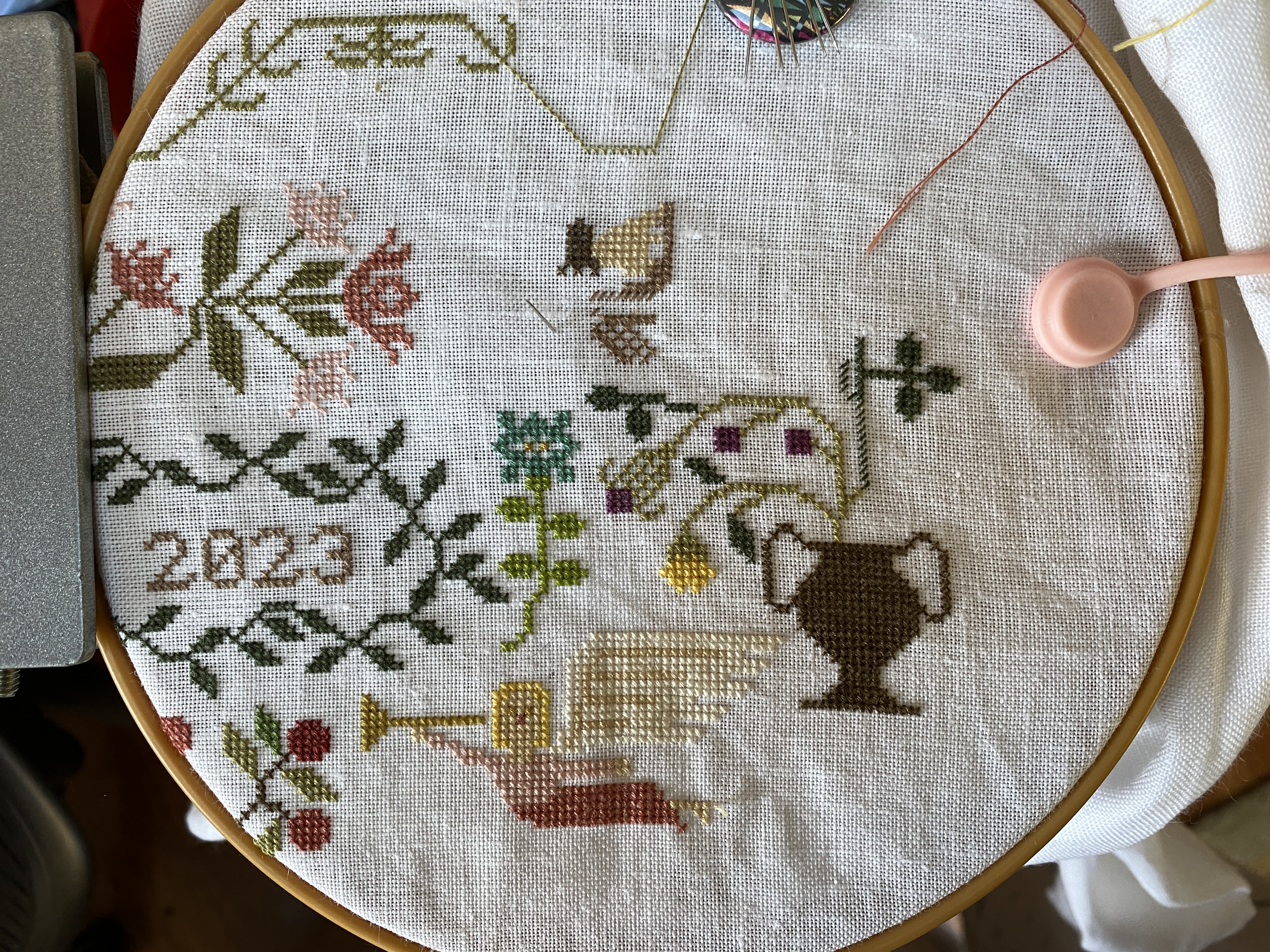 In cross stitch land, I am finishing the October page for “Consider the Lillies”. I am doing this as a stitch a long with Jo from Jo’s Country Junction. The plan is to complete a page a month, since there are a bunch of motifs and flowers on each page, it wouldn’t be boring or overwhelming. Although, lately she seems to be working on other things. All good, though, as I finished two side projects this month as well. I still have to finish sewing the chenille to the edge on Hocus Pocus.