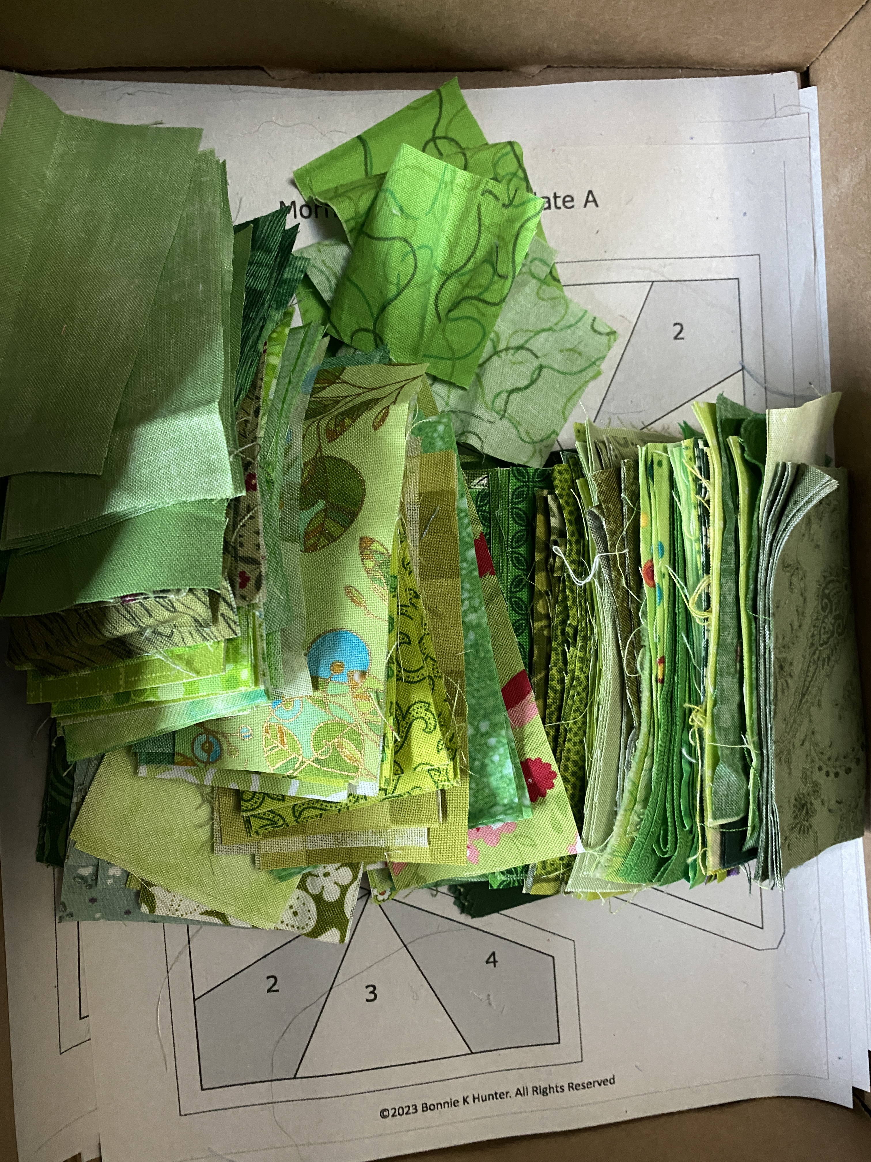 The color ways for Bonnie Hunters Winter Mystery Quilt are coming out next week. I would like to do that QAL, I did last years in her color ways, but orange, turquoise and purple are not my first choice. Hoping for no orange this year, or maybe I’ll finally get adventurous and change up the colors to ones I like. I did just buy her newest pattern, Silk Road, so many small brown squares. I have a few totes of scraps I can use, and I like brown scrappy quilts, lol. Perhaps I should work on the Morning Glories quilt I started last month. I got a bunch of green scraps cut, now I just need bunch of neutrals.