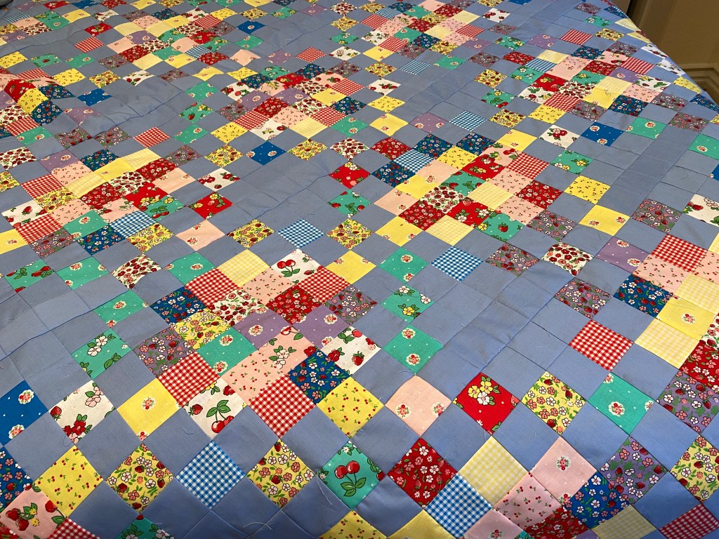 In between surfing for pantos, I finished this top, from the Busy Hands pattern Picnic Plaid. Lots of little squares, but the pattern is very well laid out with charts and instructions to help achieve a random look. The fabric was from another quilt kit I had bought from “Craftsy” a few years ago. Two rolls of 9 inch wide 42 inch long strips, from the line called Strawberry Fizz. I have one roll left, which may become a Whimsy quilt.