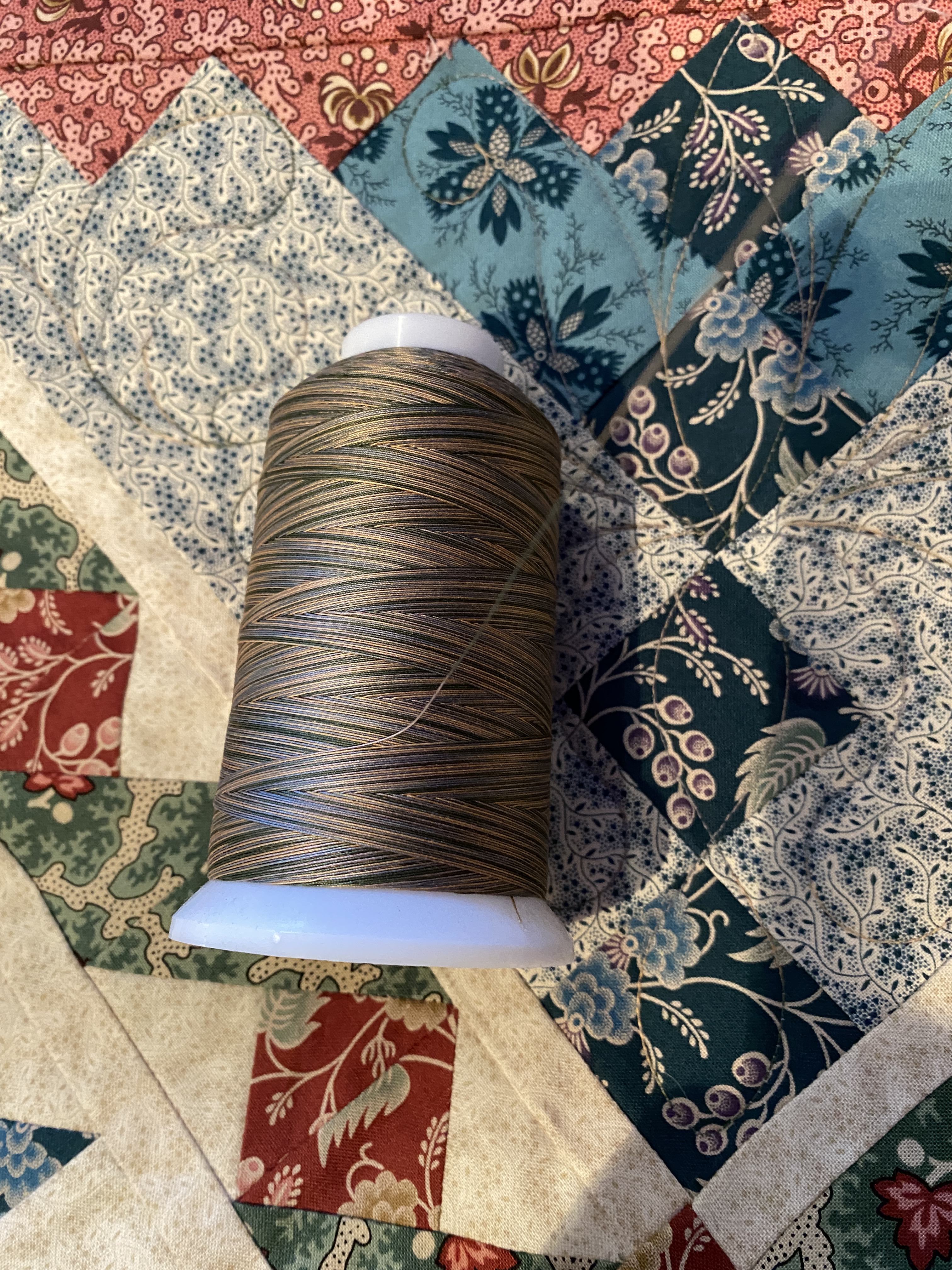 I spent a lot of time this week trying to find an appropriate border pantograph for the Ribbon Runs Through it quilting project. Last week I found a set, at a new to me site, called It’s a Quilt Thing. The set included block designs and sashing ones, but nothing for the outer 6 inch borders. After looking extensively through the many digital panto sites, I found the perfect one, and it was already in my library. It took me a few hours messing with the sizing and positioning, but I got the first border stitched yesterday. I am using a rather ugly spool of King Tut thread, called Caravan, but it really looks good on the quilt. There is a bit of dark teal, tan, and rose in the thread, just like the quilt fabrics. It blends in with the pinks, and looks good on the teals. I had auditioned pinks and grays, and tans, but this spool is the winner.