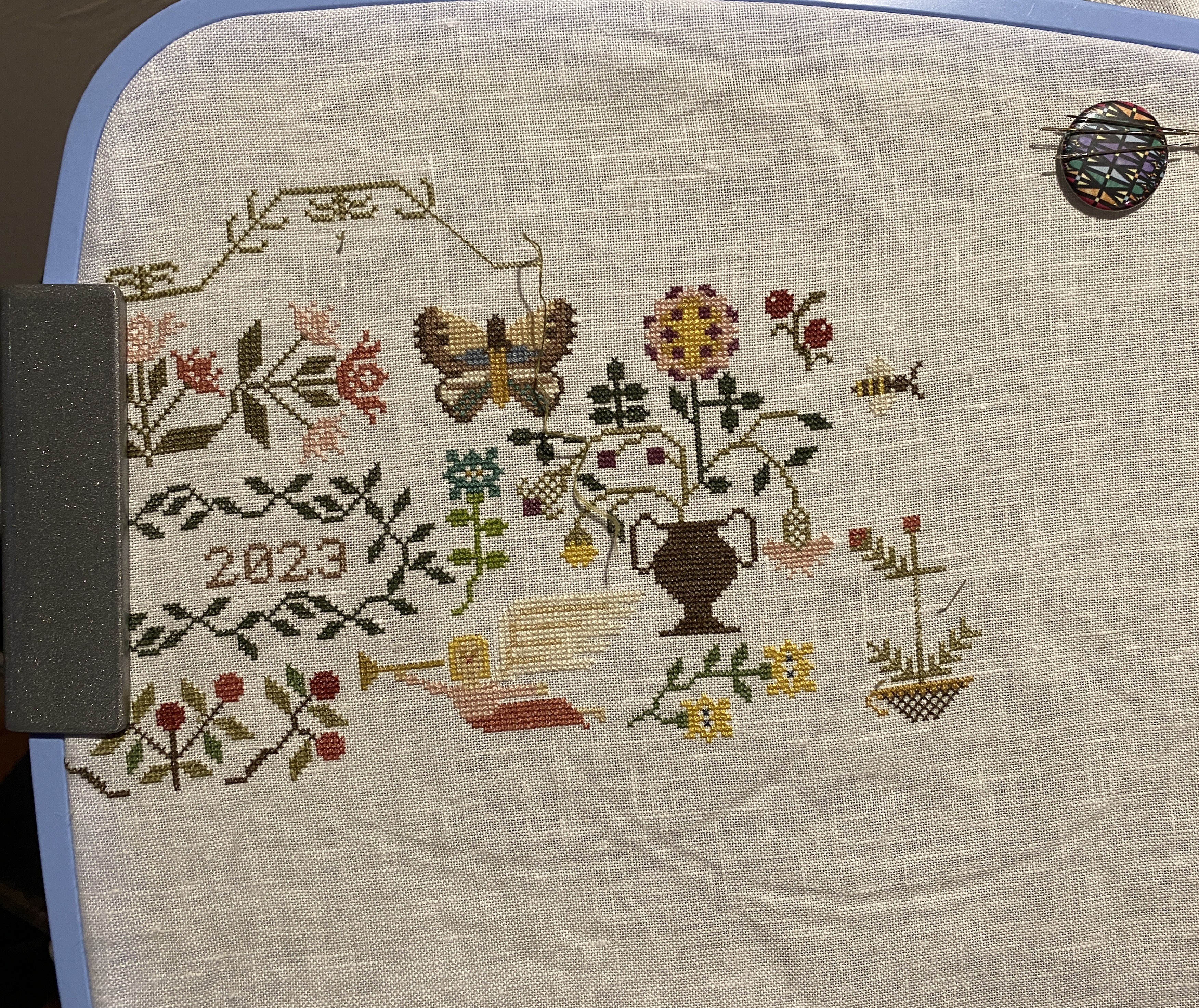 Consider the Lillies is being stitched, pretty much daily. Although I have been nodding off while stitching after a day of activities. I switched to a rectangular hoop, I was having to move the circular one too often. I would like to get the top border done this week, so I can complete the top section which is the first four pattern pages. Finishing those four pages is my end of November stitching goal. I still haven’t started a smaller project, that means I’m focused I guess.
