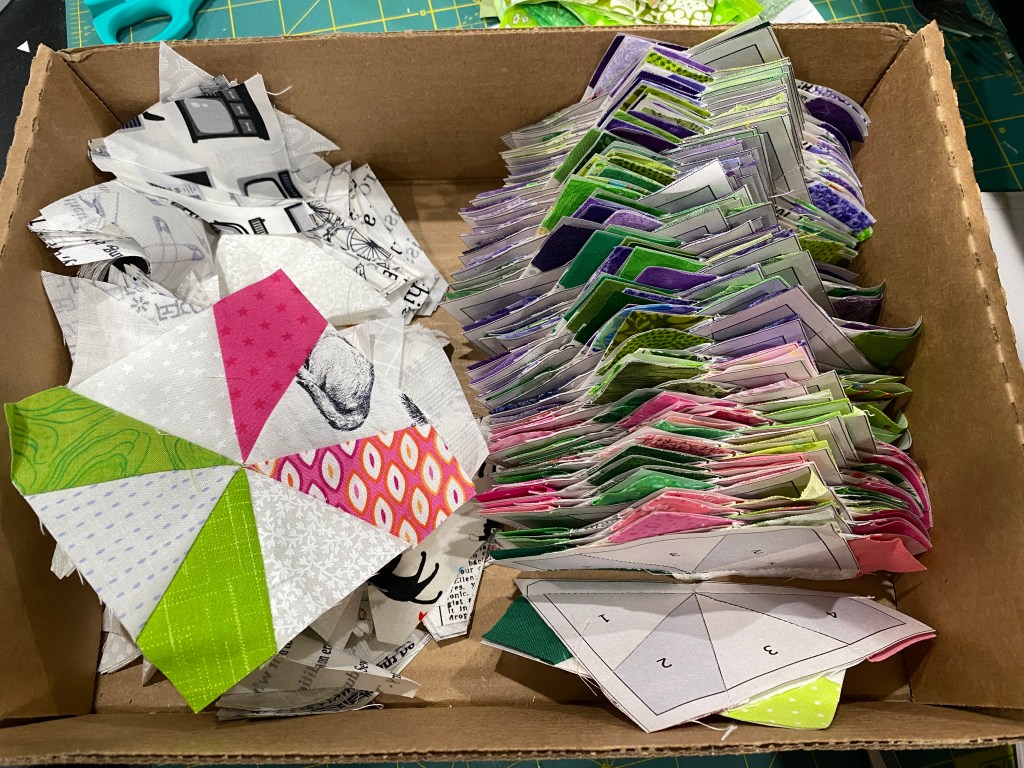 Foundation paper piecing, or is it paper foundation piecing? Maybe the latter. Anyway I have been making a concentrated effort to make the blocks for the Morning Glories quilt I started. I am trying to make ~20 “A” squares a day. There are four per block, and 49 block total. I am going through some of my scrap bins for colors and greens, and finding some. I went through a large bin the other day, and ended up deciding to cull all the tiny/small scraps into the circular bin. It felt good to have that bin empty enough to combine it into another. As much as I like to save fabric, there is a limit of space I have. I have decided I am no longer saving scraps less than 2 ½ inches wide. There. It’s in writing.