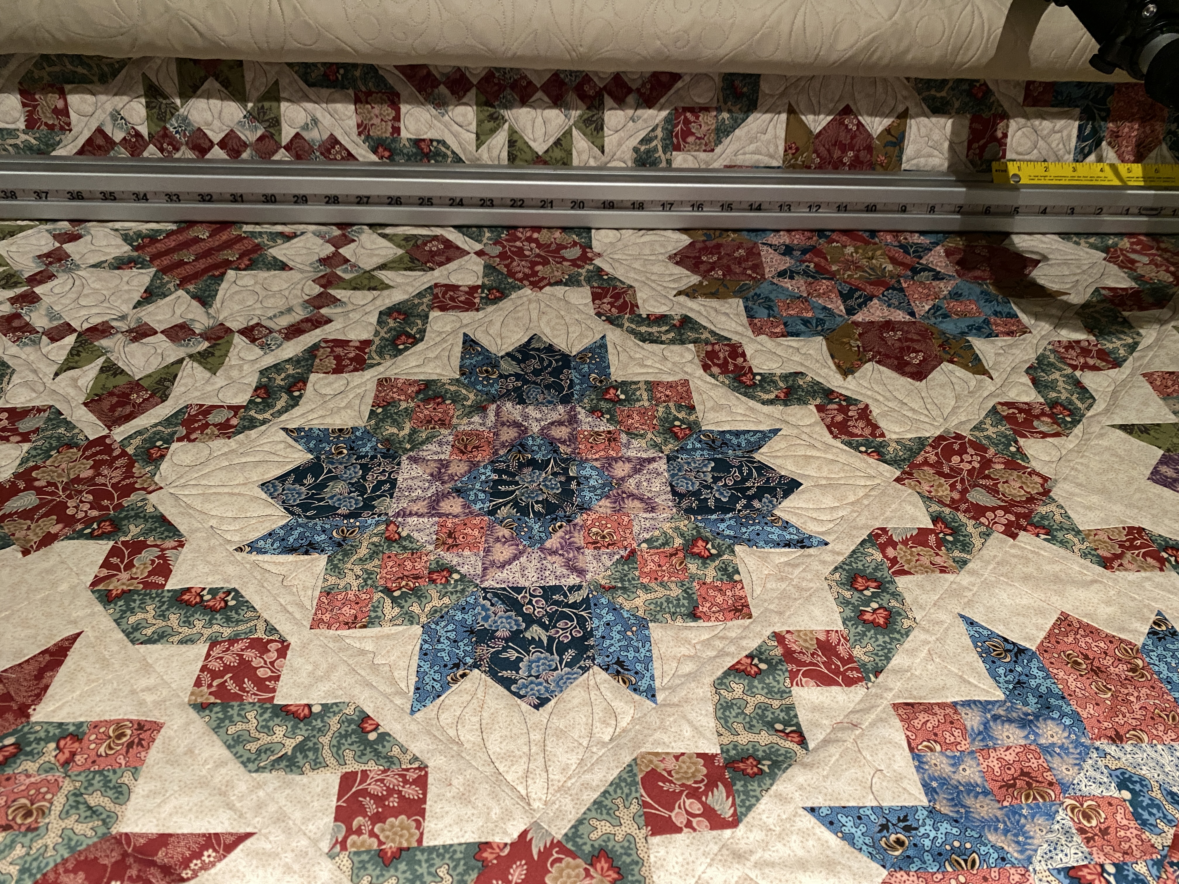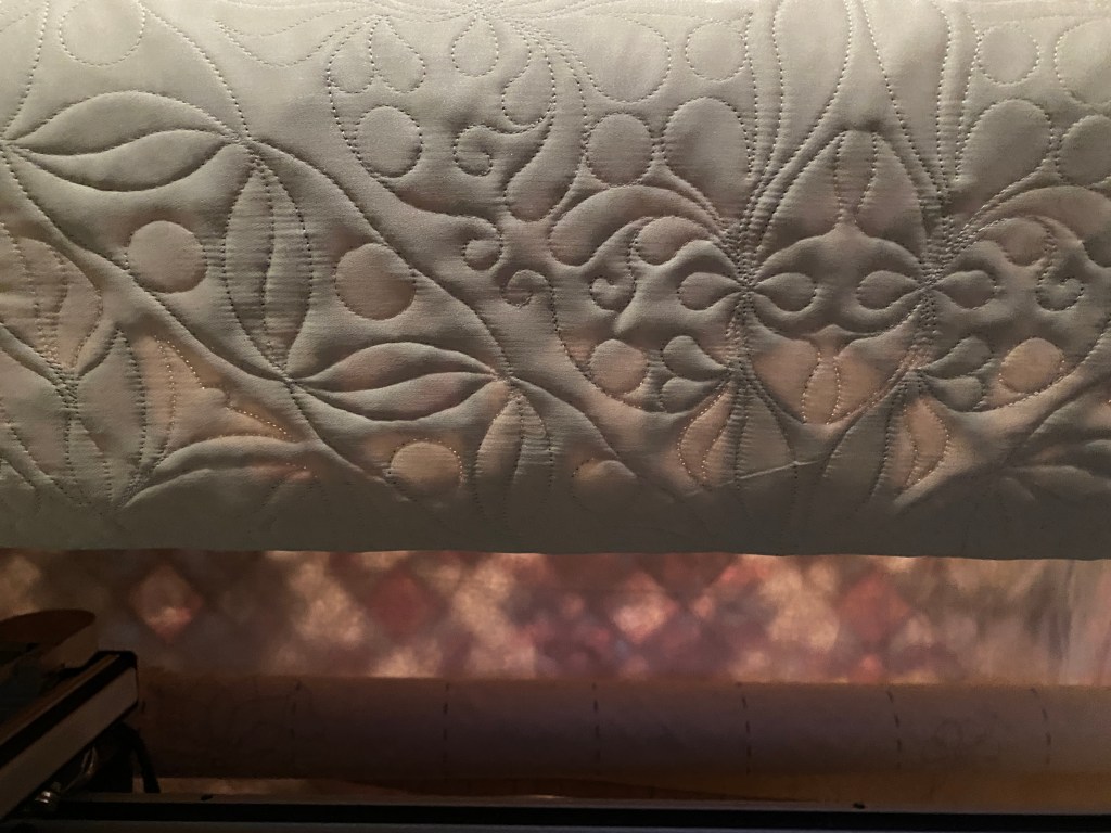 I have been progressively working on the Ribbon Runs Through It quilting. The 32 ribbon sashings are a PITA, but I have gotten to the point where they are easy to set up and stitch out, repetition it the key. The whole blocks stitch out nicely too, there are so many pieces (115) in each block, but the designs seem to bring it all together. I used an extra wide cotton sateen for the backing, I am hoping that it will look like a whole cloth quilt on the back-side. I like the feel of the sateen too, sort of silky.