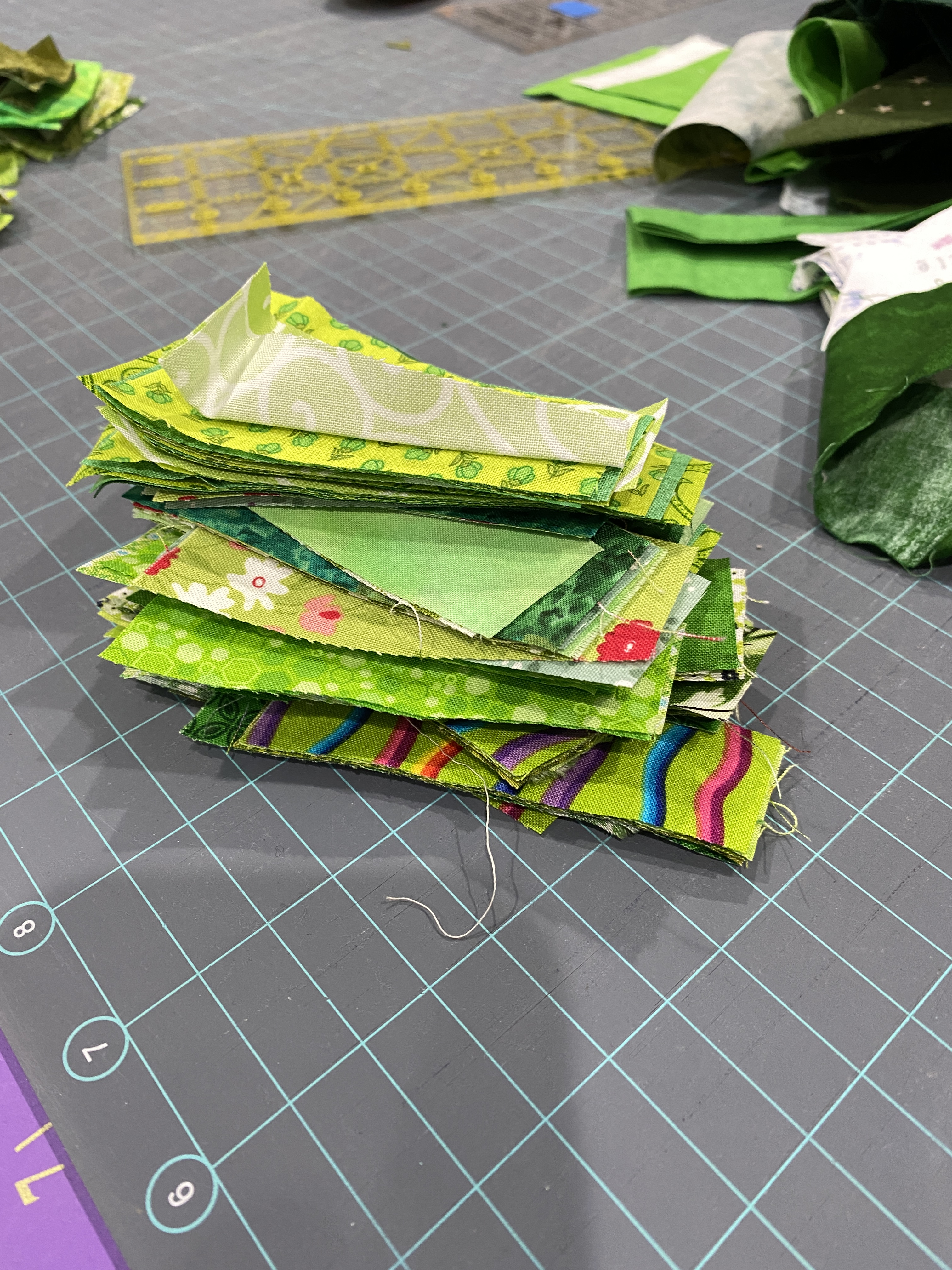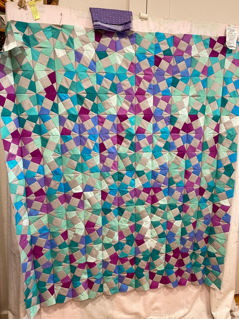 I’m trying to figure if I can make the fans undulate, rather than alternate, like these are. I will probably need more blades cut, to do the 84″ long borders. Or I could just add them to the top and bottom. More math is needed for this idea. Since I have written this idea here, I won’t forget it, although that pile of too small green blades won’t let me do that either. I haven’t been working much on the RRTI quilt. I have about 80% done and the quilt top bottom is basted to the backing now. I still have to turn it & do the side borders.
