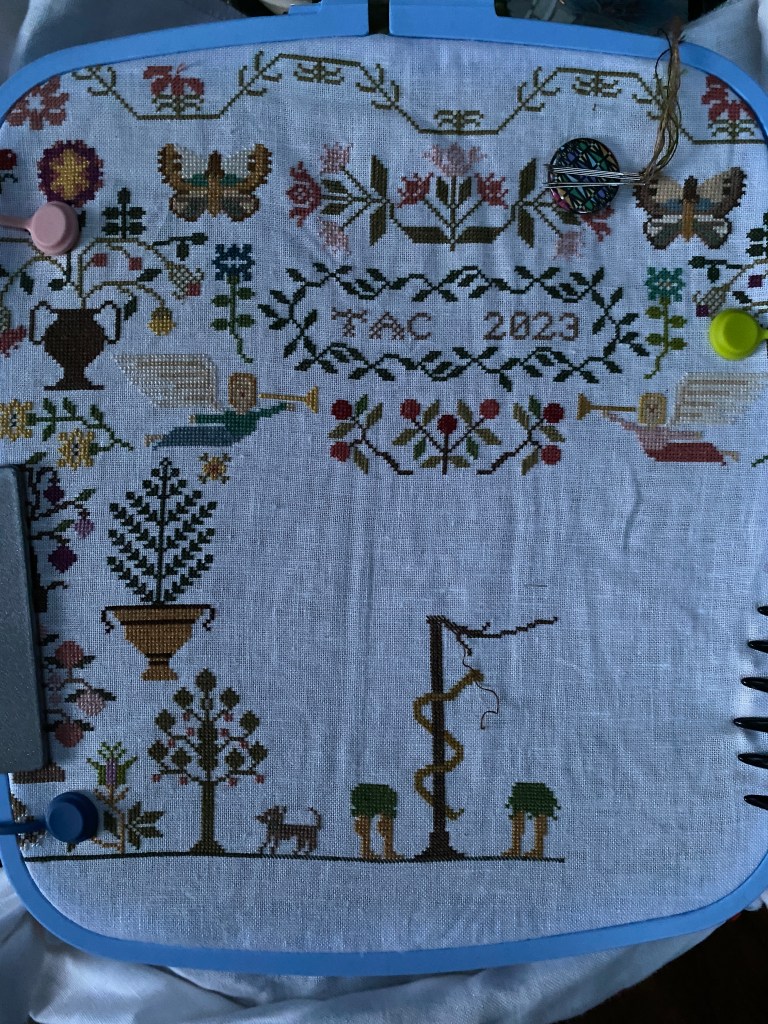 I haven’t posted a photo of my current cross stitching project lately, Consider the Lillies. I am on page eight, the center section. It’s got a symbolic Adam and Eve with the serpent, although they both have apples (?). Trying to decide if Eve will have a bra for her body, the pattern gives a hint of breasts, but it’s all in the tan color. I could just stitch the body in green, extend the skirt up into a sheath dress. It just looks weird to me that she is half dressed, fig leaves would have been more in line here. May be that they were too difficult to chart.