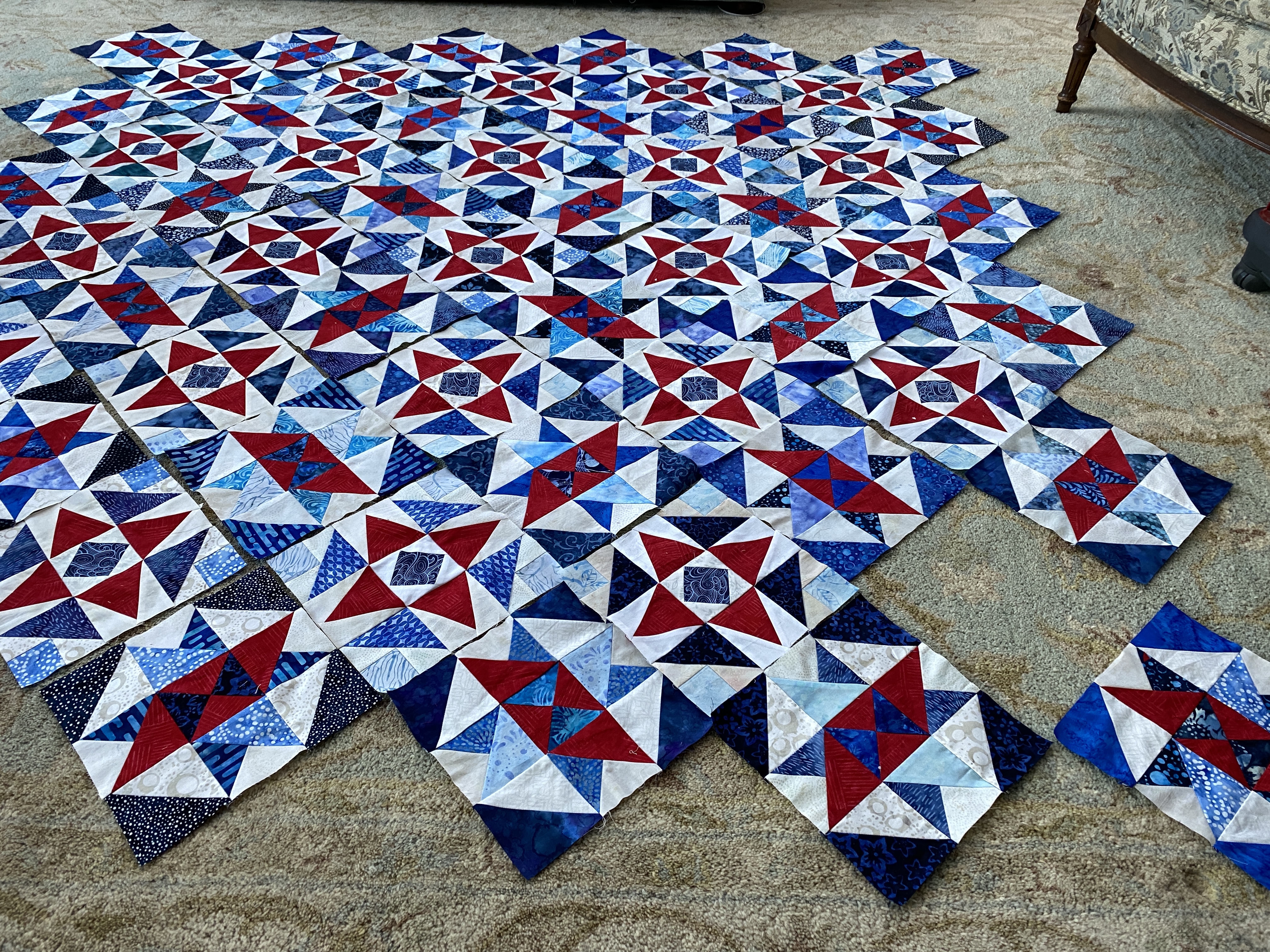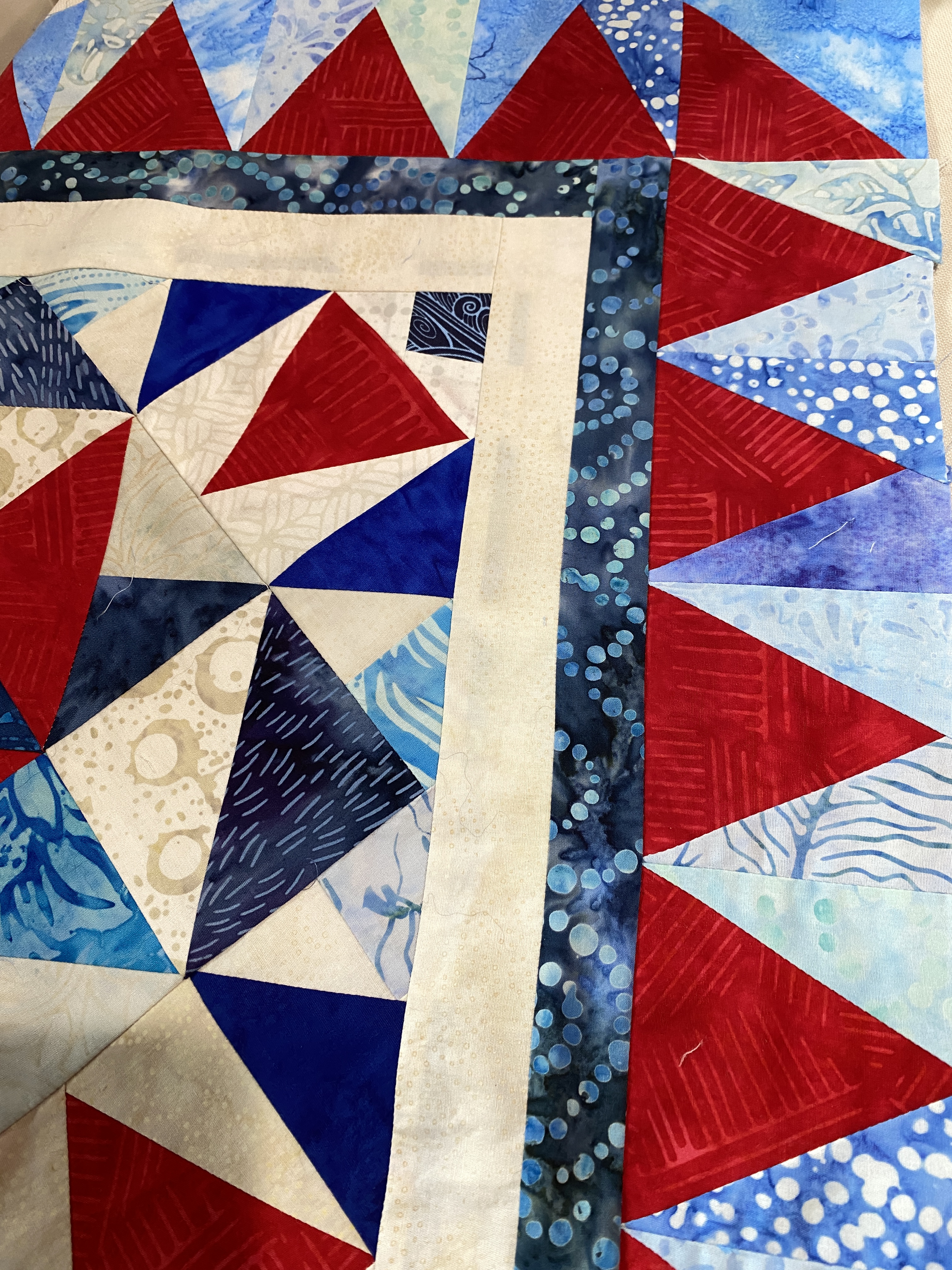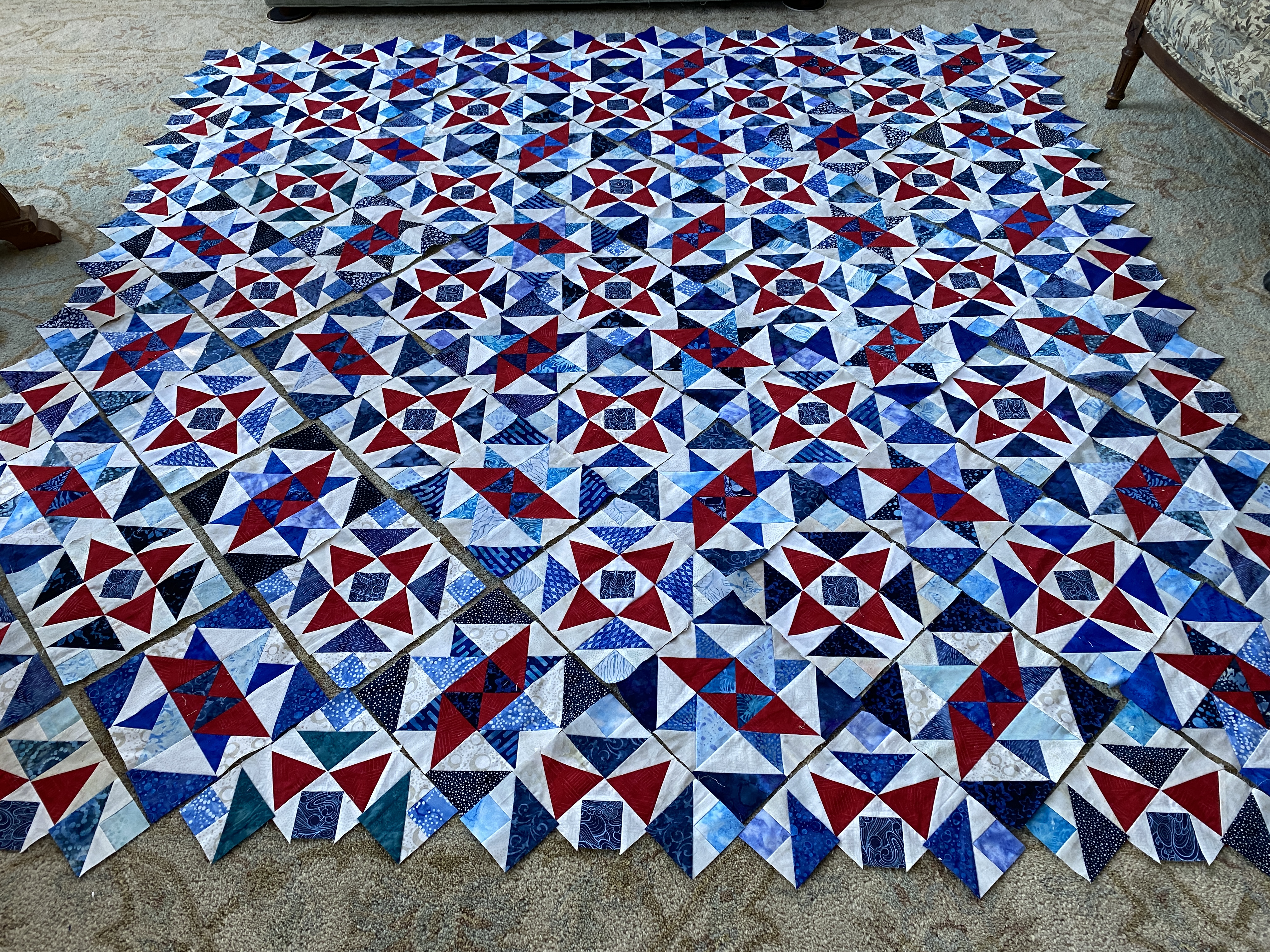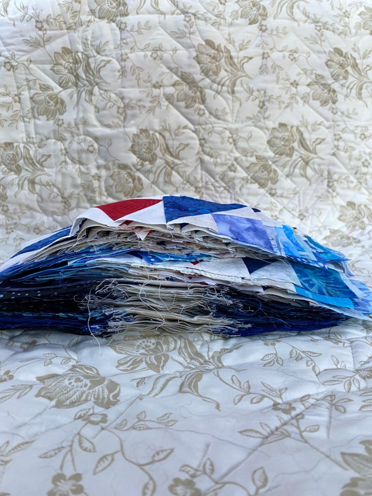 The Indigo Way top is progressing nicely. As I was laying out all the blocks, on point, I realized I was one short. I had a few extra pieces in my project box, but I sometimes make a few more, to switch out pieces that are a bit off. There were just enough to make the missing block. All the blocks are sewn together, I need to trim all the points off and add two inner solid borders (finished this faster than I did this post). Then the pieced outer border, light blue and red triangles, goes on.