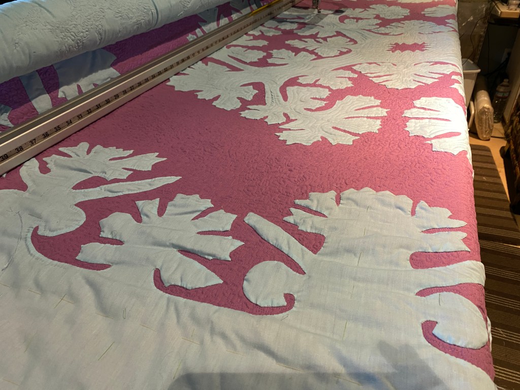 Yesterday I spent a few hours on the Hawaiian quilt. I am becoming a stipple master, it’s mesmerizing at times. Lots of texture is being developed here. I really want to finish this and get it off my frame, lots of other projects are calling to me. Sometimes the ease of a simple digital panto graph can be equally satisfying.