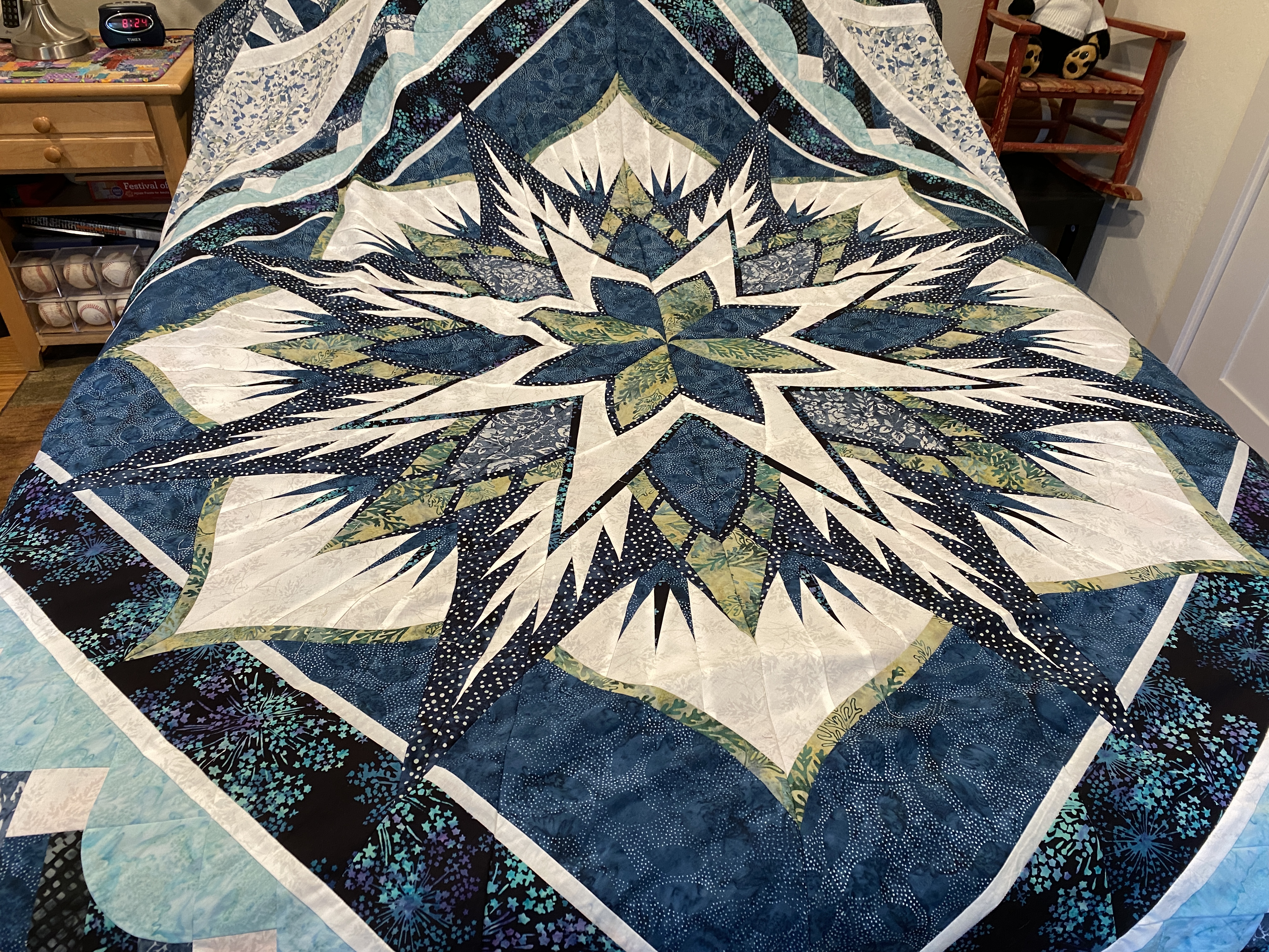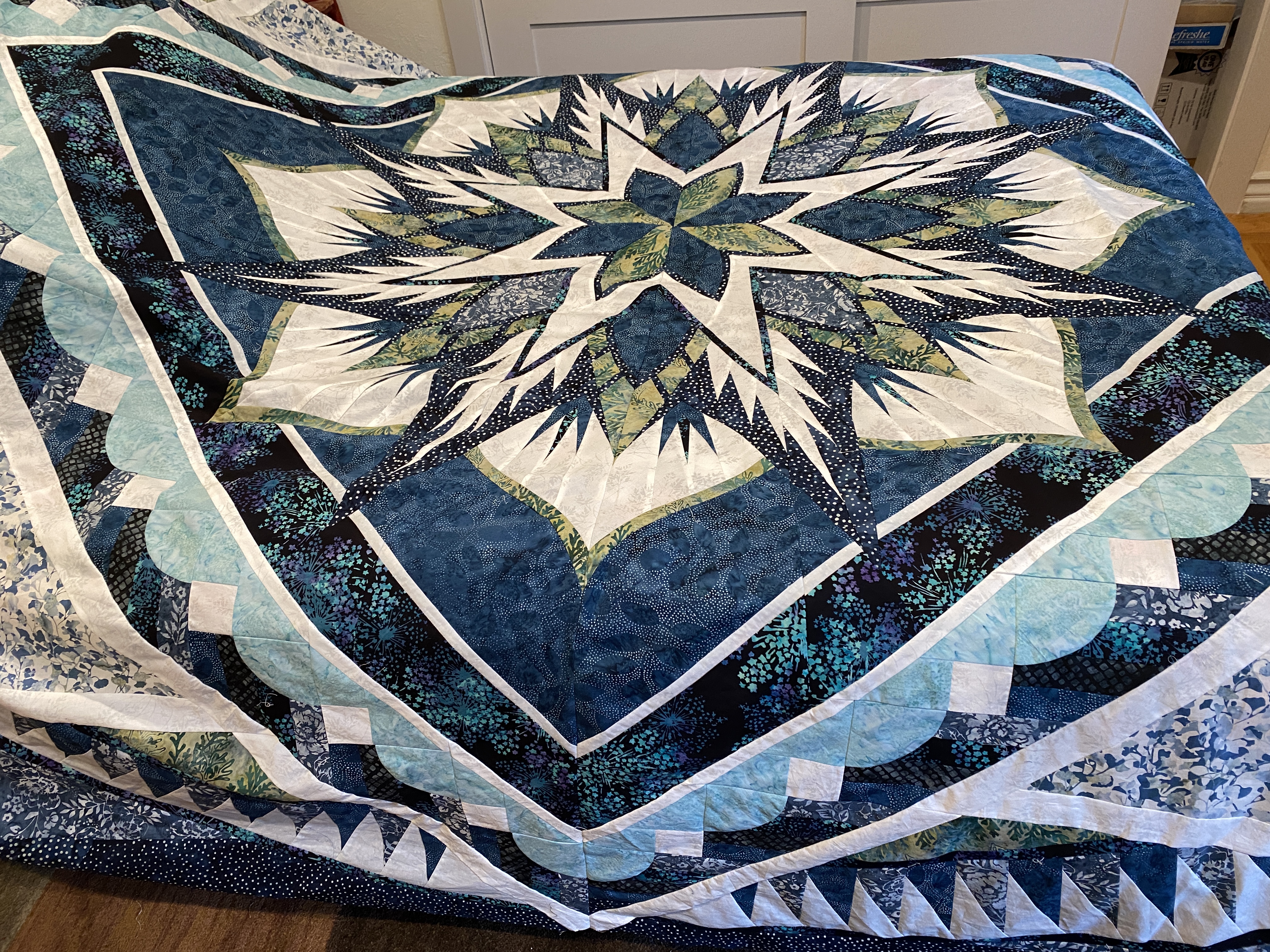 I have been away for a few days, but I’m back and itching to start a few new things and finish some others. Before I left, I finished piecing the Swordfish top. Very happy to have that done and in the TBQ pile. Cleaning up after the final de-papering was not as fulfilling as completing the top, but it got done. All the scraps have been put into stash, the empty bags stored with all the other ones and the room got a fairly thorough vacuuming/hoovering. I like the word Hoover so much more than vacuum, as in “I’m just going to hoover the rugs”. I don’t have Hoover brand machines, “I’m Miele-ing the carpet now” doesn’t roll off the tongue as well. Anyway, there were a lot of tiny little scraps of paper and bits of fabric in all the corners and spaces under my sewing table and chair. Now those areas are cleaned and dust free, for a while anyway.