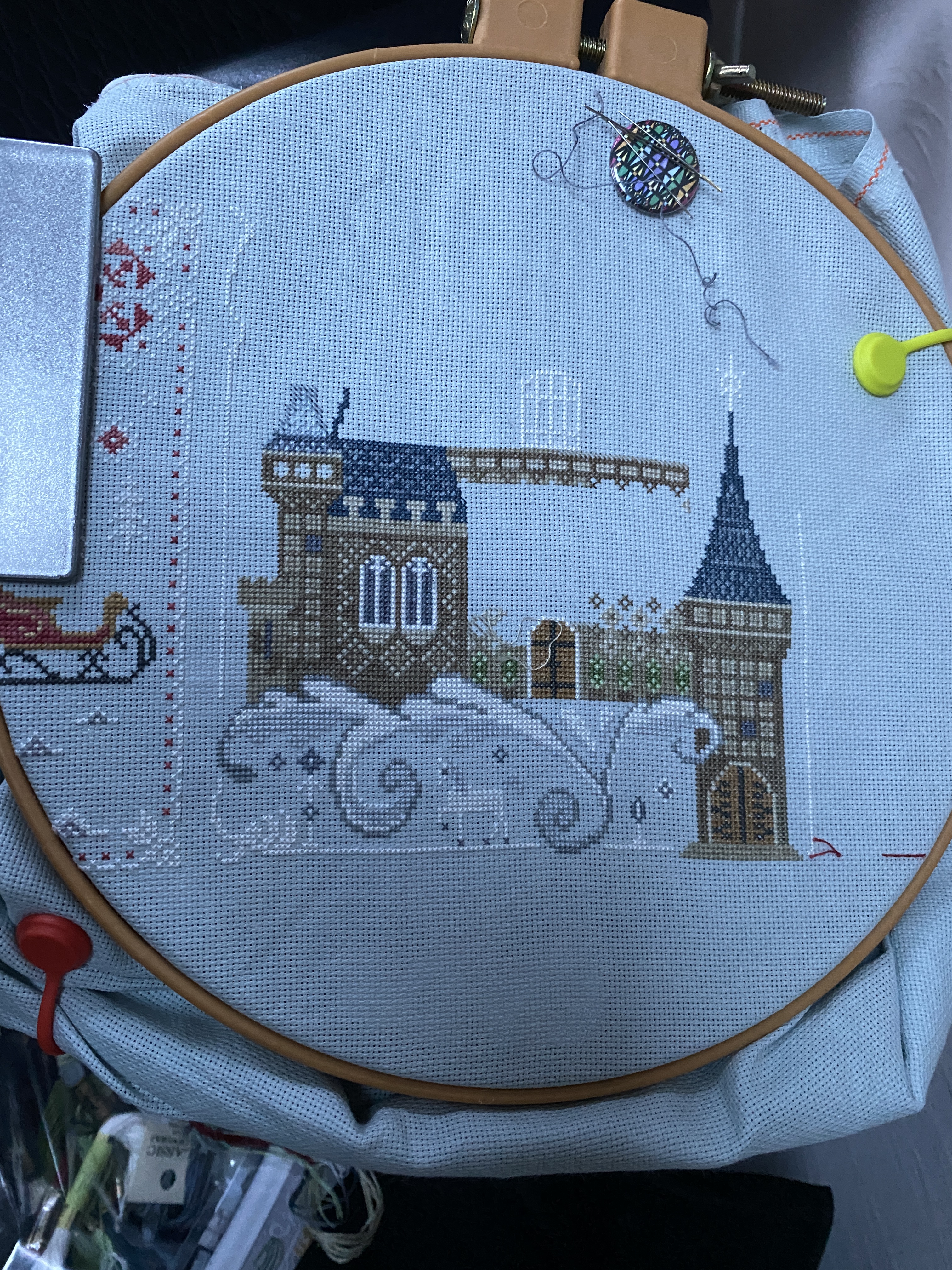 I did not bring any handwork on my little vacation, very odd for me, but I was one two very full plane rides and didn’t have much down time. I did miss a few days of the Tiny hearts stitching, I am almost caught up, need to stitch yesterdays and todays hearts. The large one, has a bullion stitch border around it that is being saved for last. Meg Hawkey’s plan, but it think its prudent, so that the stitches won’t get crushed by the hoop when we finish up the last hearts. The Castle is being built, block by block, and the roof is going on. The patterns on the roofs are repetitive and only two colors, which makes them fairly easy to work. I am hoping to have this finished be the end of the month. Then it’s on to the greenhouse, the next house in the set is called Cottage, only the colors have been released. Speaking of new releases, Nashville Market is also at the beginning of March, lots of tempting new charts and projects. I have had the “Beach Comber” chart by Lindy stitches in my cart for a while. I think it is charming, might stitch it up for my sisters beach house.