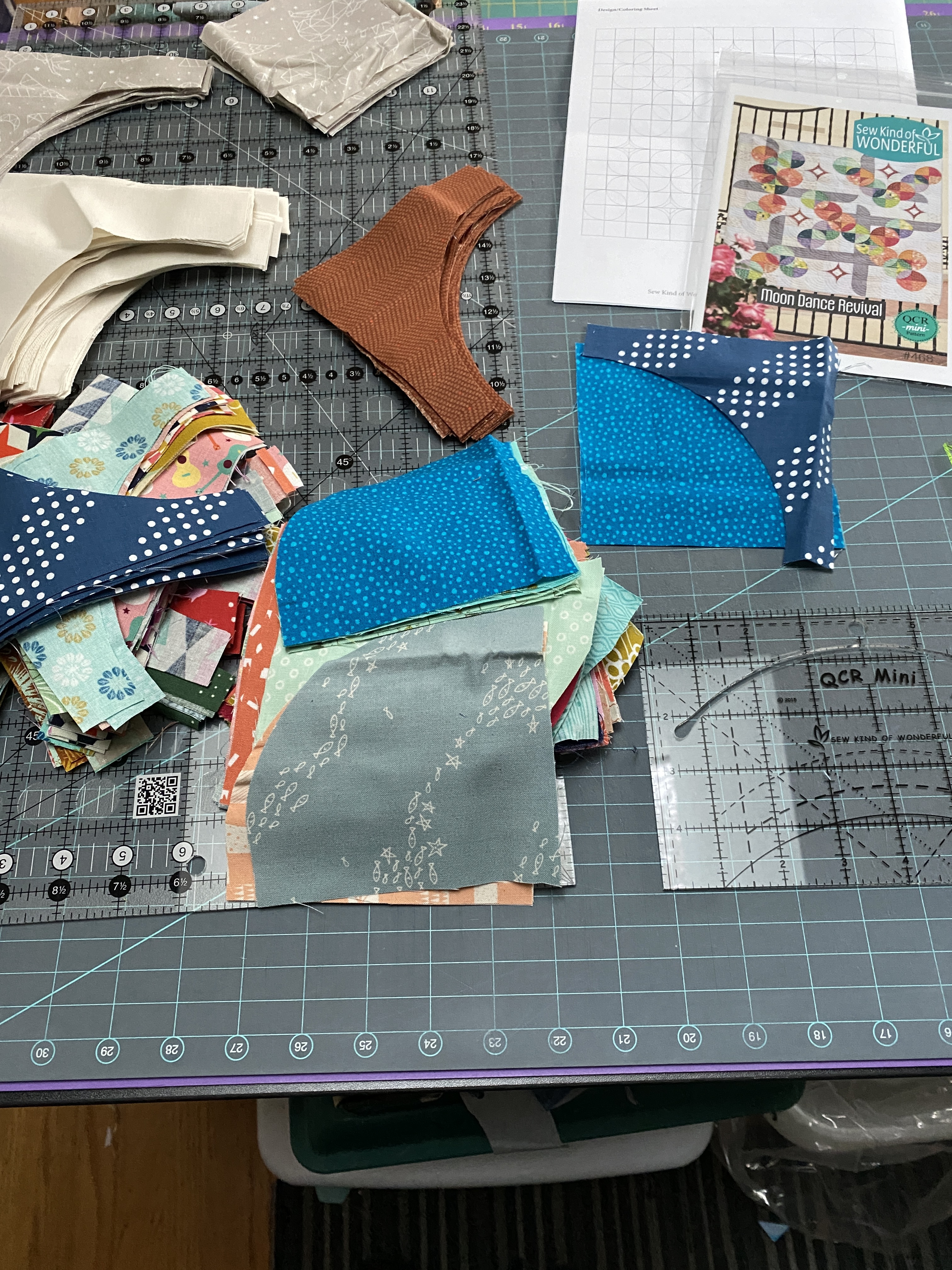 Since I finished the Forest, I started on another quilt that has been in the queue for a few months. The Moondance revival pattern is from Sew Kind of Wonderful and uses the quick curve mini ruler to cut all the drunkards path bocks. I got everything cut over the past two days, now comes the fun part, curve piecing all the blocks. The blocks finish at 4 inches square, so there will be more cutting and squaring.