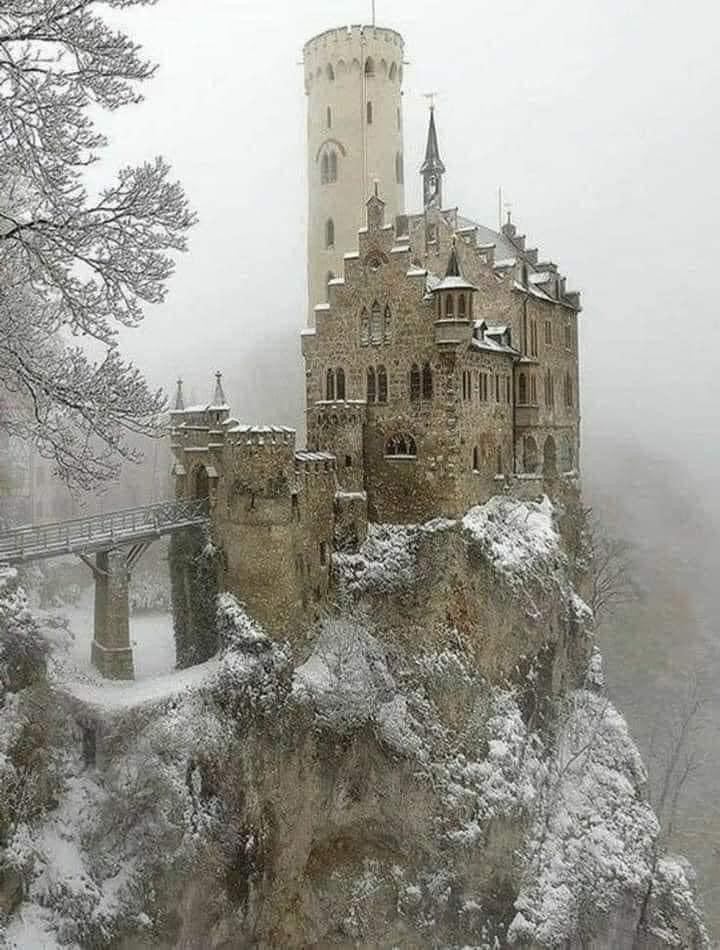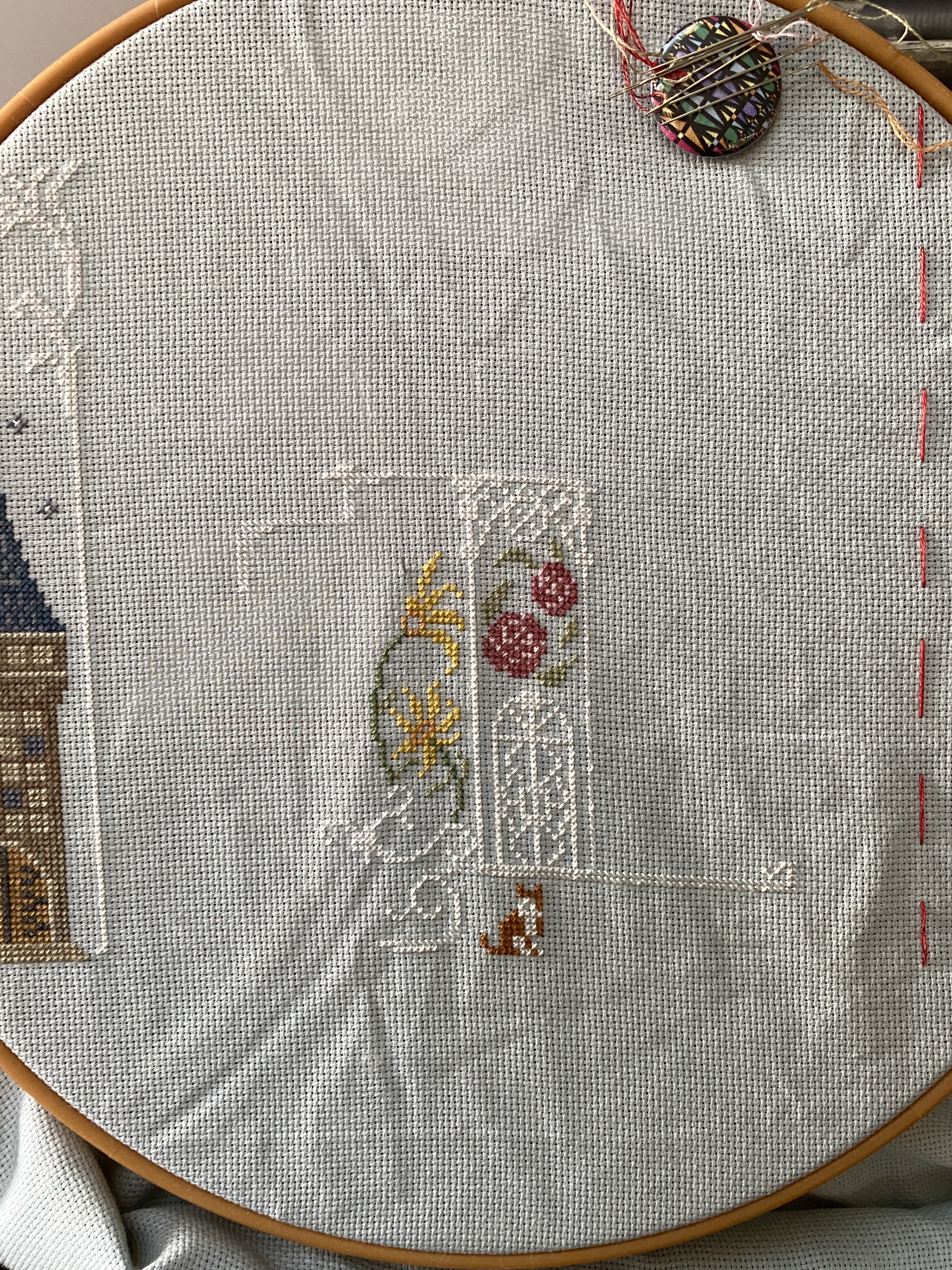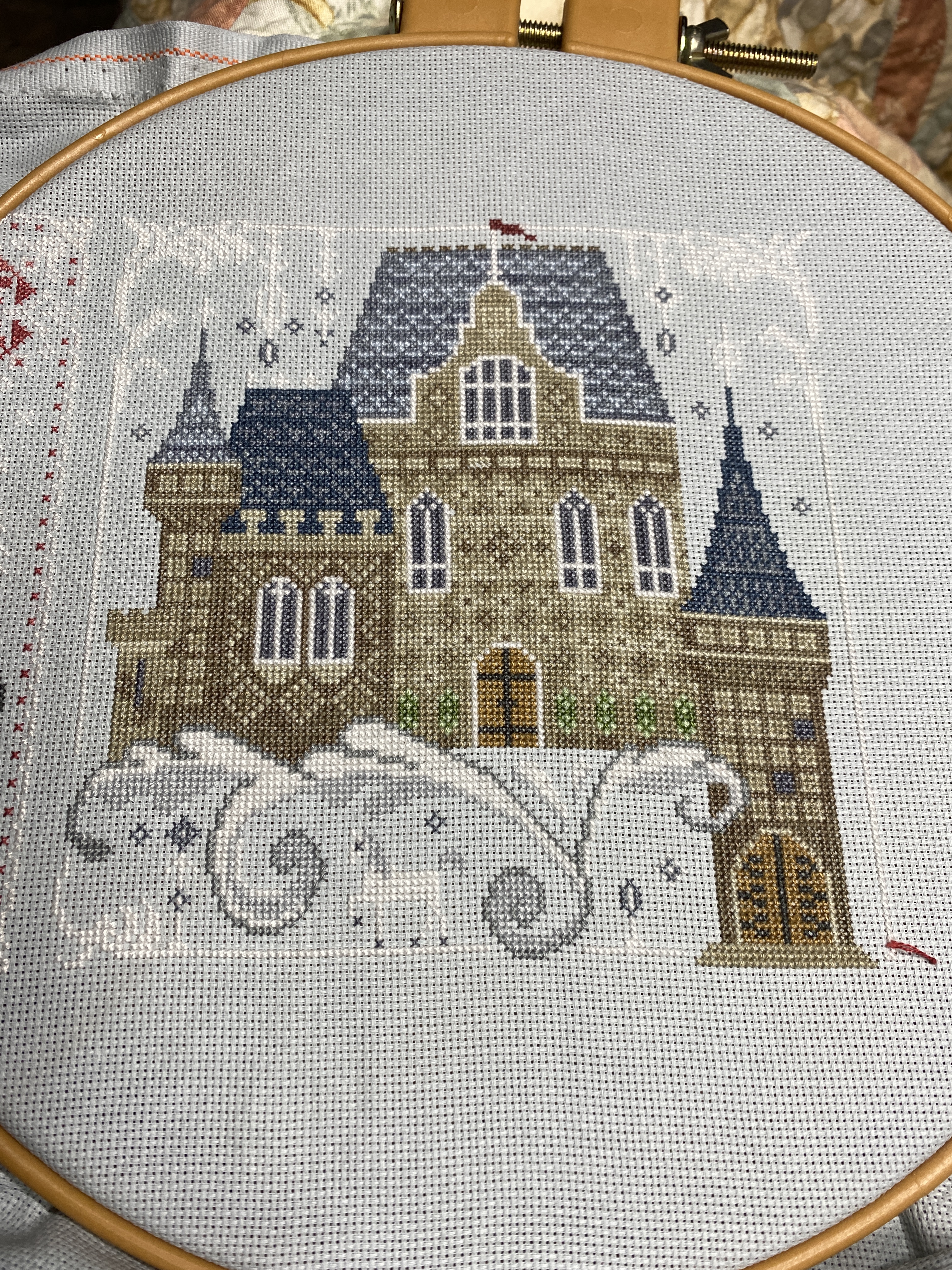 Almost two weeks have gone by since my last post, I have a finish and some progress. My Castle is built, stitch by stitch. I enjoyed finishing this one, it’s not a large piece, just dense. It is one of those stitchery pieces that look better if you step back from it. After a month of working on it under the magnifier, seeing it as a whole makes me appreciate the subtle color changes and patterning on the roof and bricks. I found this photo of the Liechtenstein Castle, and I think that there is a lot of similarities with the stitched castle. Next up is the greenhouse, lots of negative space and filigree swirls.