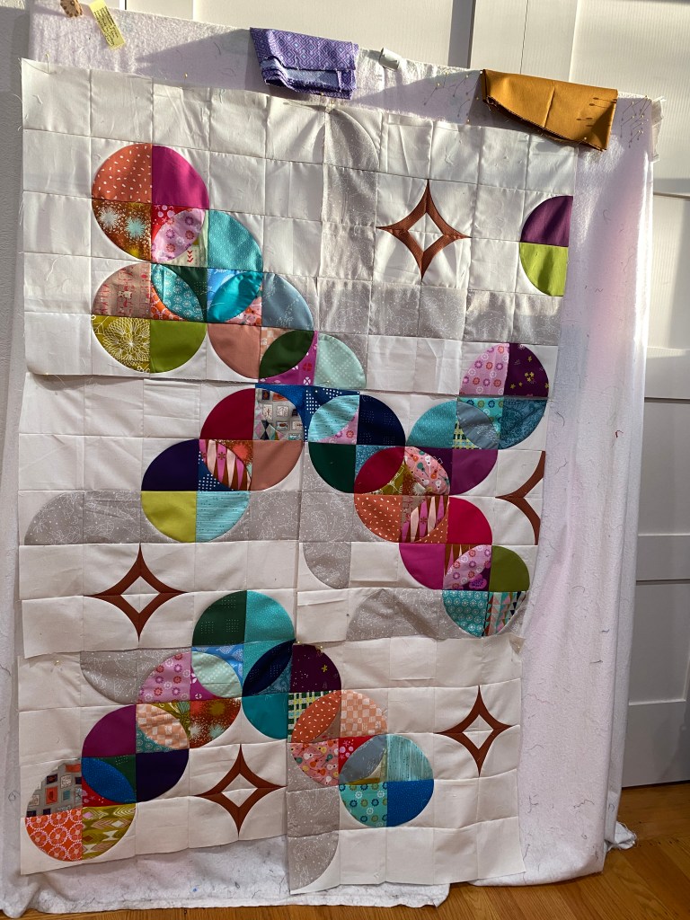 In the sewing room, I’m about 2/3rds done with the Moondance Revival top. I have been getting a block (5 x5) done each day. After cutting all the pieces and getting the sub-blocks sewn, this is the easy/fun part. The more it comes together, the better I like it. At first I was questioning my color choices, but I think it is working out. I also realized that I cut too many outer arc pieces. I am trying to think of a way to use them, possibly in an additional border. This week is shaping up to be busy, I’d like to get the Fancy Forest done, put Somerville back on and finish it, and maybe load the Swordfish top. Finishing the Moondance top would be good too. I would like to get started on finishing the Morning glory quilt blocks ⬇️ too. I need to have a paper removal session or two.