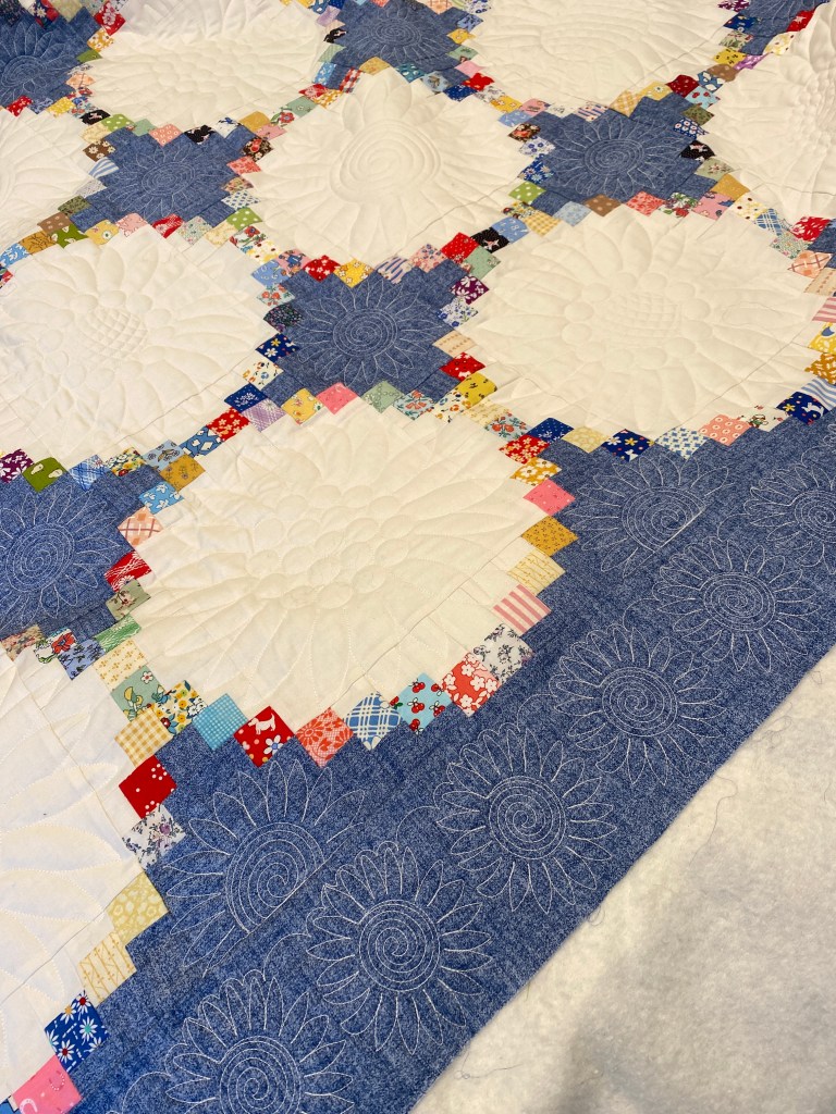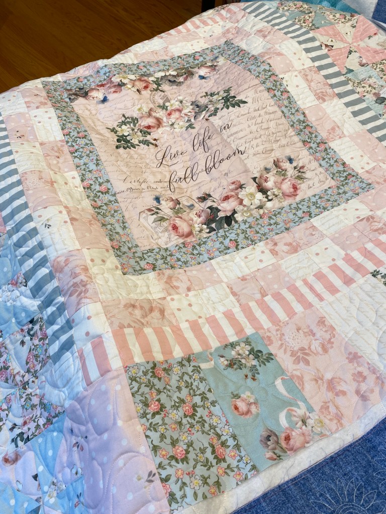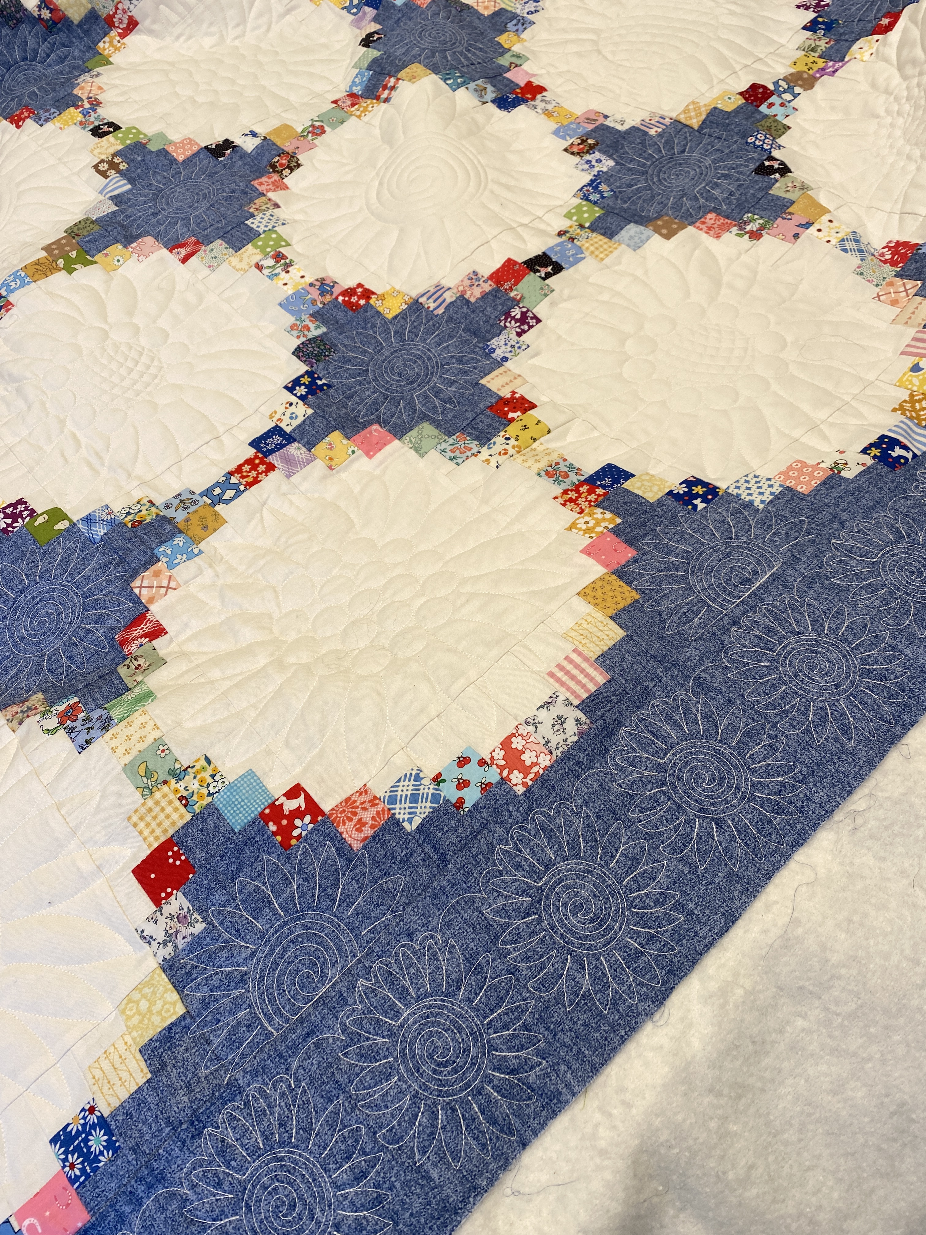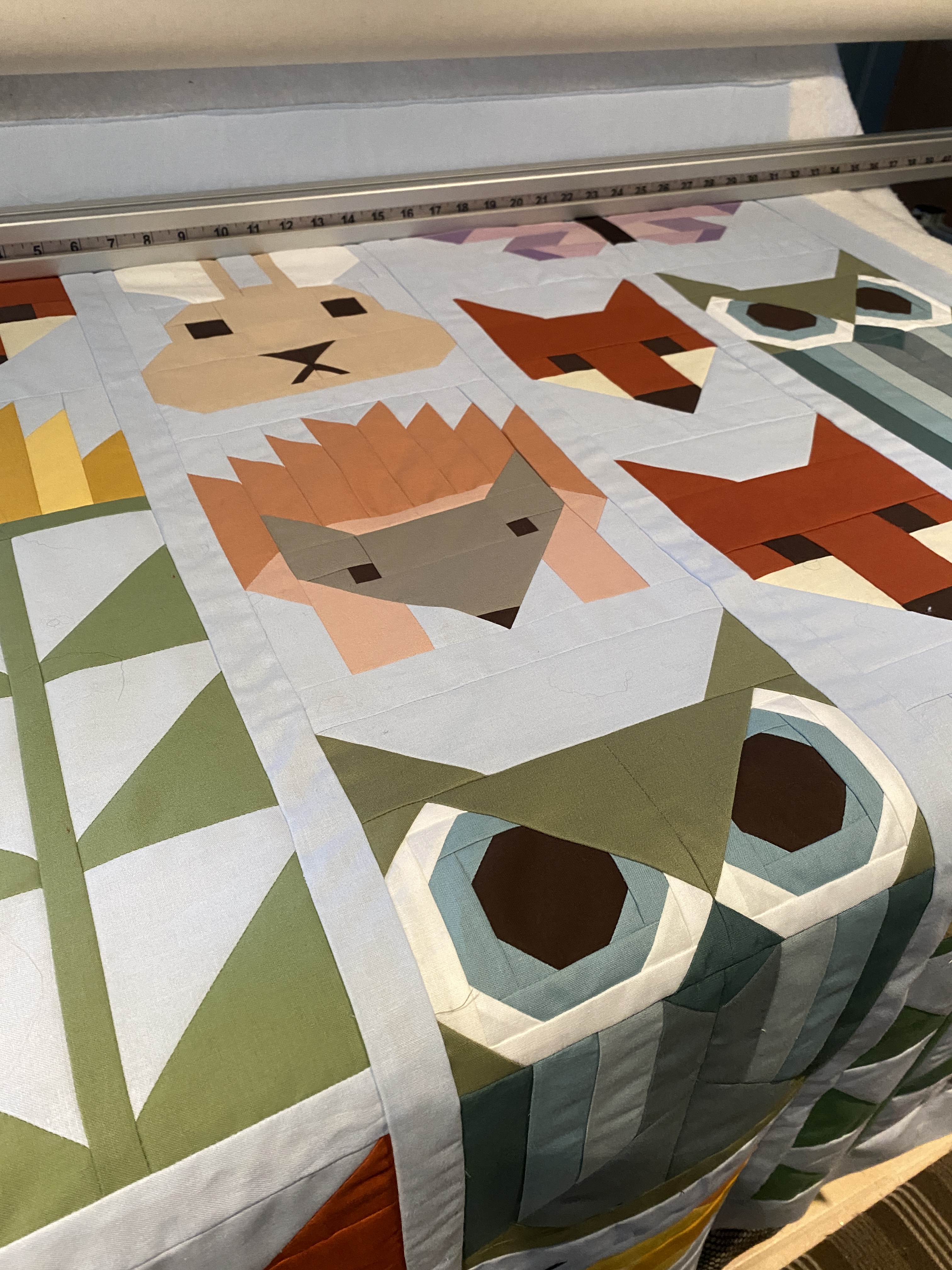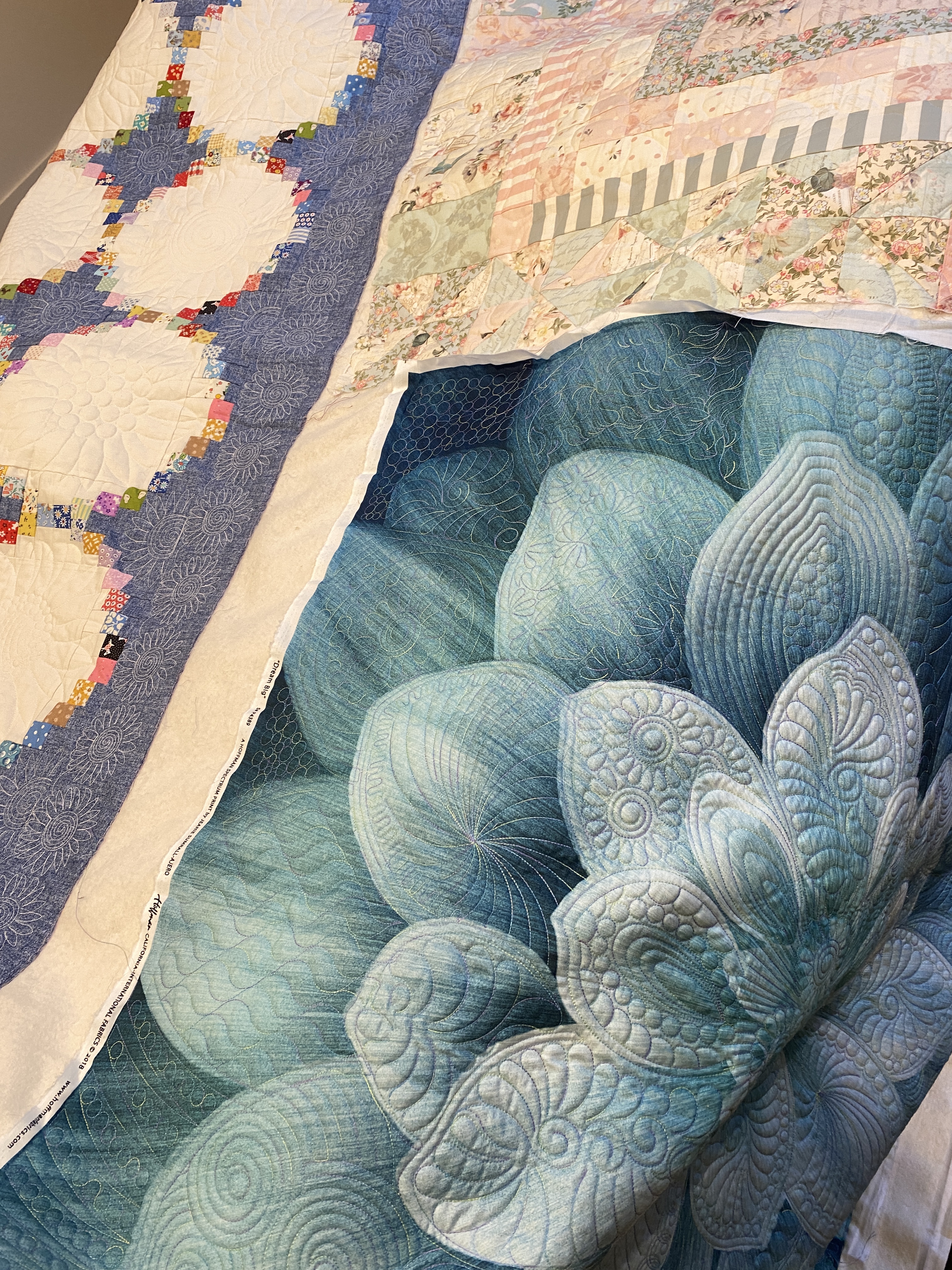 I worked on getting the Somerville circle quilt quilted. I chose a bunch of Sunflowers I had in my digital library, from Wasatch. There are five different ones and the smaller ones fit the borders. I had to take this quilt off the frame, to turn it to make the vertical into horizontal borders. This quilt is on the same backing as two others, the Big Dream dahlia and a un-named floral quilt. They add three more to the binding pile, I still have to bind the ‘Ribbon Runs Through It’ quilt, its so big, I have to psych myself up, and do some warmup exercises before tackling it. I also needed to get the Fancy forest on the frame, to quilt it up.