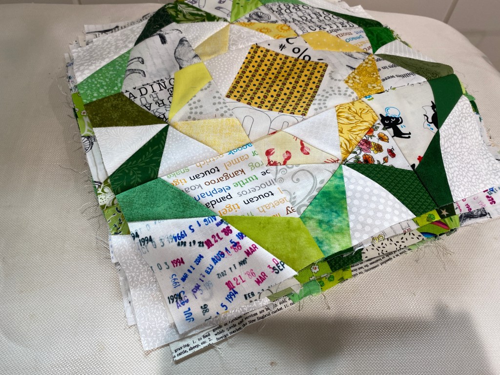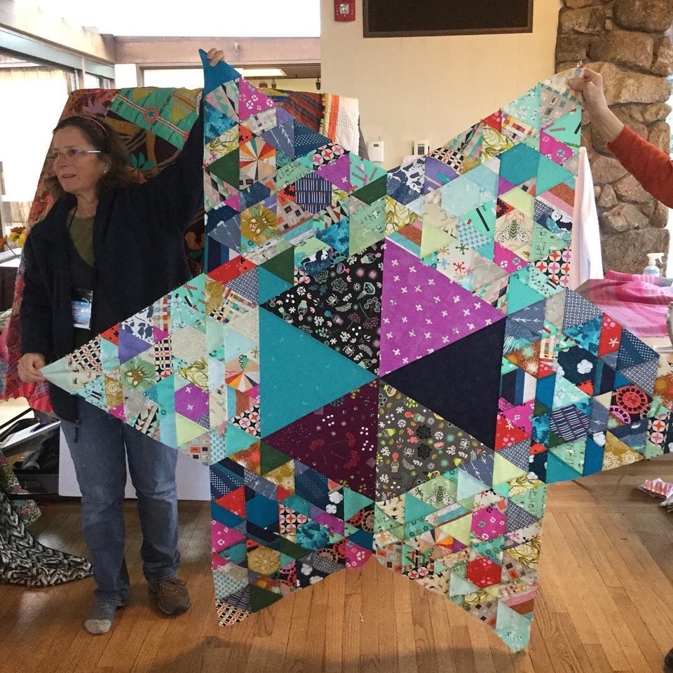 I am trying to decide what my next quilt project will be. After finishing the giant Swordfish, I sort of want to start the Jacqueline DeJonge quilt kit I have. Lots of paper foundation piecing, and curves with a rainbow of colors. I do have a few smaller kits in my stash, I “found” a few while searching for more neutral scraps for the Morning Glory quilt. I also want to get a quilt on the LA frame, maybe it is time for the quilt top that I put together at the 2018 Alsilomar retreat . This is also the quilt that spawned the scraps for the Moondance revival and the clamshell quilts. This photo was taken before I added the setting triangles.