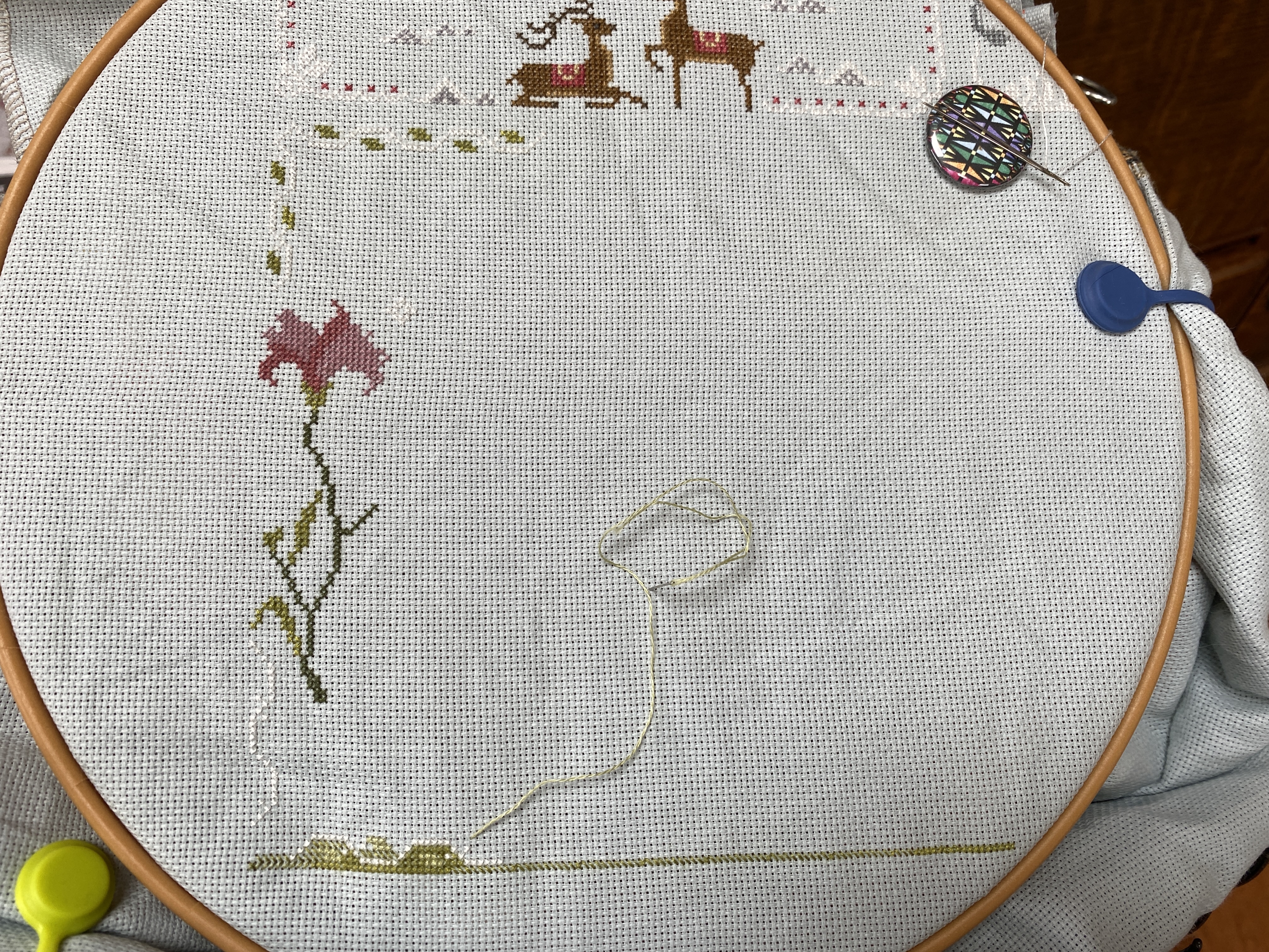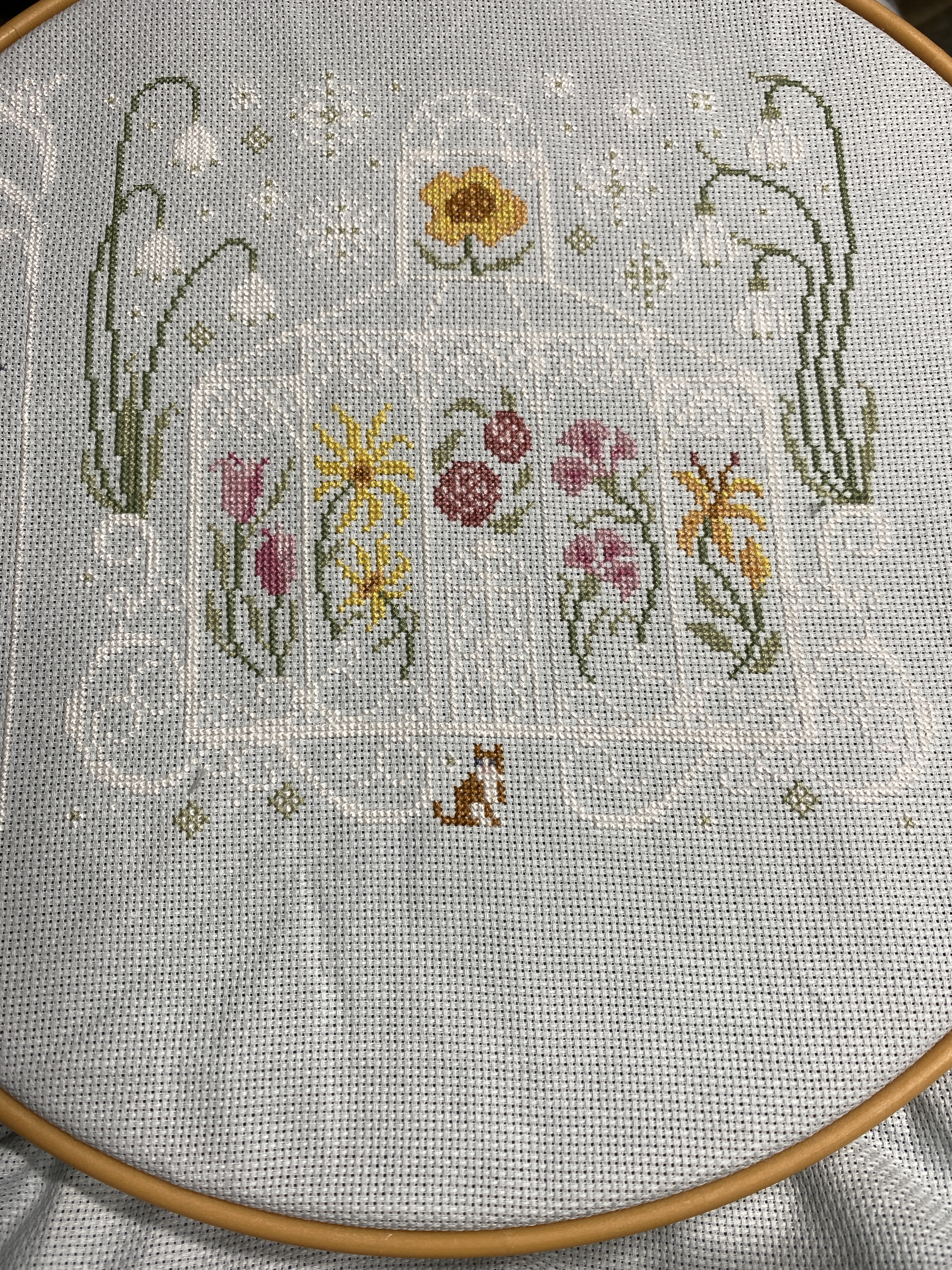 I finished the Green house from The Fabulous House series by Cottage Garden Samplings yesterday. Started it on 2/27/24, so about three weeks to stitch. These houses are about 120 stitches wide and long, on the 20 count Aida they measure about six inches square. This house wasn’t as densely stitched as the other two I have done, but I feel like it took as long to stitch due to all the counting. I did have to un-stitch a few times, and if you notice, the cat isn’t centered. I figure no cat would ever sit where it is put, so mine is a typical cat.