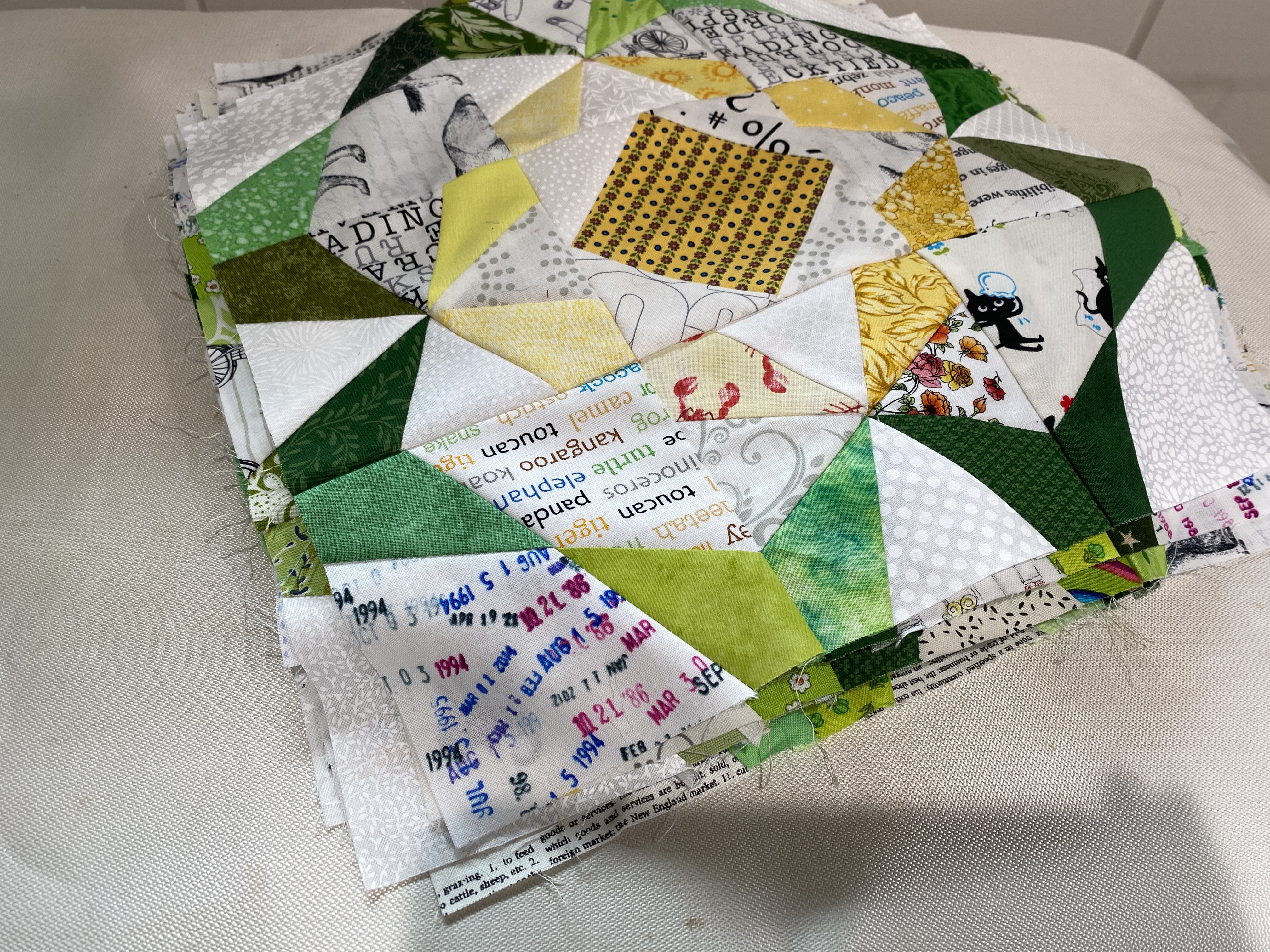 On the piecing front, Morning Glory was stalled a bit when I realized I only had half of the green and white sub-blocks made. I have been sewing the 47 more I need to finish this top assembly. I de-papered them yesterday, and after some pressing today, I will have the blocks complete. Hopefully Saturday will be a day for sewing the top together. The clamshell quilt took a back seat to the Morning Glory, as I needed to cut a bunch more greens and neutrals. Needless to say, the sewing studio is a wreak. I also want to get the binding done on the Almost Yellow Brick road quilt.
