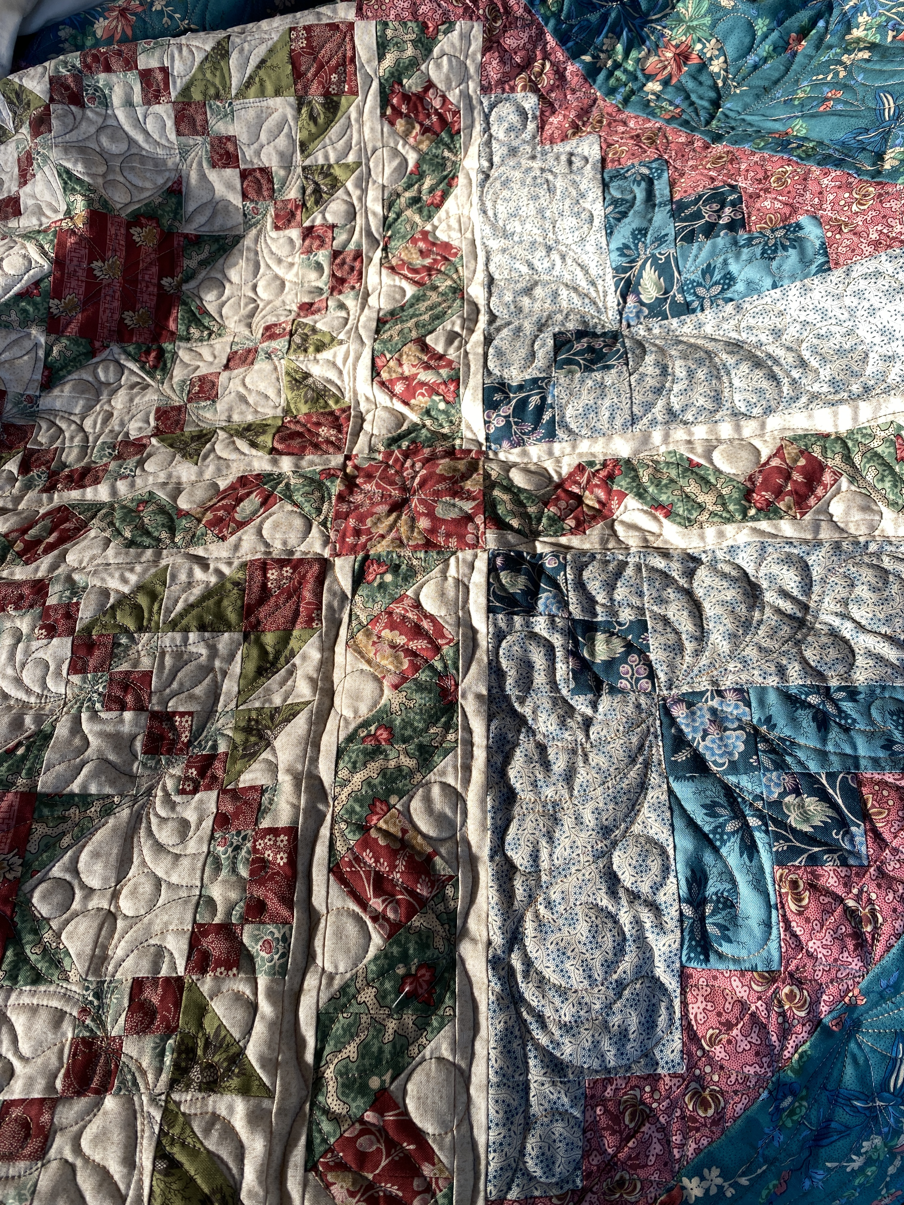 This past week I also got the binding on the ‘Ribbon Runs Through it’ quilt and it is now on my bed. Plus I got the Morning Glories quilt on the frame and stitched out a row of leafy vines on it.