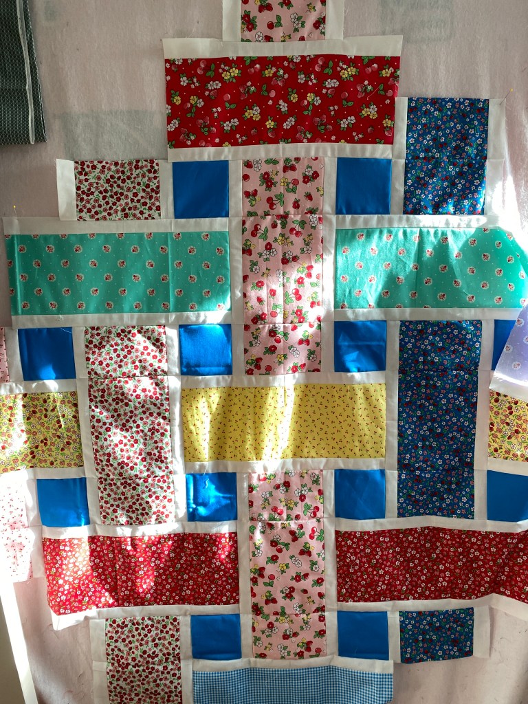 On the design wall, I took down the scales quilt pieces. I want to rework it with some solids in it to increase the size. Doing so would have required me to pull the pieces down to rearrange them anyway, plus the dog was doing his best to scramble them too. In a box they went, they’ll be back, maybe in the summer. I was left with another box of scraps of another fabric line, Strawberry fizz. I had bought these from Craftsy when they were liquidating their fabrics, two rolls of 1/4 yard cuts. I wanted to make a Tessa Quilt from Kitchen Table Quilting after the Picnic one (Busy Hands Quilts) one I made last year. It took me about an hour to find the digital pattern, as I couldn’t remember the name of it. I didn’t have enough scraps to make a throw size quilt , so I made the baby size. There is some waste when one squares these quilts up, and lots of extra white bordered pieces due to strip piecing and cutting. The top is put together on the diagonal and then trimmed. I still had plenty of fabric left to make another top. I got out the “Just Two Charm Pack Quilts” book (PDF) from Meadow Mist Designs and chose the “Morning flower patch” quilt. Just 400 – 2 ½” blocks and I could use the extra 1 ½” white strip I had from the Tessa quilt scraps. I also remembered to use the Accuquilt Go to cut all those squares. Six passes through with the strip cutting die, and they were done. I spent the day yesterday sewing the nine patches and the cross sections. I may get the 58″ x 70″ top together later today. This is the same book that I used to participate in the quilt a long last month. You can see all the quilts in the quilt parade Cheryl posted a few weeks ago. Lots of inspiration for scrappy quilts.