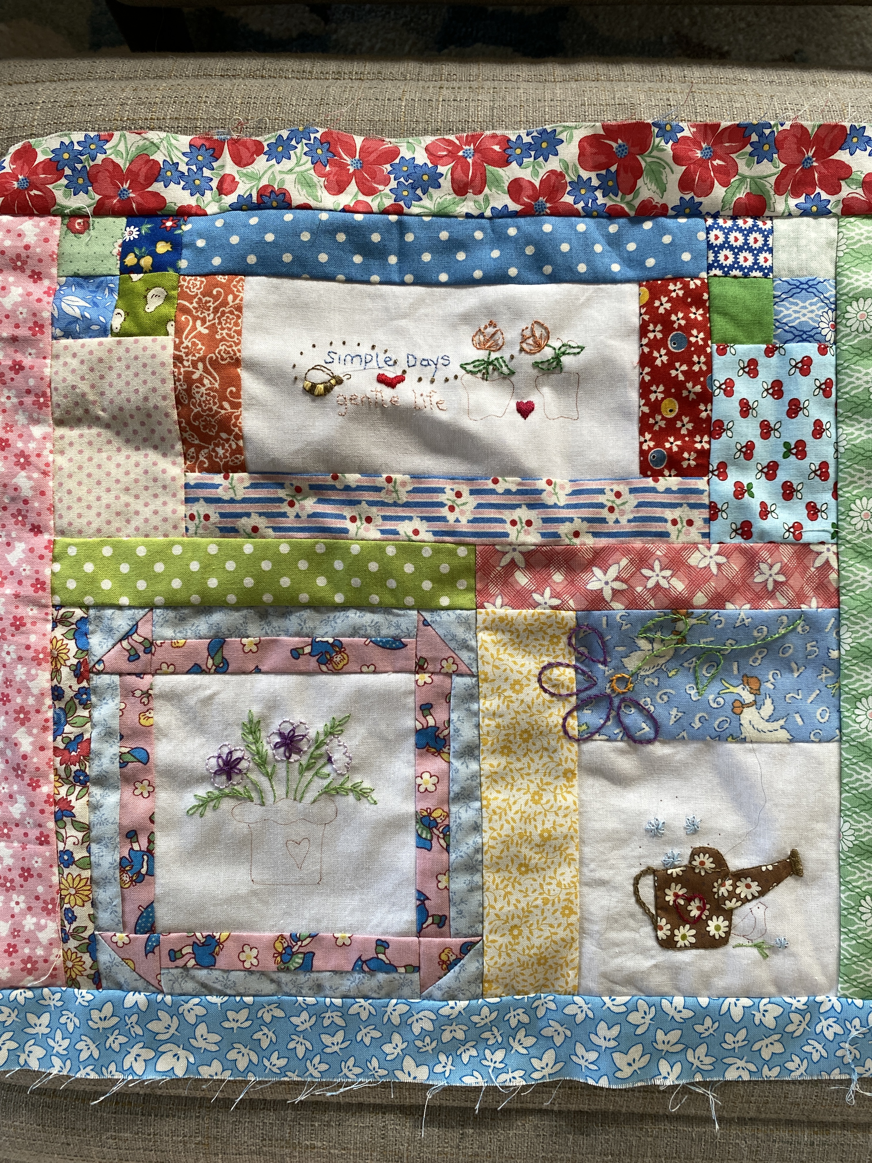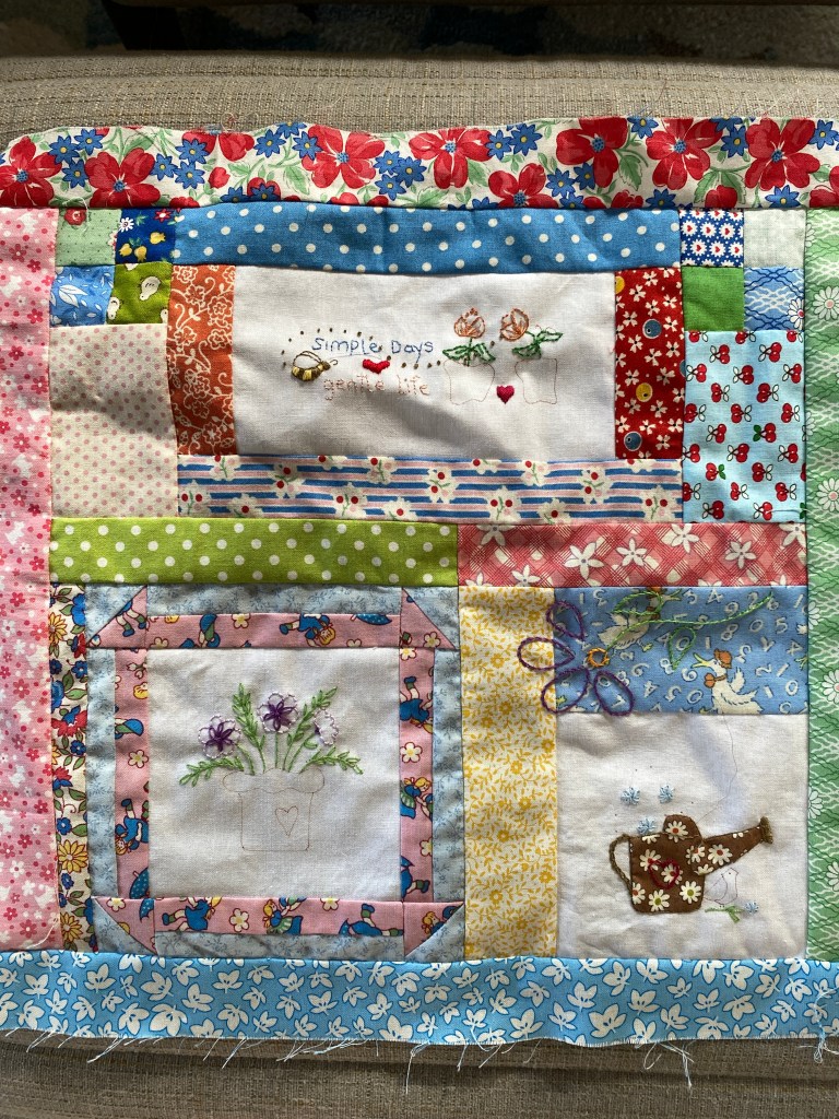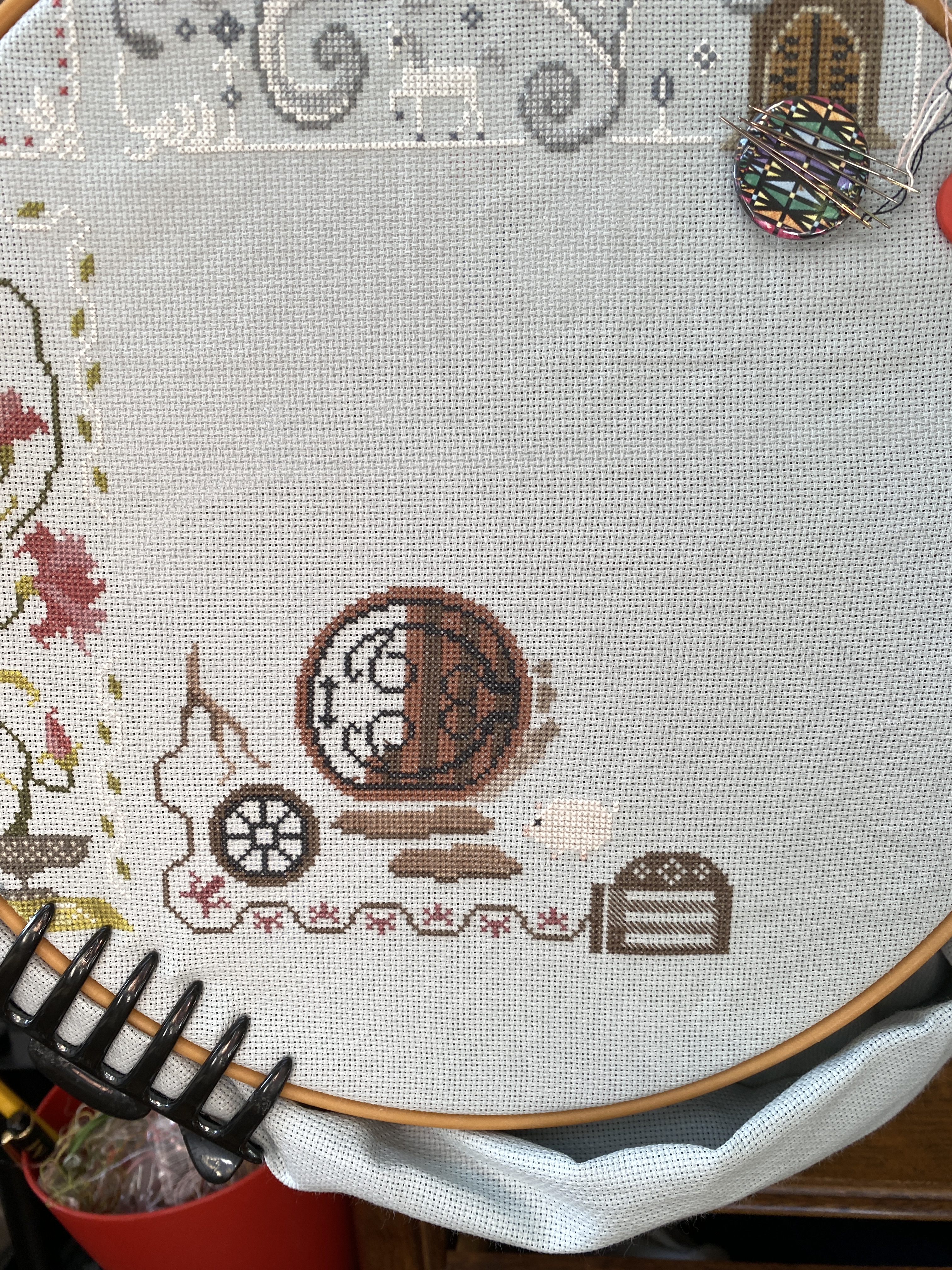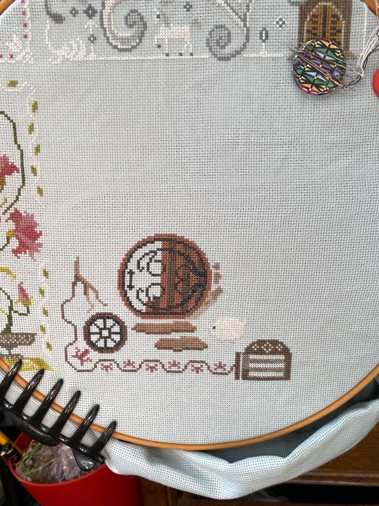 The Hobbit House is taking shape, the door at least. What I thought were sheep are actually pigs, very clean pigs. I can’t remember if Hobbits raised pigs or sheep, I kinda thought they were vegetarians. I didn’t work on it yesterday, instead I pulled out a Simple Days block and got most of the embroidery done on it. I hope to finish up the appliqué parts and the rest of the stitching tonight. Maybe while the Q24 stitches another row of strawberries on the Picnic quilt.