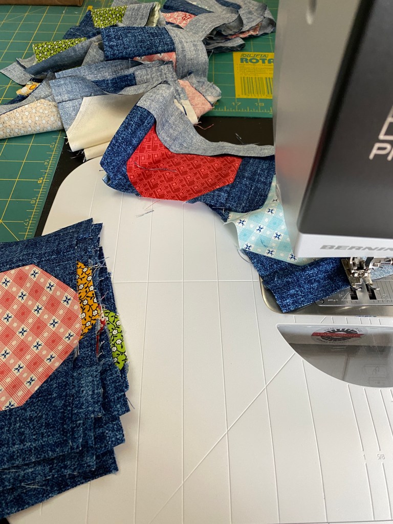 This week I finished up the five quilt tops from last weeks scrap using sessions. I started a new kit that I got a few months ago. It is from Connecting Threads, called Spot On. I got it all cut out and have started making the blocks. It is simple piecing and lots of assembly line sewing, make forty-two of everything. I like the fabric line, general store, it’s probably not readily available as it was a line from last year. It is sort of a 1930’s repro, but in more primary colors.