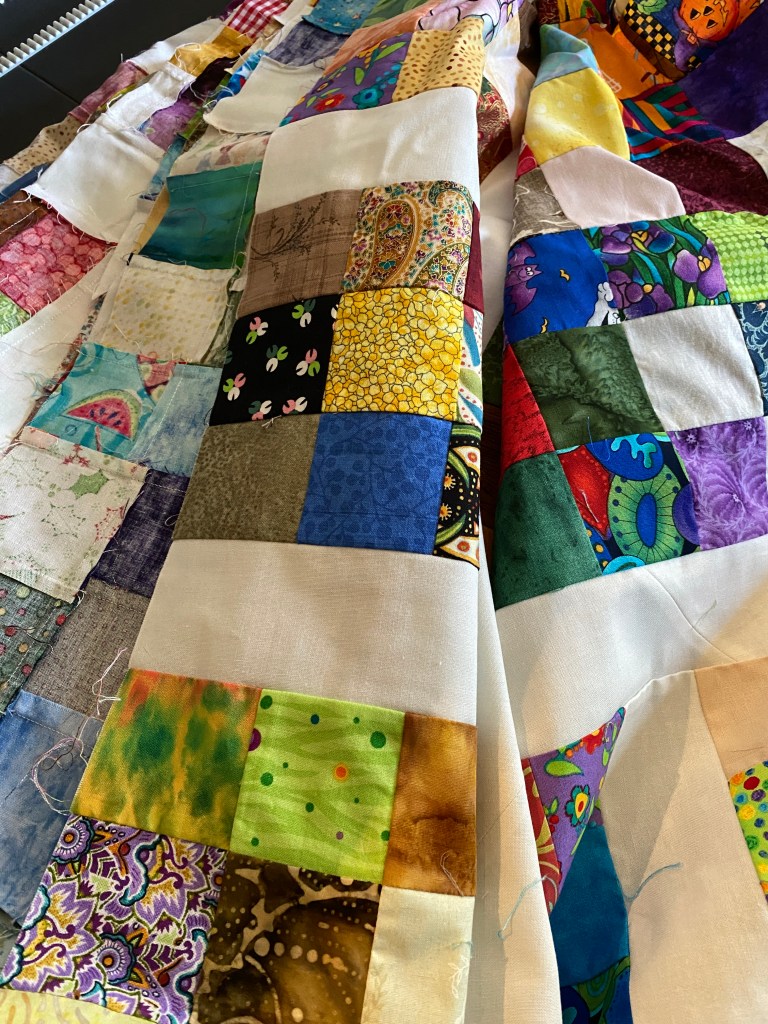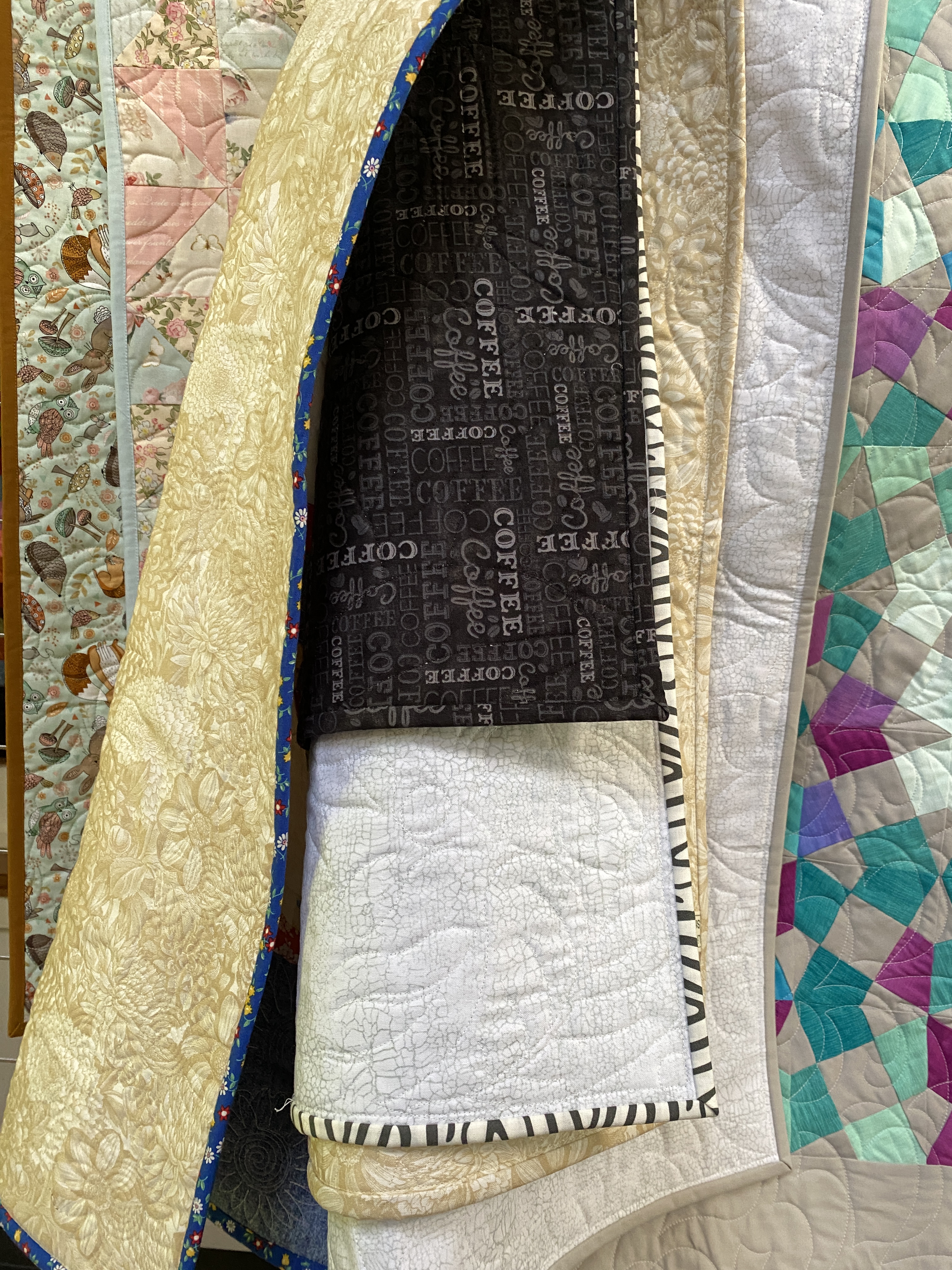 Todays “chore” is to get 6 quilts styled and photographed to post on Etsy. Yesterday I gathered them all up and steamed them to get fold lines out. Now I am just waiting for the sun to come out so I can get some good natural lighting, probably around 11am. I really should do these photo shoots more often, but during the winter good lighting is hard to come by. I try to get eight to ten shots of each, I have a list made by Quilty Love that I use as a guide. Still its easier to get them all out, set up the photo site and do them one at a time.